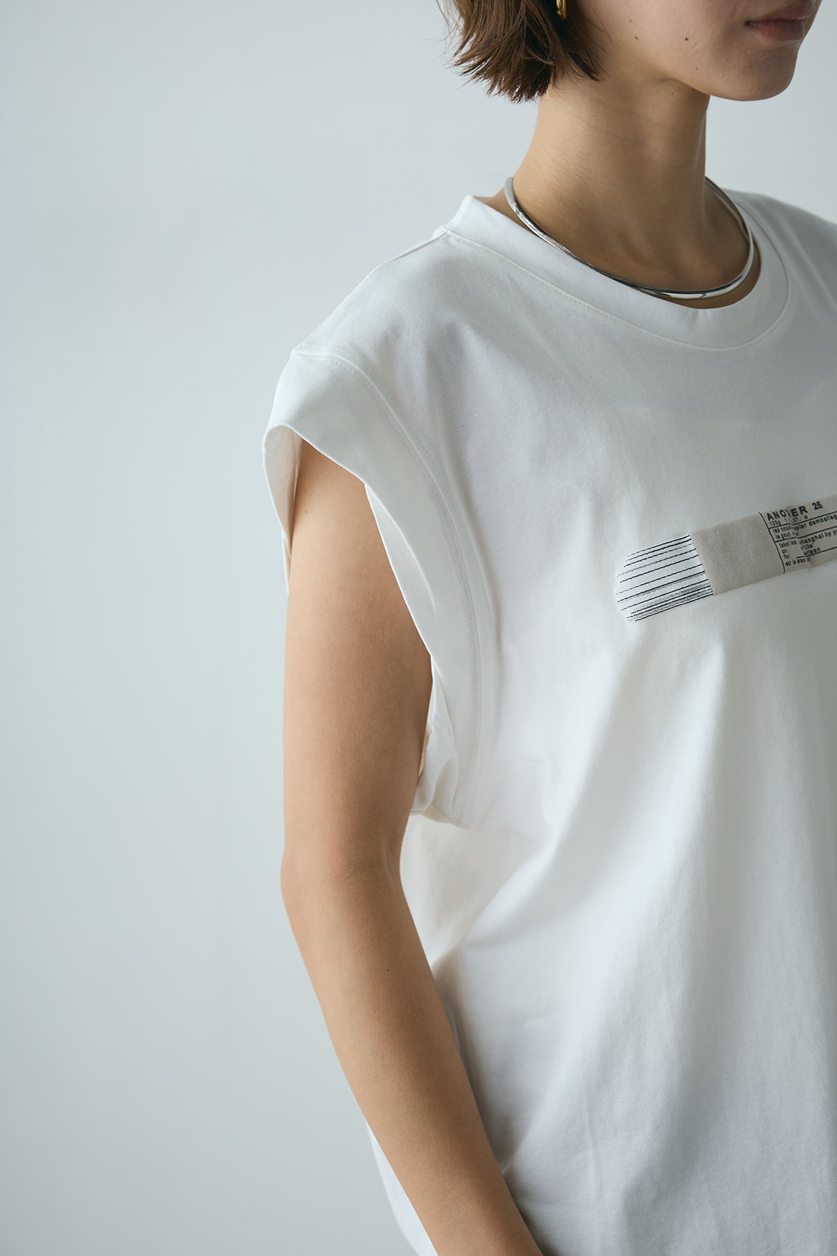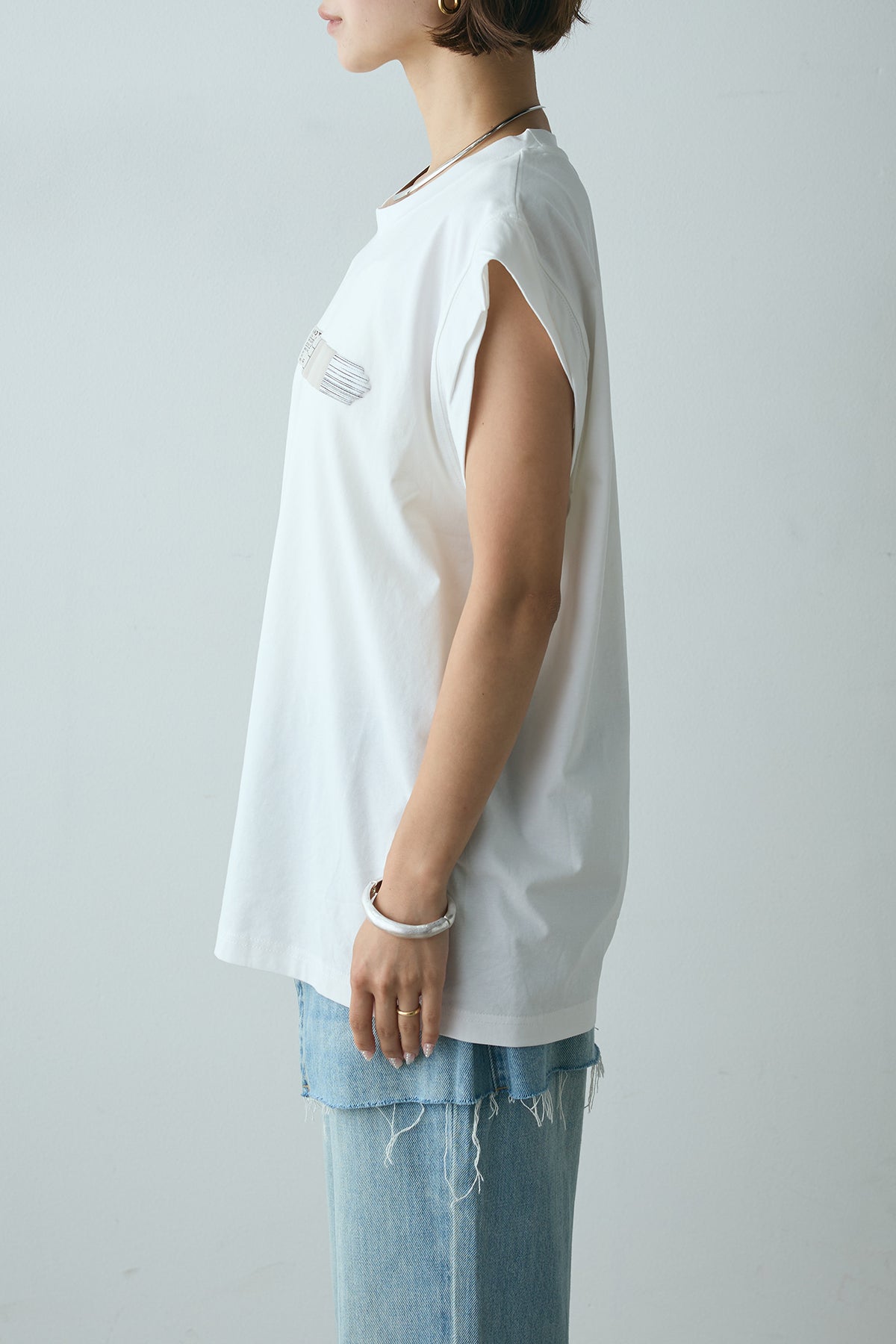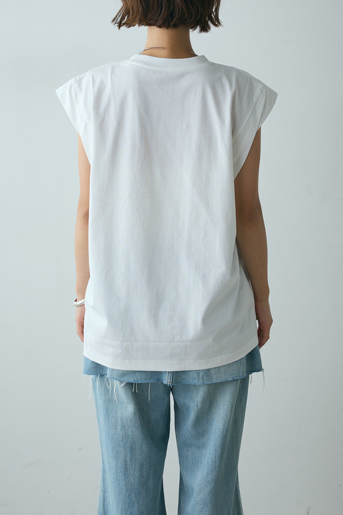 立体感のあるチュールフリルが印象的なノースリーブTシャツ。胸元に広がる華やかなフリルがコーディネートに程よいアクセントをプラスします。カジュアルながらも甘さを添えた、大人の遊び心ある1枚です。