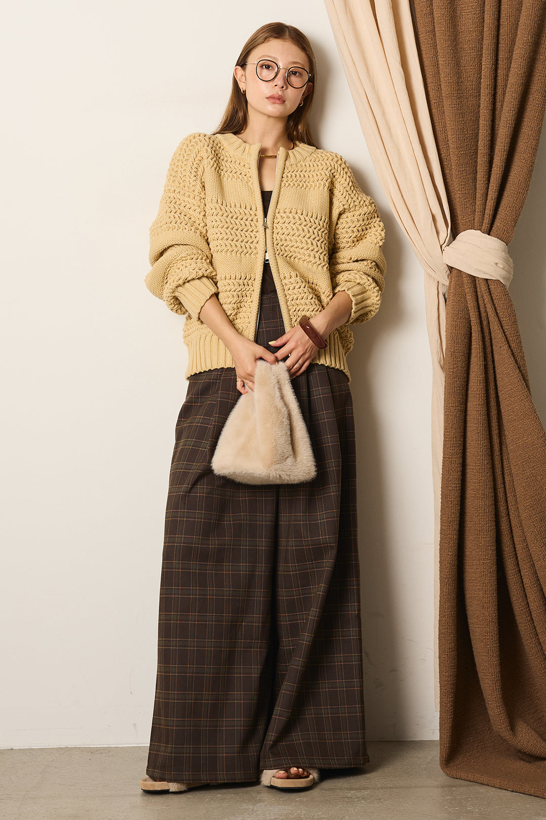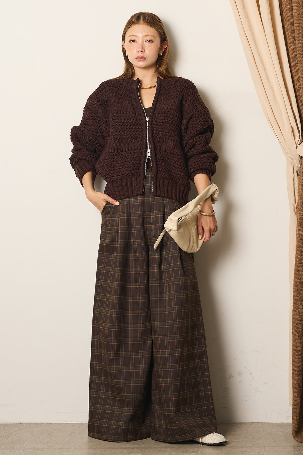 [SET]ライン編みダブルジップニットカーディガン+タータンチェック柄くすみワイドパンツ(2set)