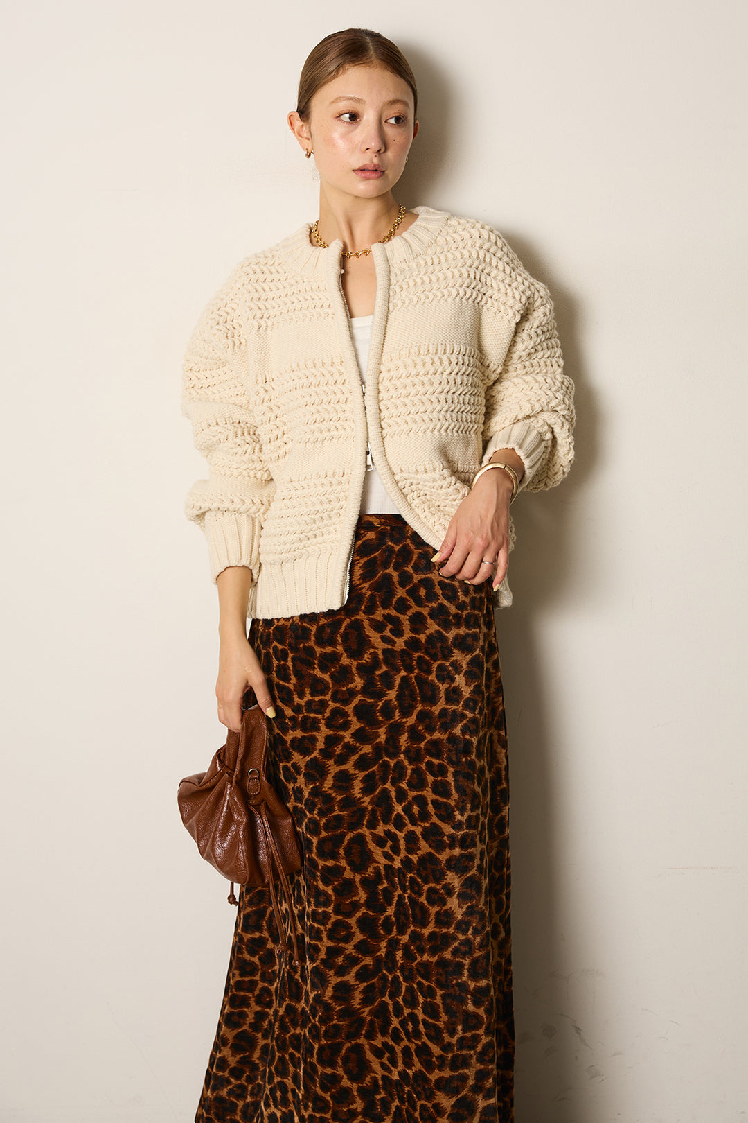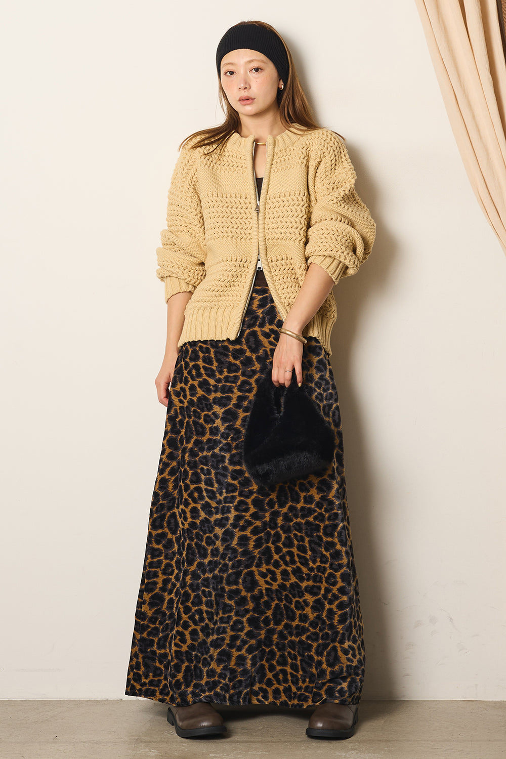 [SET]ライン編みダブルジップニットカーディガン+レオパード柄ワイドスカート(2set)