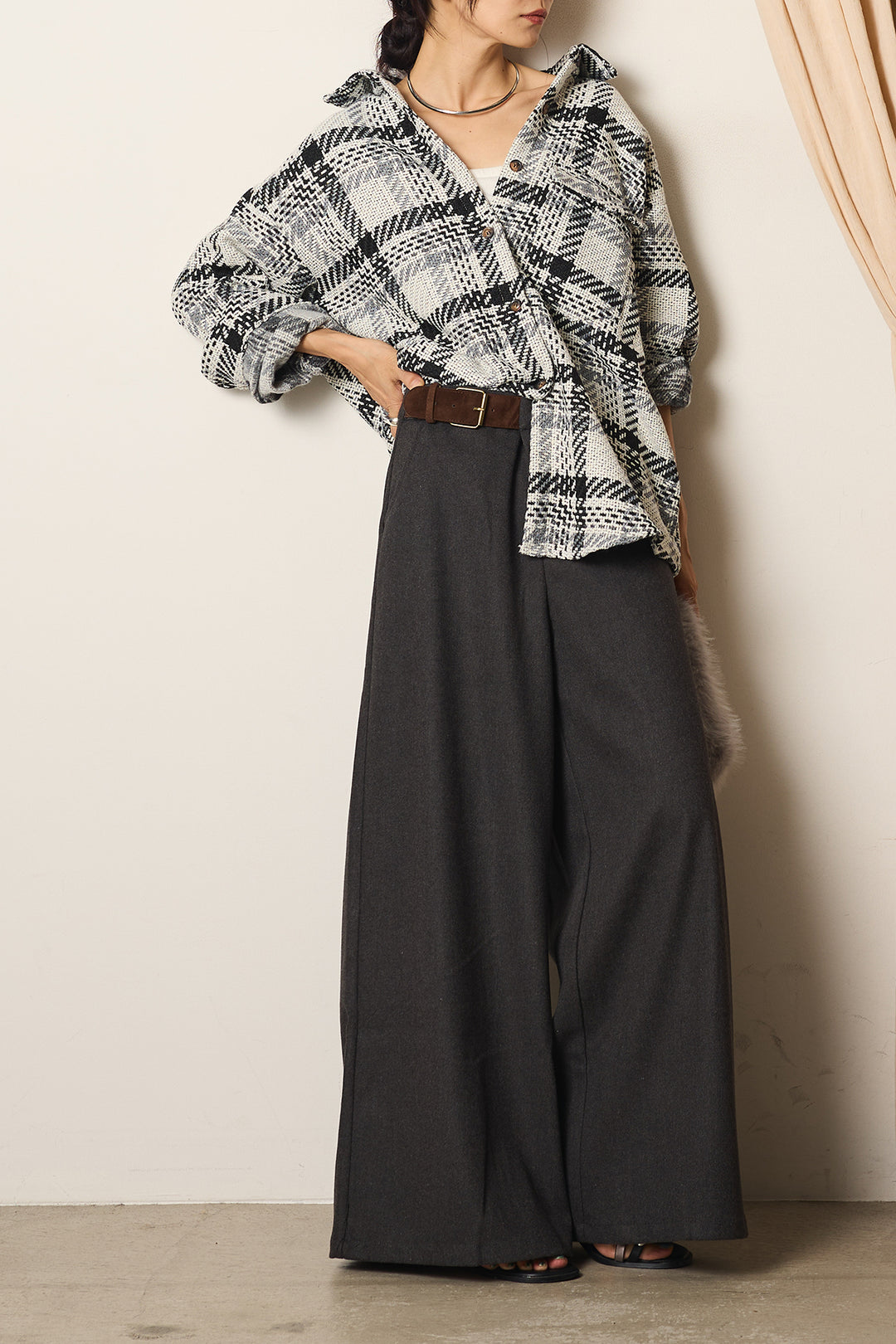 [SET]チェック柄ポケットツイードジャケット+フェイクレザーサイドベルトワイドパンツ(2set)