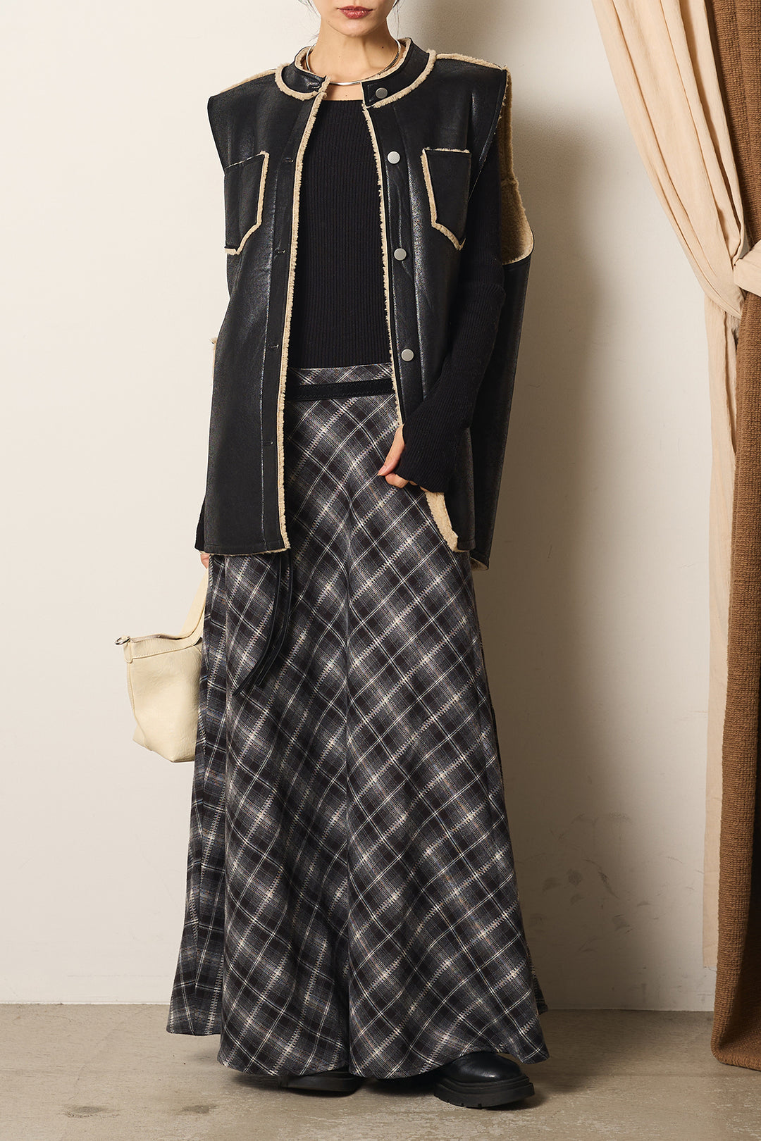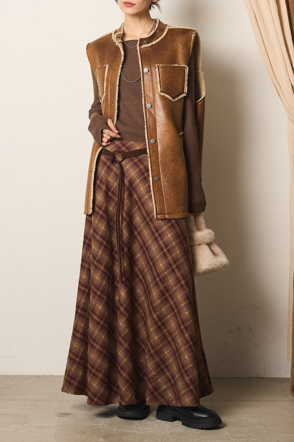 [SET]フェイクレザームートンベスト+ベルト付きタータンチェック柄スカート(2set)