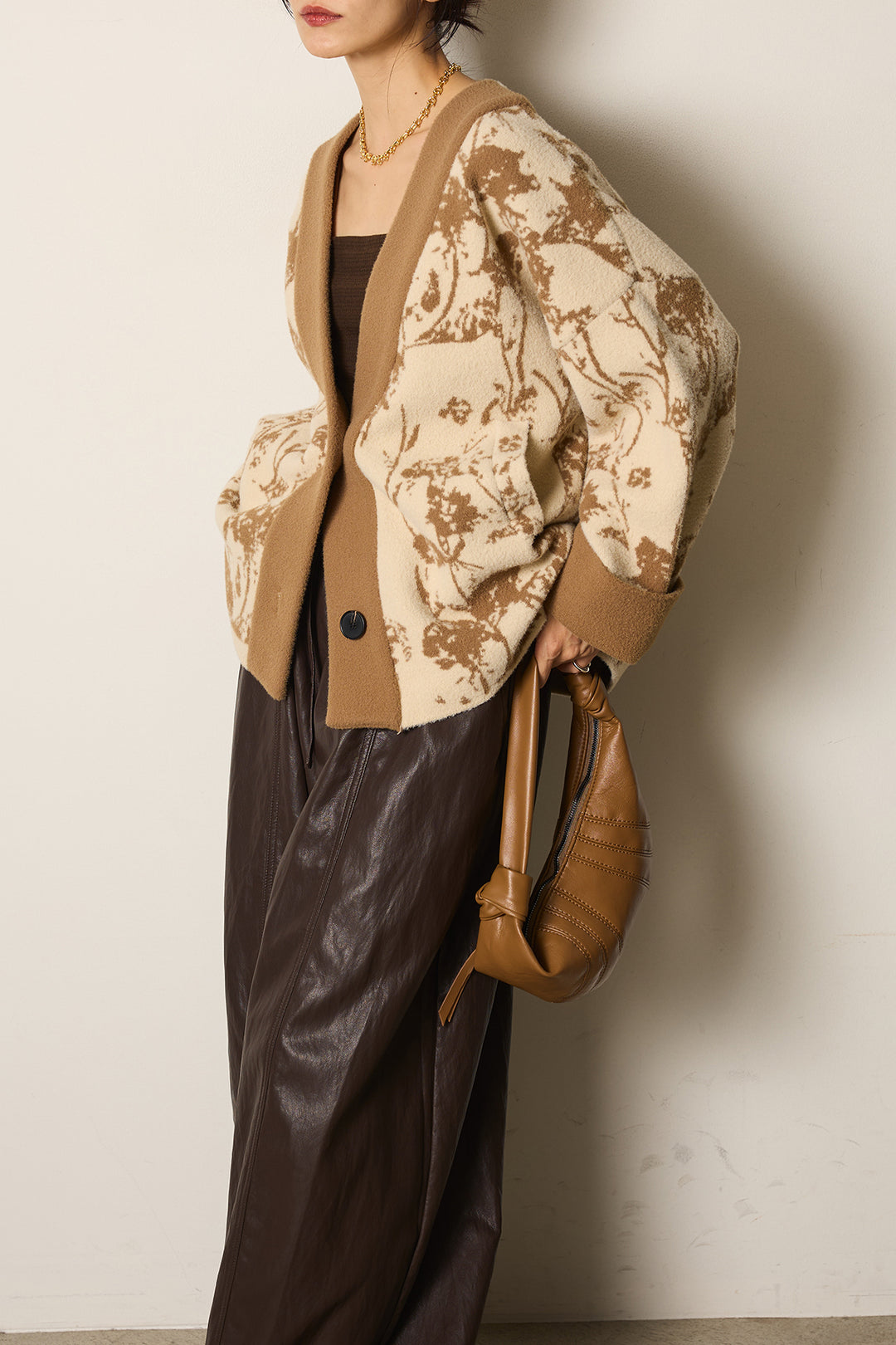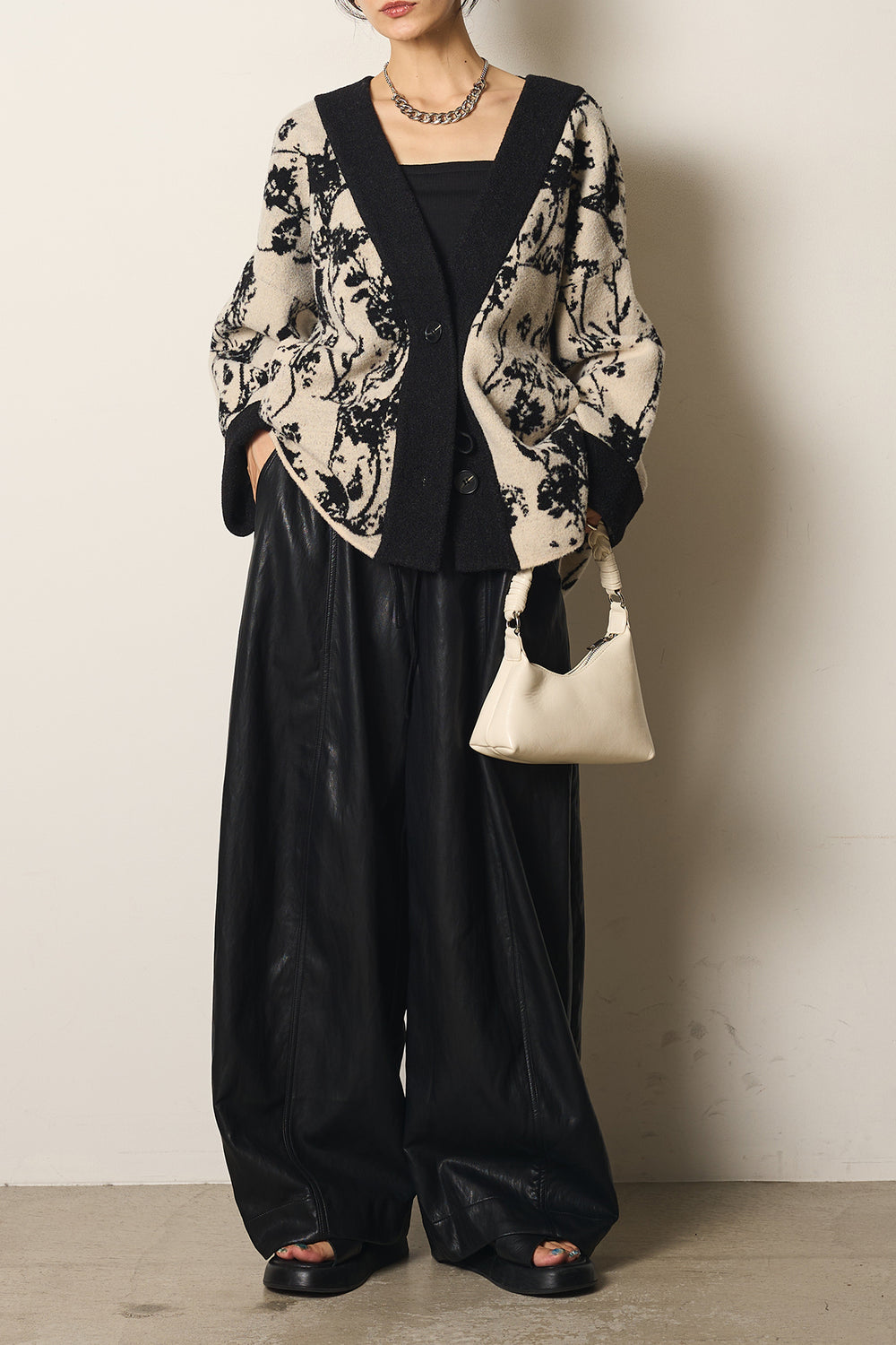 [SET]ボタニカル柄ボリュームニットカーディガン+フェイクレザーカーブワイドパンツ(2set)