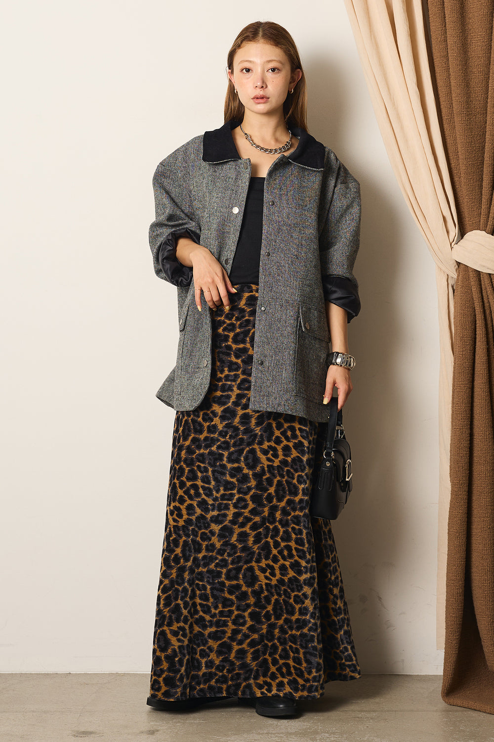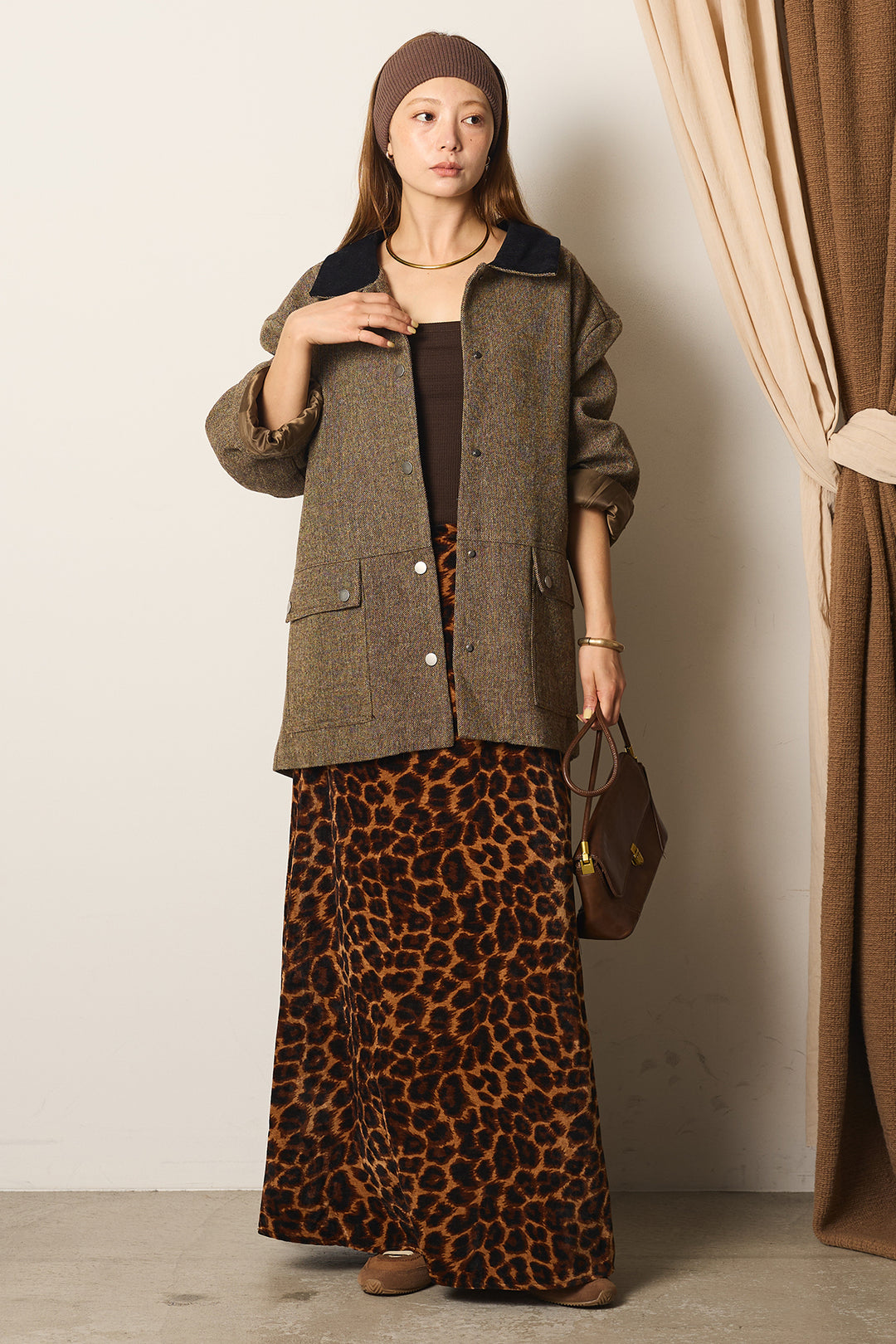 [SET]襟コーデュロイツイードカバーオール+レオパード柄ワイドスカート(2set)