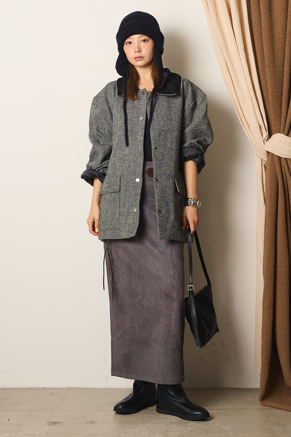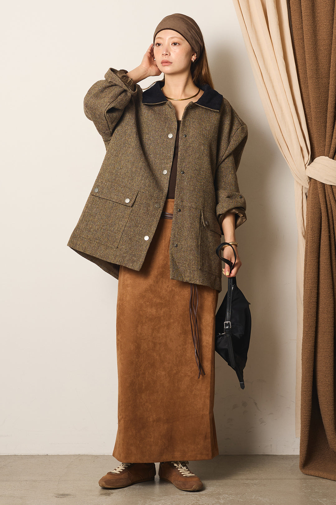 [SET]襟コーデュロイツイードカバーオール+ベルト付きフェイクスウェードワイドスカート(2set)