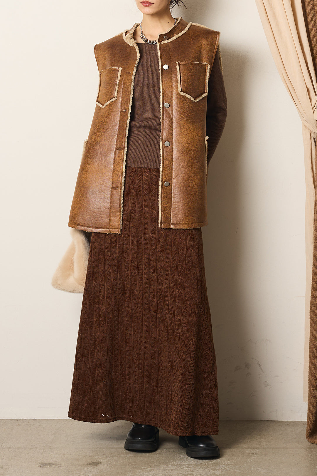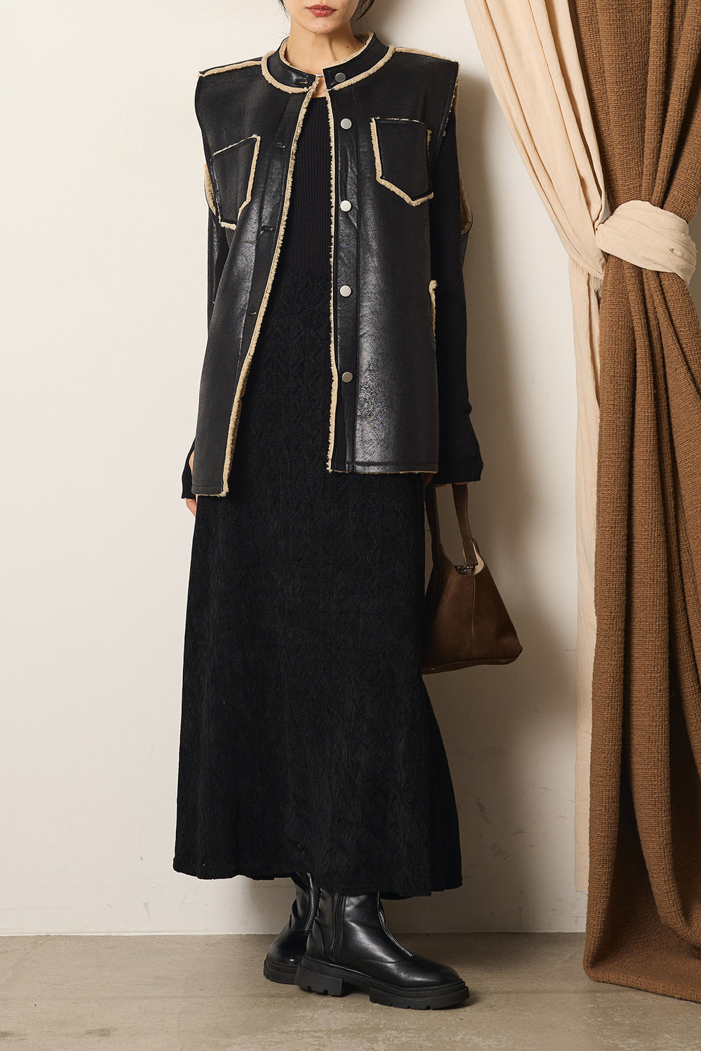 [SET]フェイクレザームートンベスト+ライン柄ベロアスカート(2set)