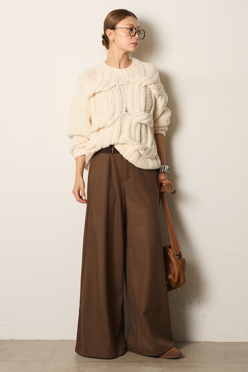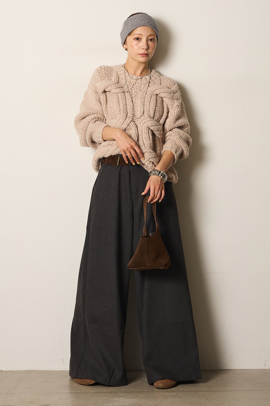 [SET]立体編みケーブルニットトップス+フロントタックワイドパンツ(2set)