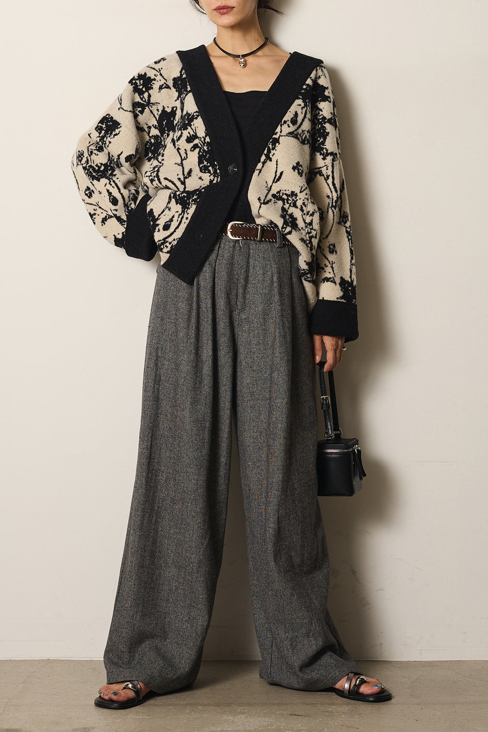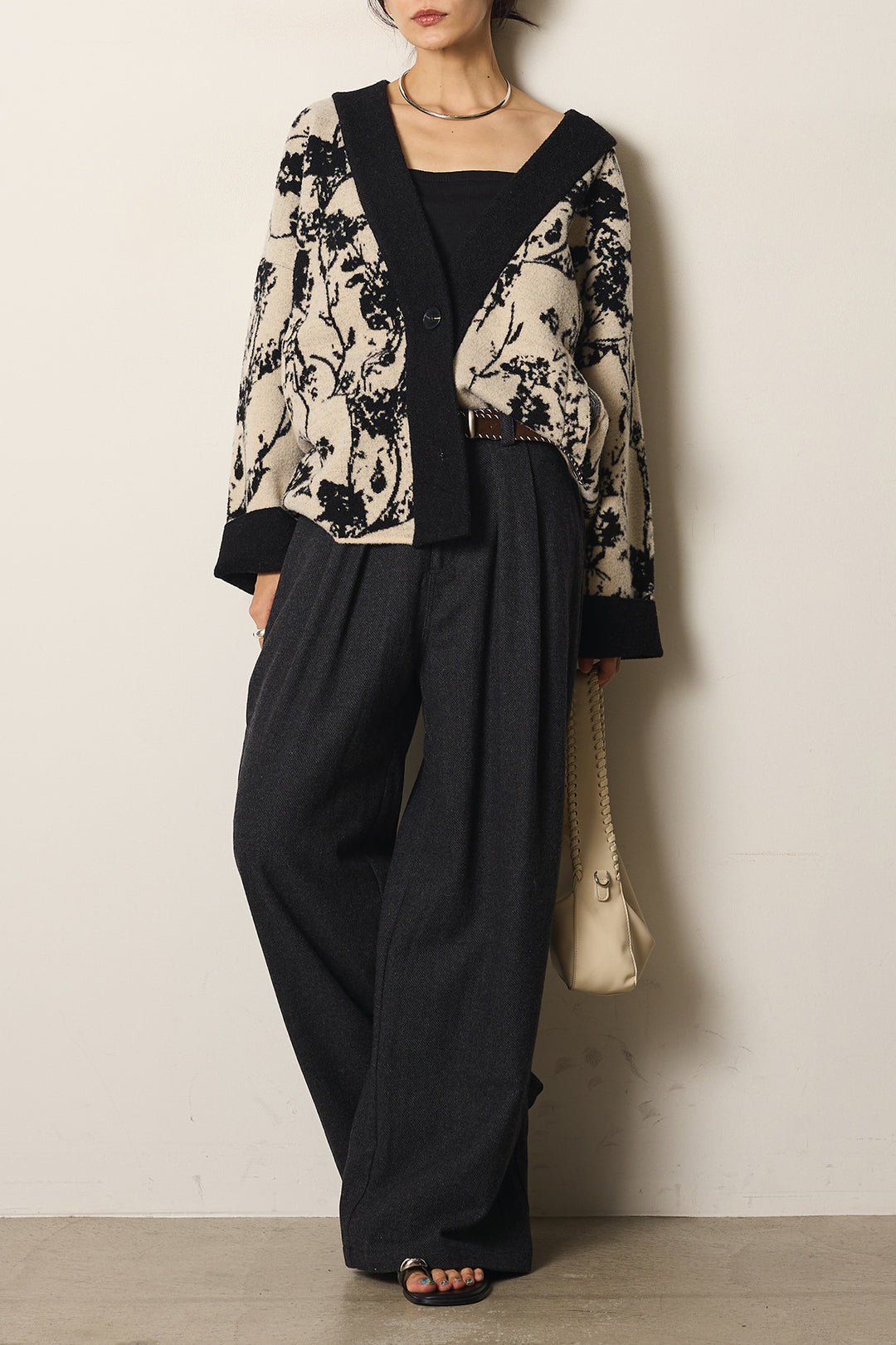 [SET]ボタニカル柄ボリュームニットカーディガン+ステッチデザインベルト付きワイドパンツ(2set)