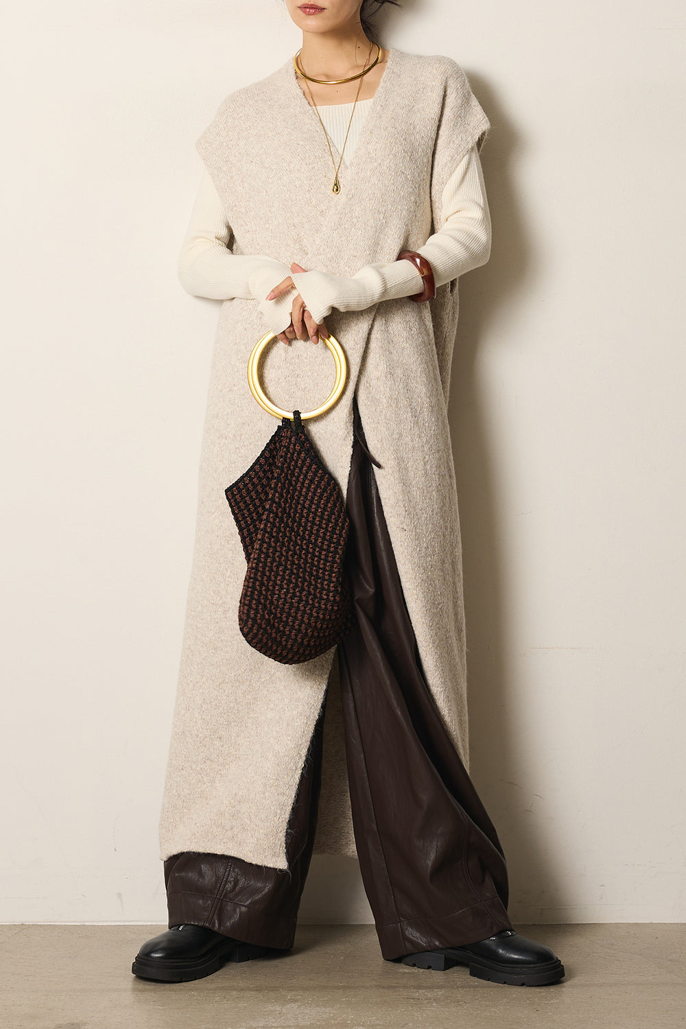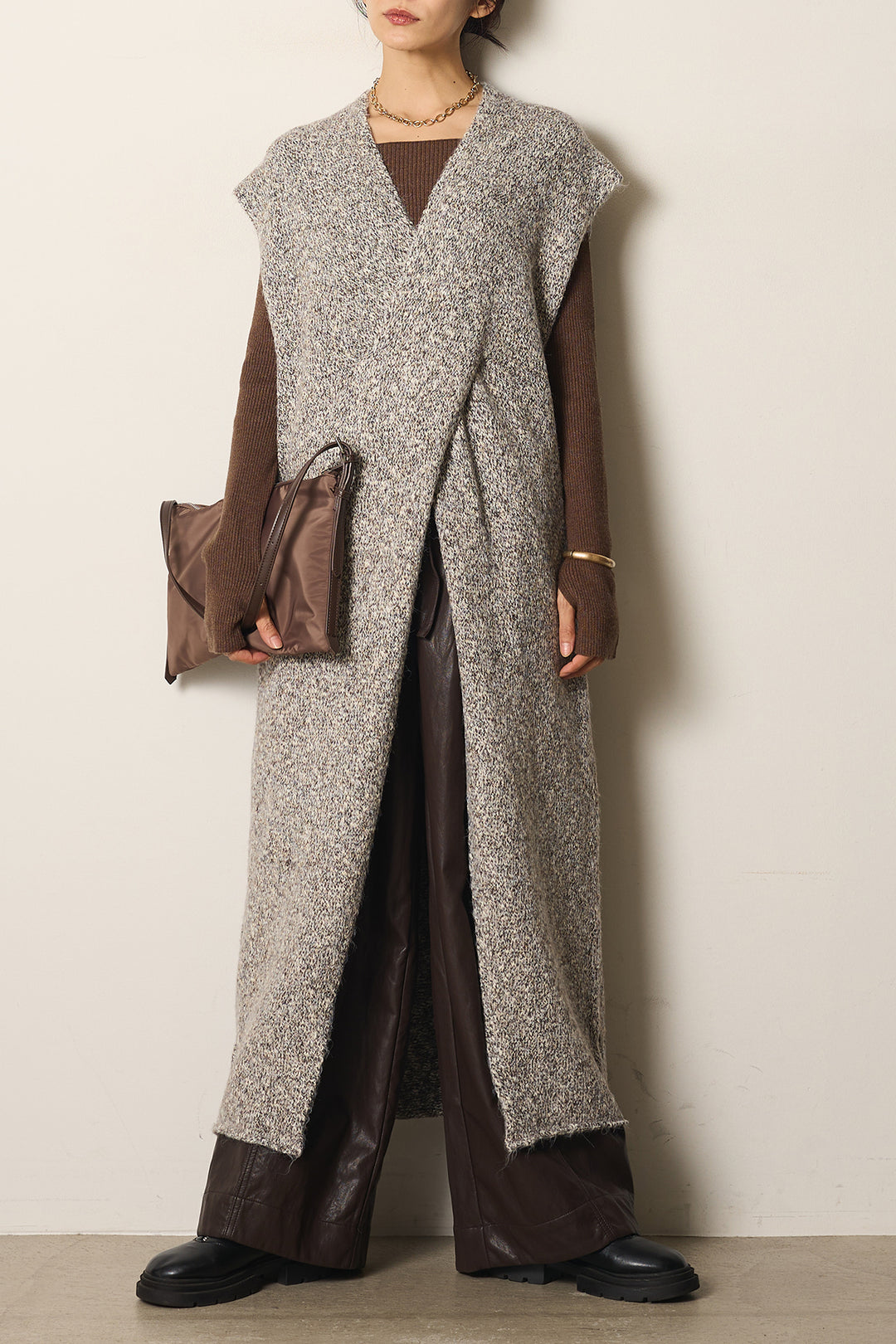 [SET]クロスデザインミックスニットワンピース+フェイクレザーカーブワイドパンツ(2set)