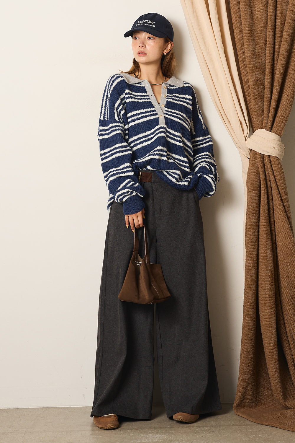 [SET]マルチボーダーニットポロトップス+フェイクレザーサイドベルトワイドパンツ(2set)