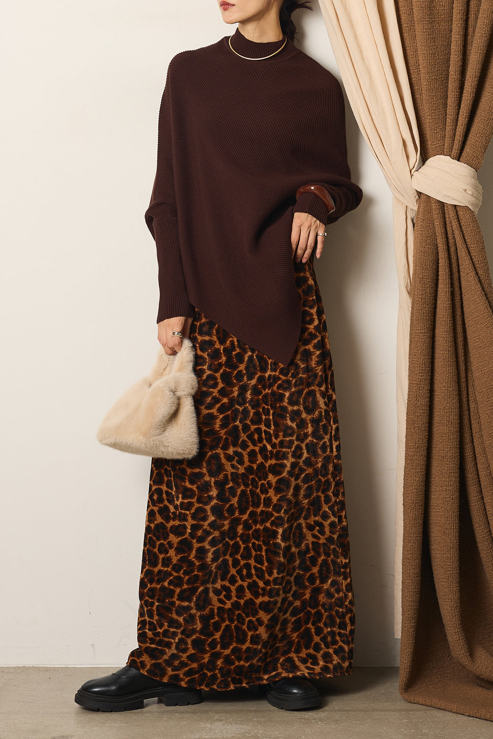 [SET]裾アシメデザインニットトップス+レオパード柄ワイドスカート(2set)