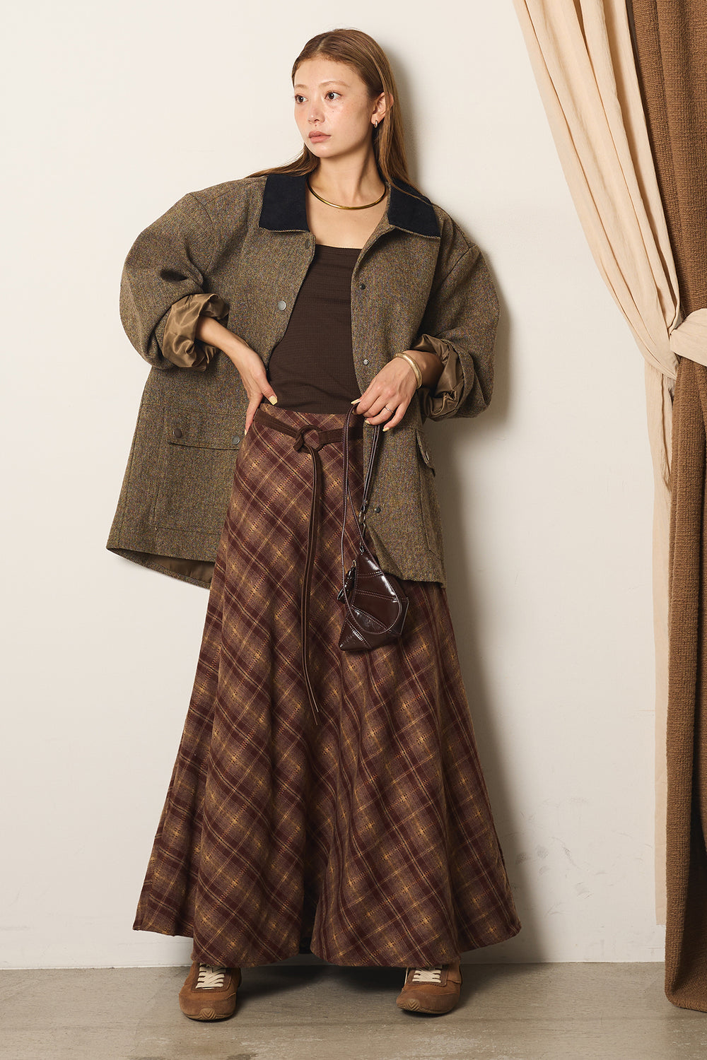 [SET]襟コーデュロイツイードカバーオール+ベルト付きタータンチェック柄スカート(2set)