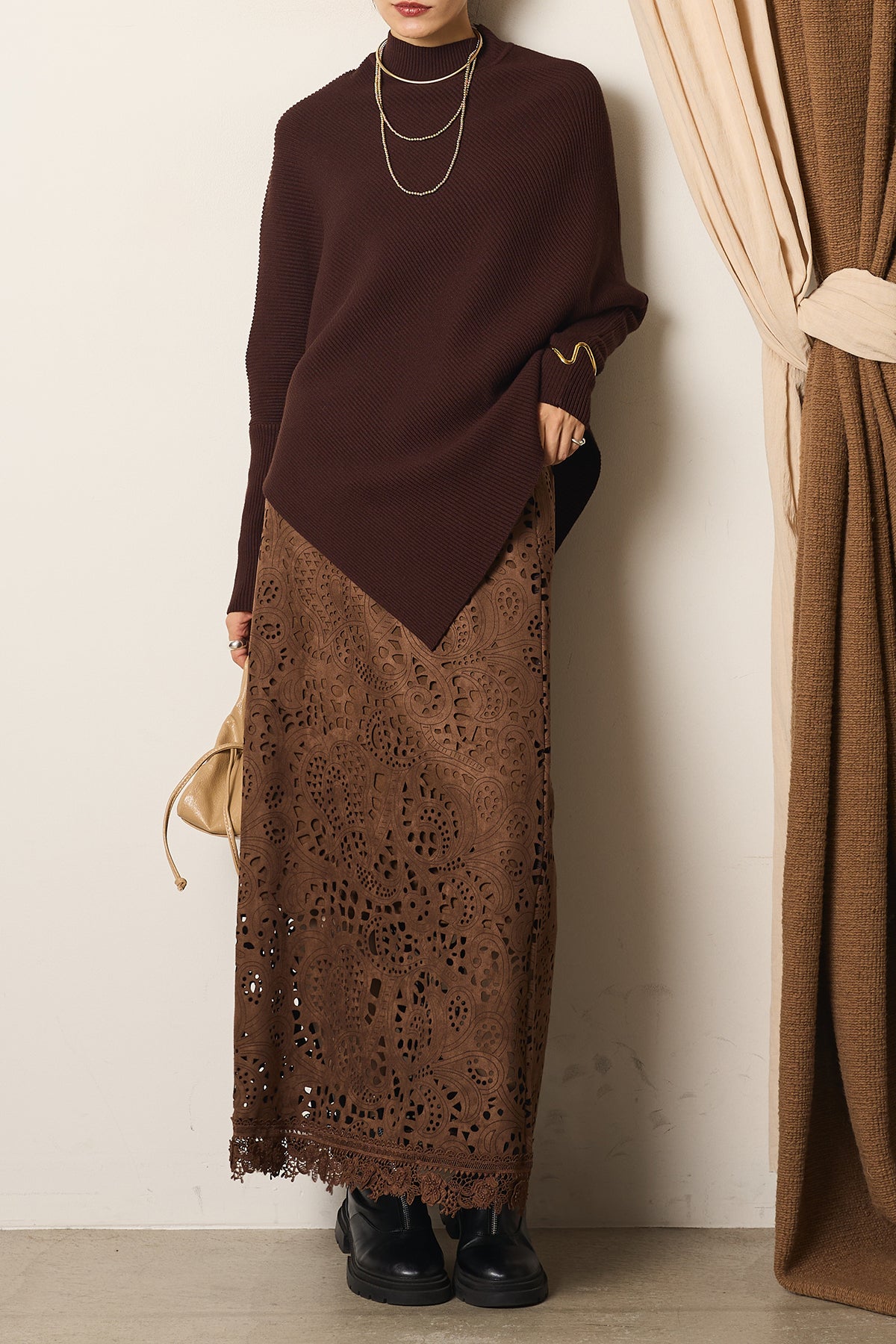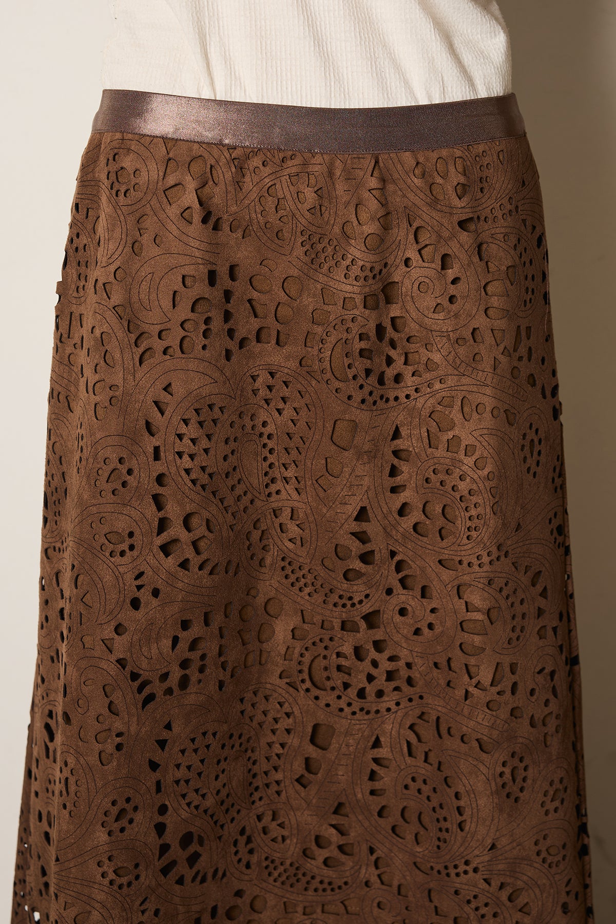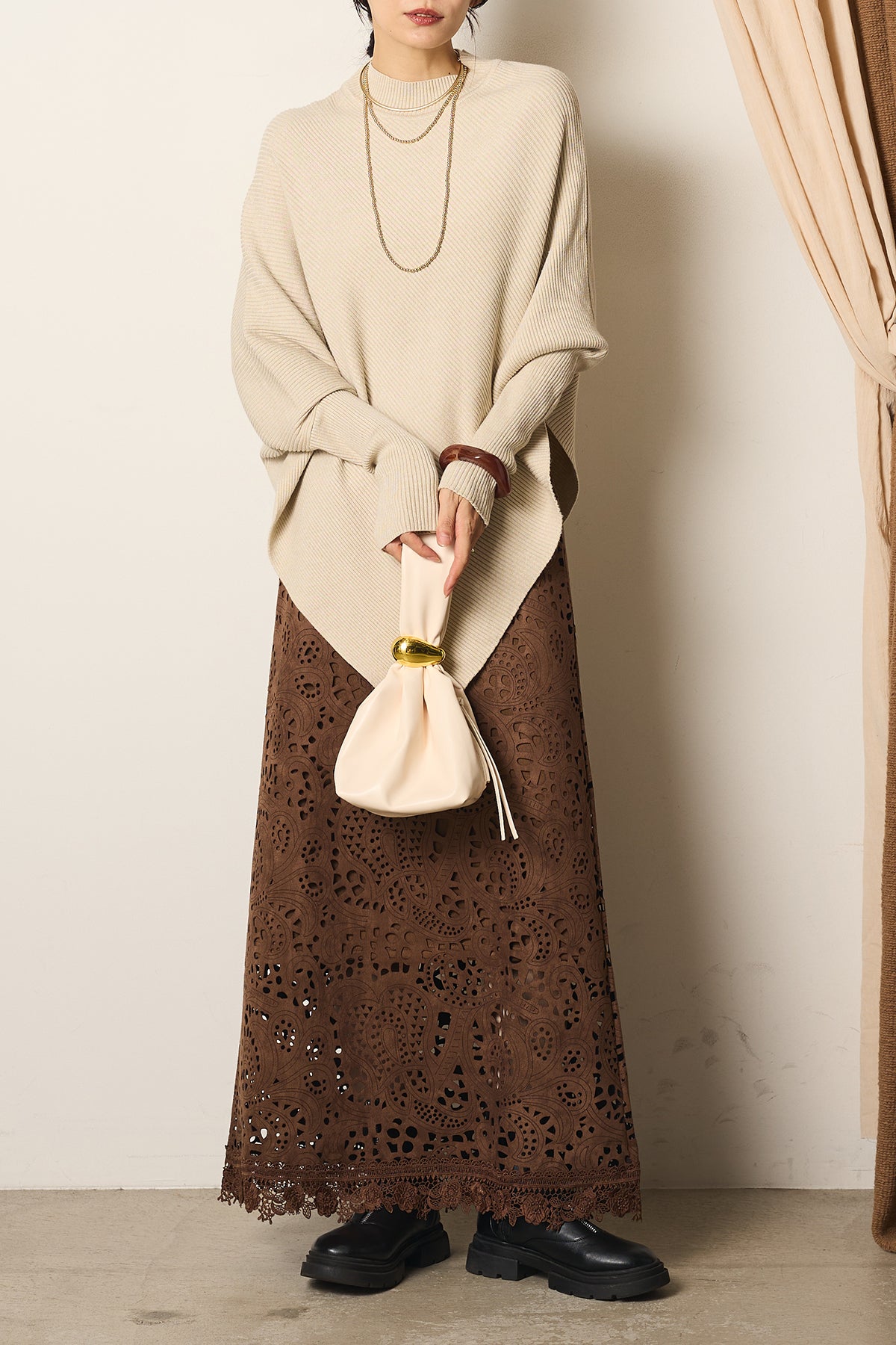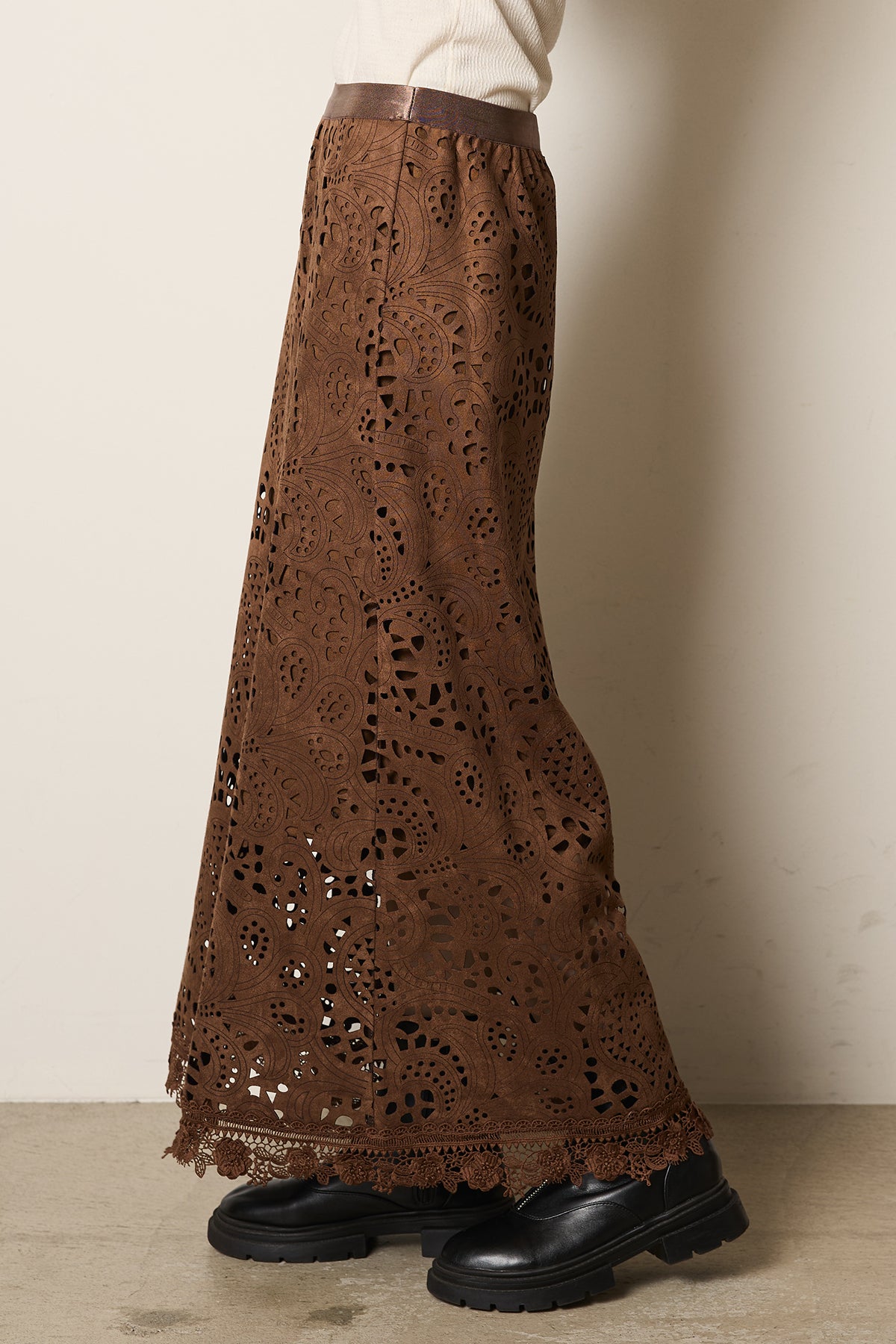 存在感のあるランダム柄が印象的なワイドスカート。レース調の透かし模様が軽やかな抜け感を生み、動くたびに表情豊かなスタイルを演出します。落ち着いたカラーで取り入れやすく、シンプルなトップスと合わせるだけでシーズンらしいコーディネートが完成する一枚です。