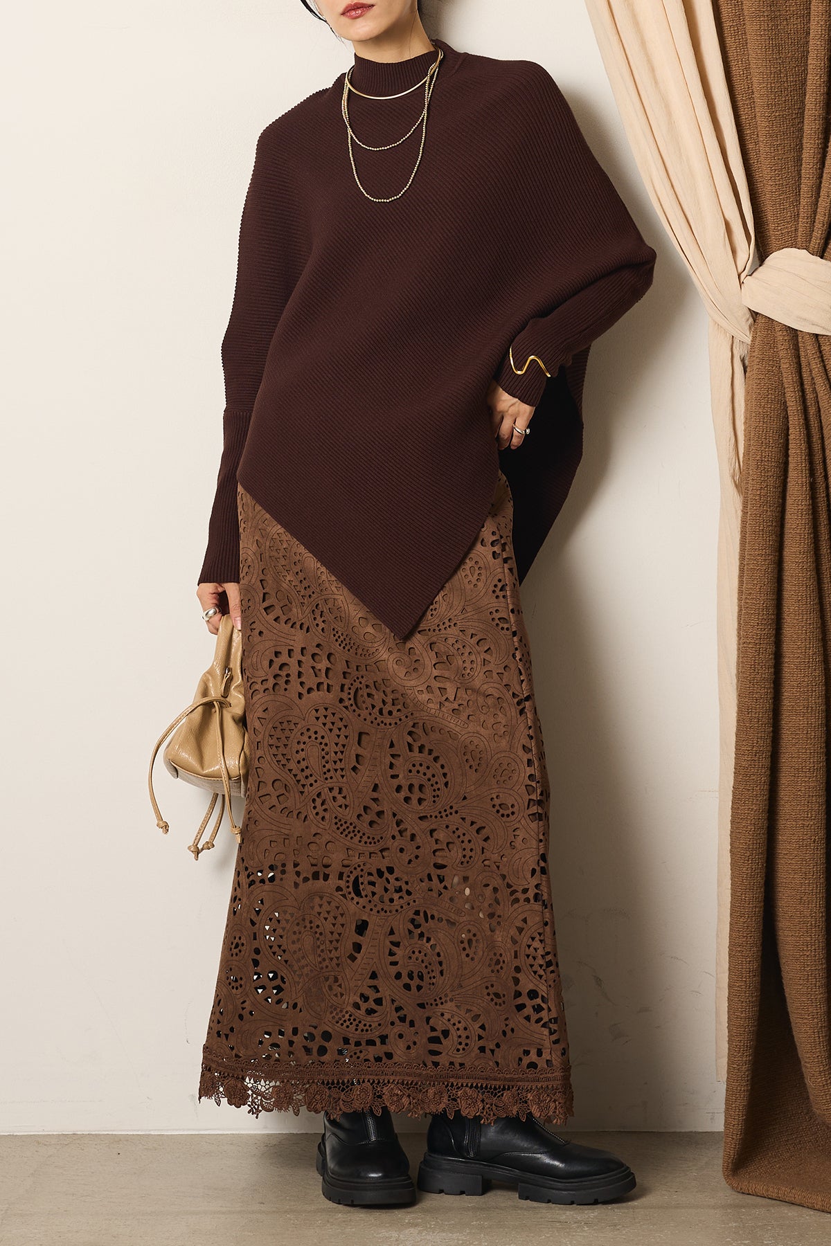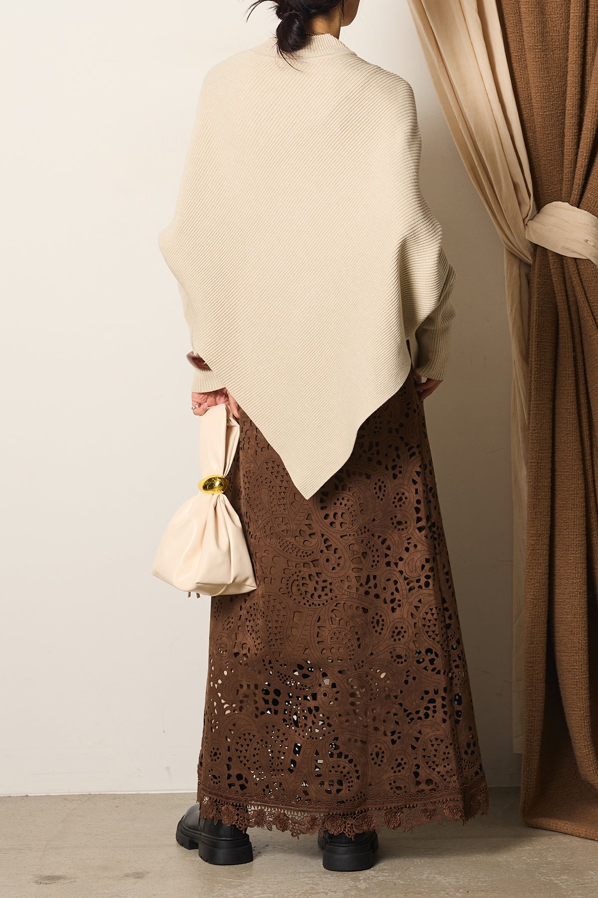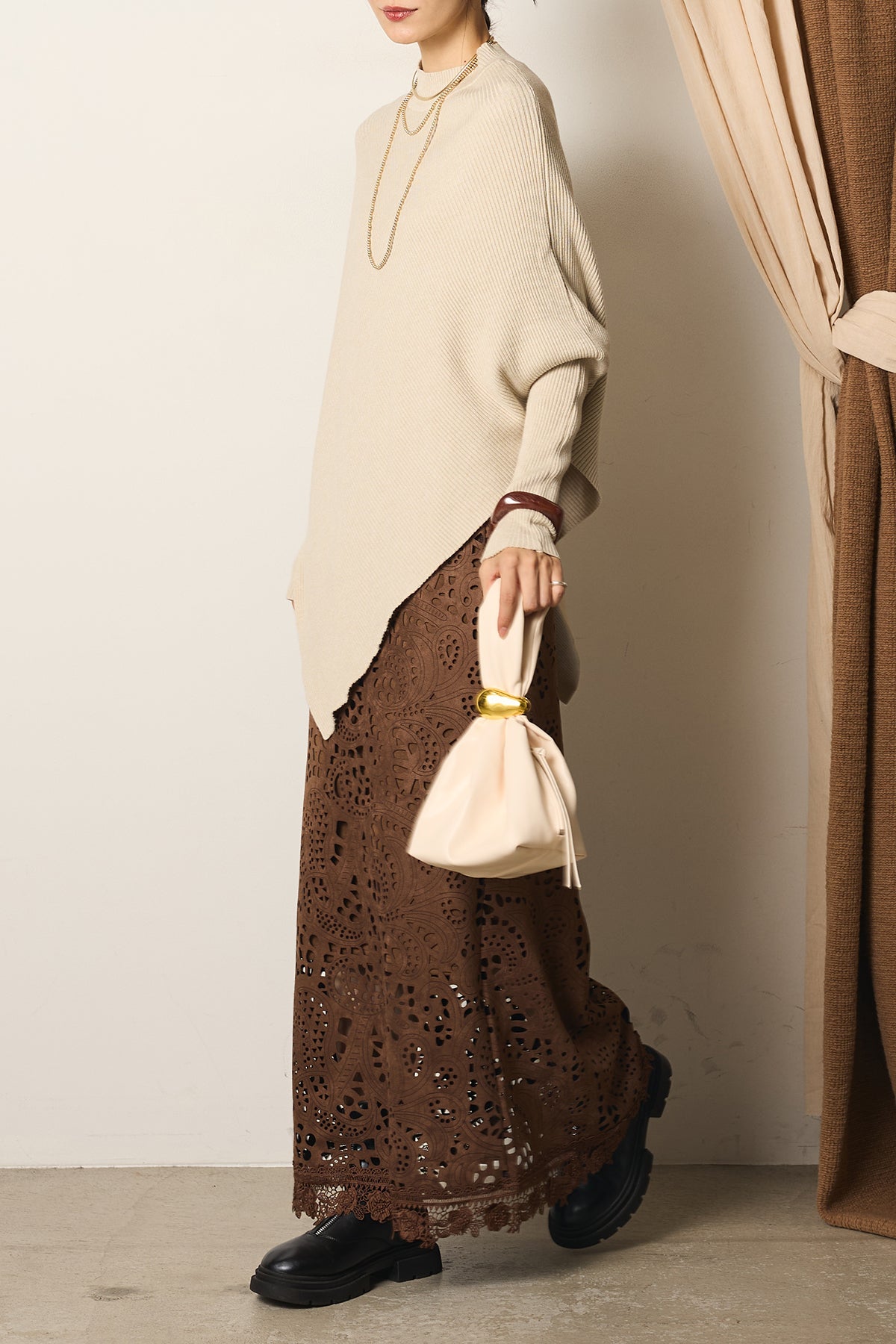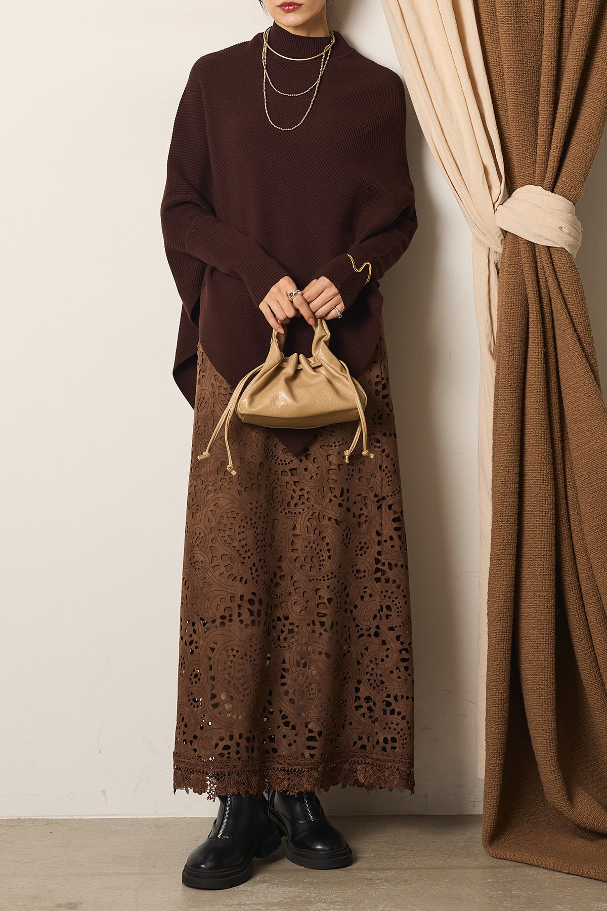 存在感のあるランダム柄が印象的なワイドスカート。レース調の透かし模様が軽やかな抜け感を生み、動くたびに表情豊かなスタイルを演出します。落ち着いたカラーで取り入れやすく、シンプルなトップスと合わせるだけでシーズンらしいコーディネートが完成する一枚です。