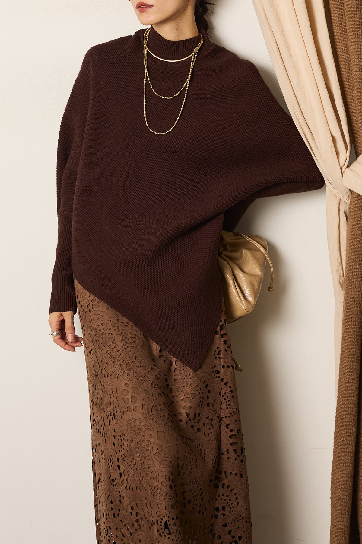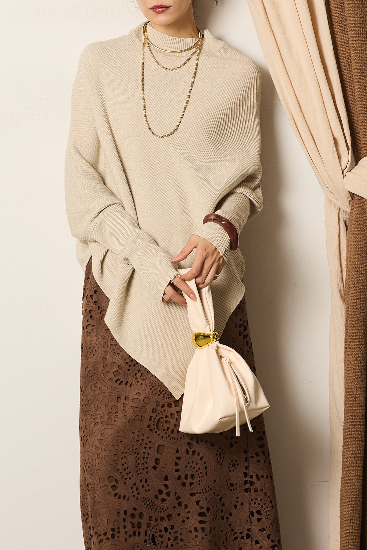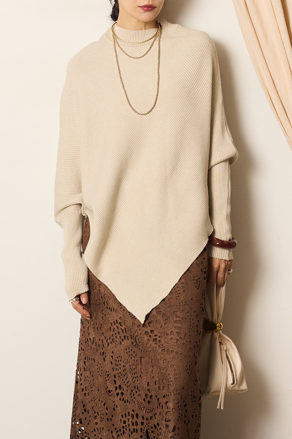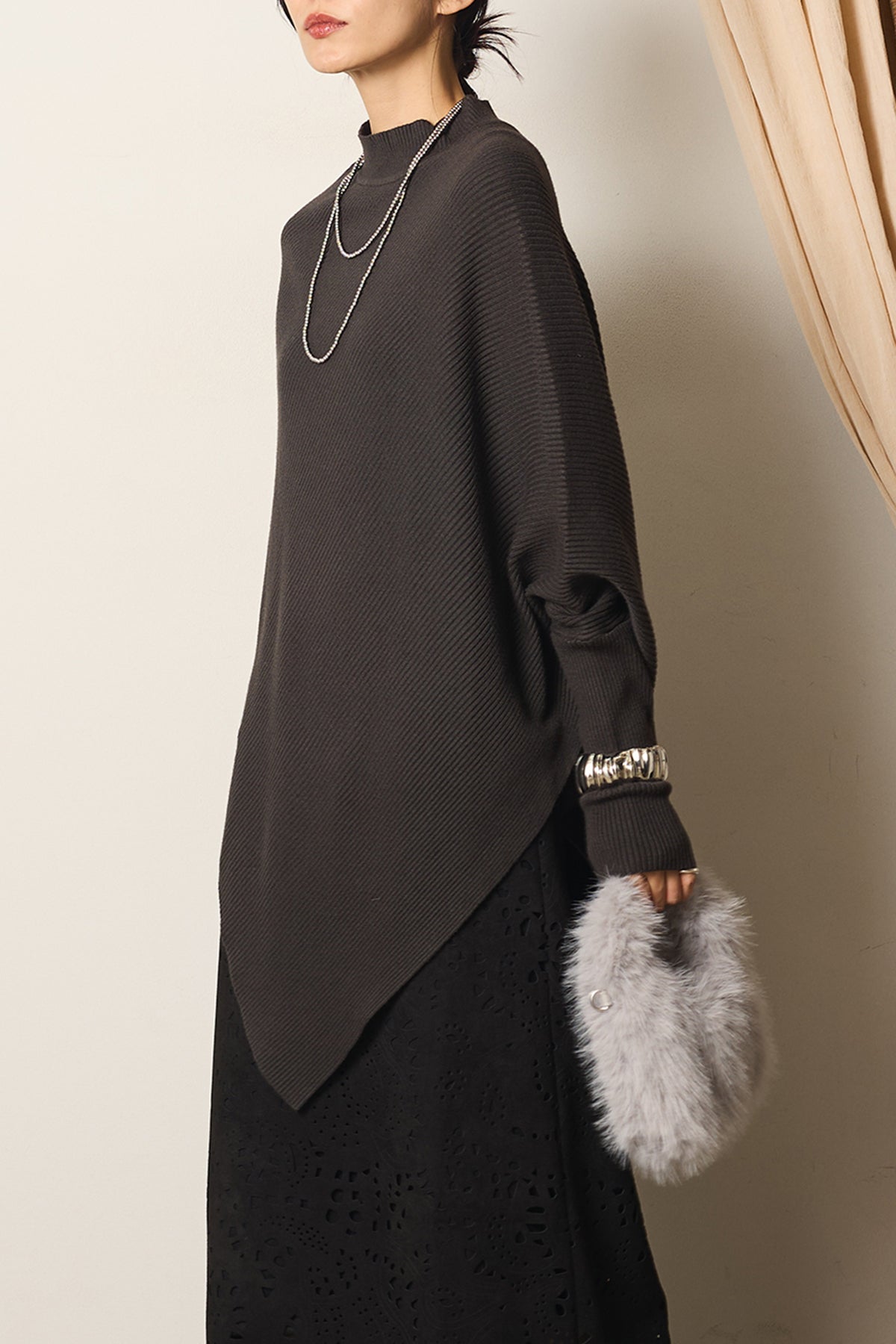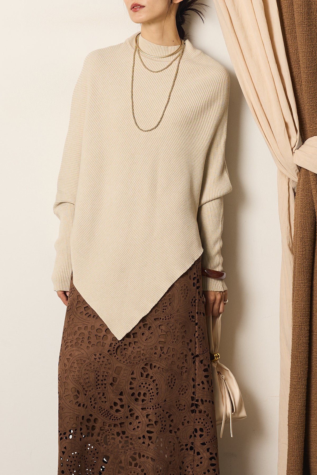裾にアシンメトリーデザインを施したニットトップス。柔らかな素材感が心地よく、動くたびに揺れる裾のラインが洗練された印象を与えます。シンプルなボトムスと合わせるだけでコーディネートが決まり、デイリーからお出かけまで幅広く活躍する一枚です。