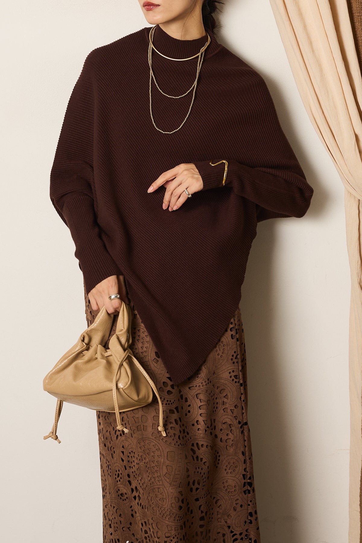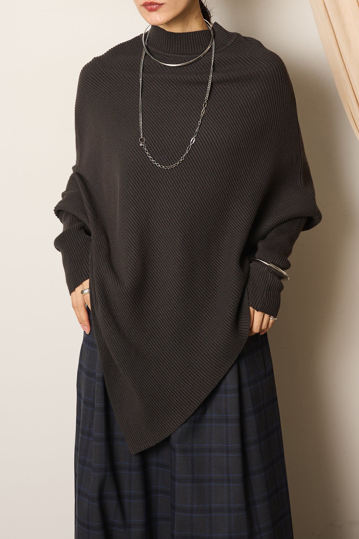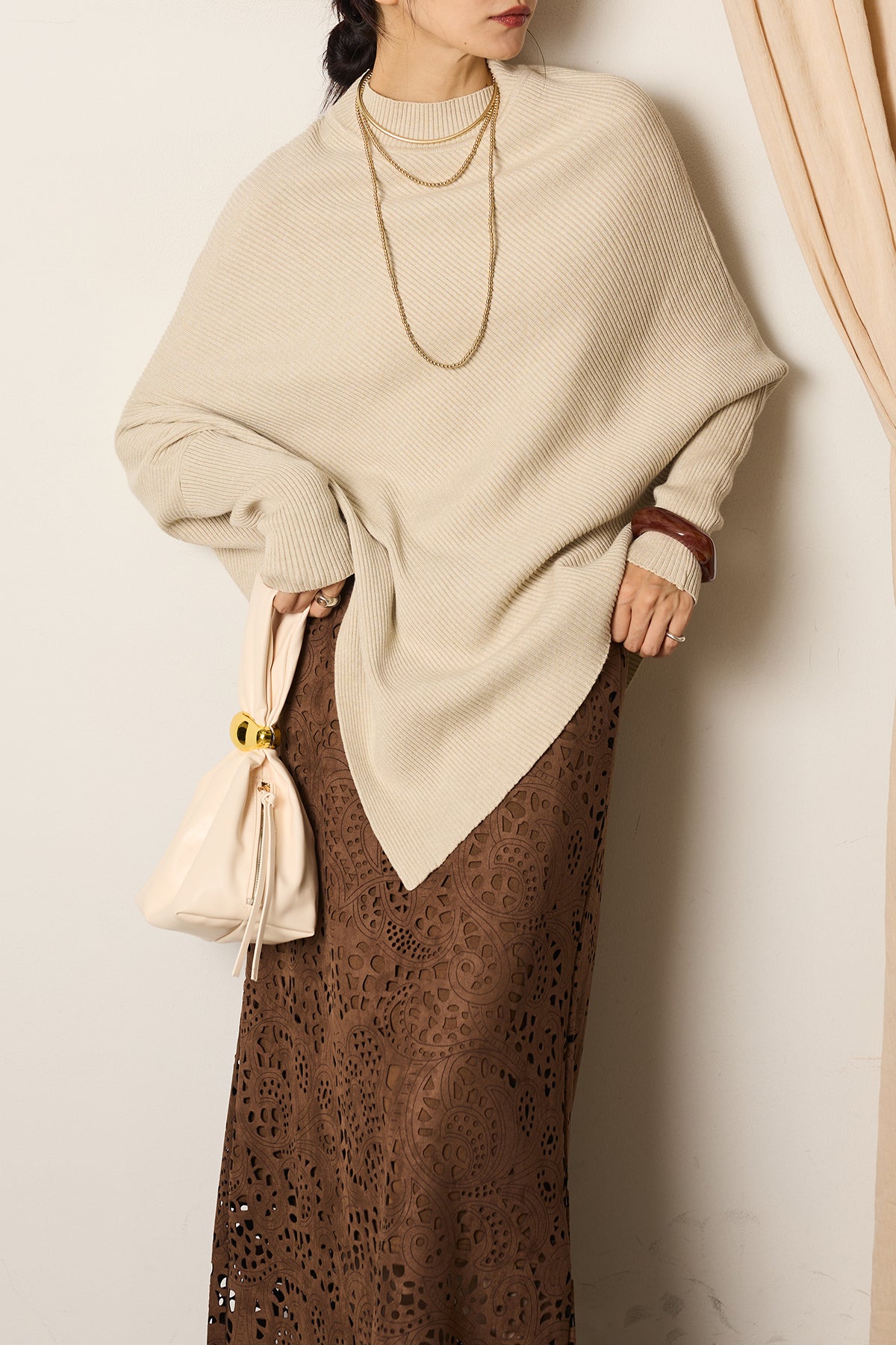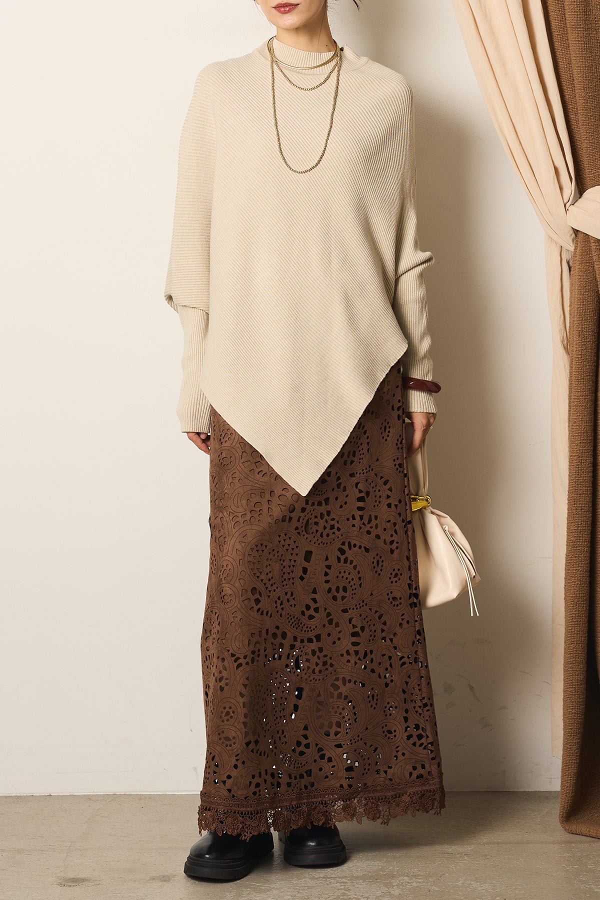 裾にアシンメトリーデザインを施したニットトップス。柔らかな素材感が心地よく、動くたびに揺れる裾のラインが洗練された印象を与えます。シンプルなボトムスと合わせるだけでコーディネートが決まり、デイリーからお出かけまで幅広く活躍する一枚です。