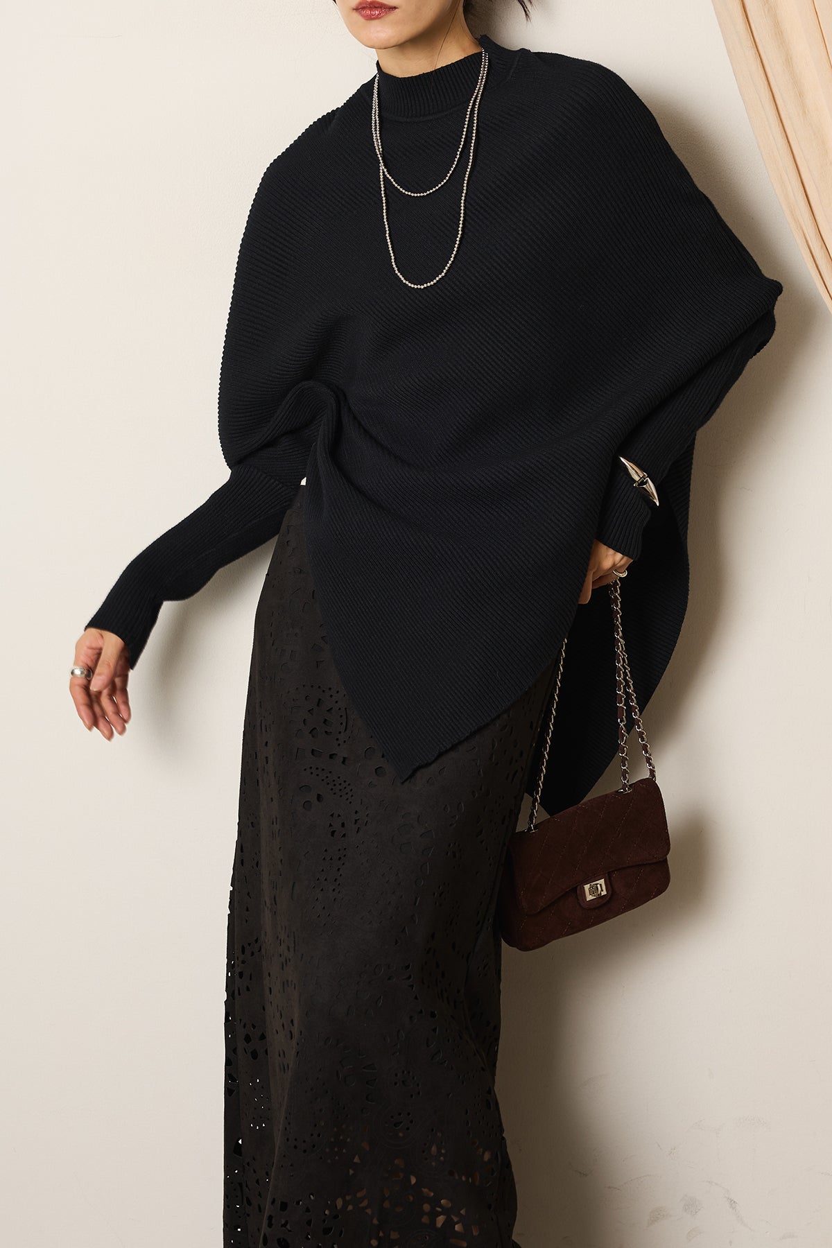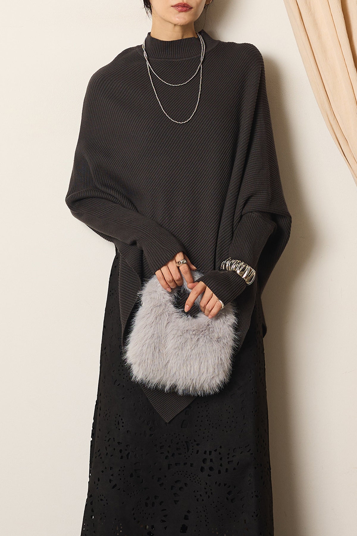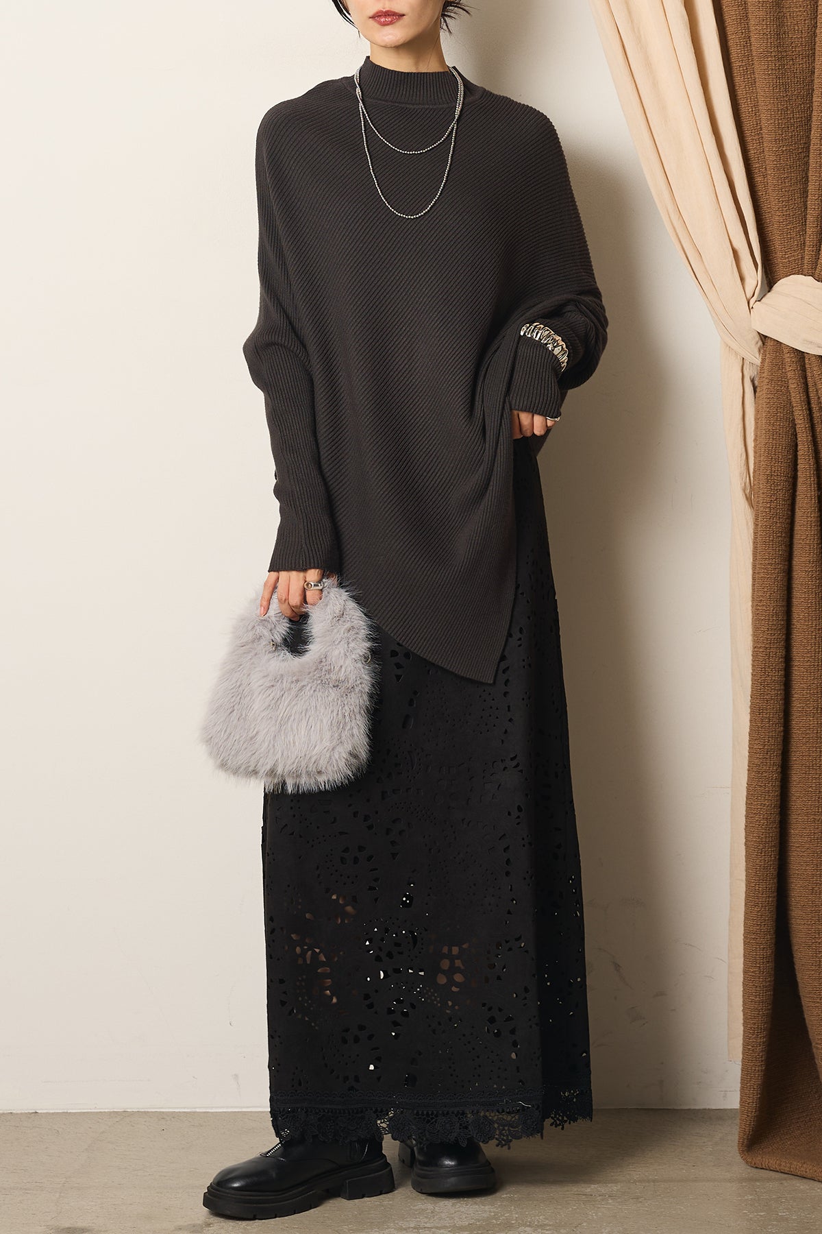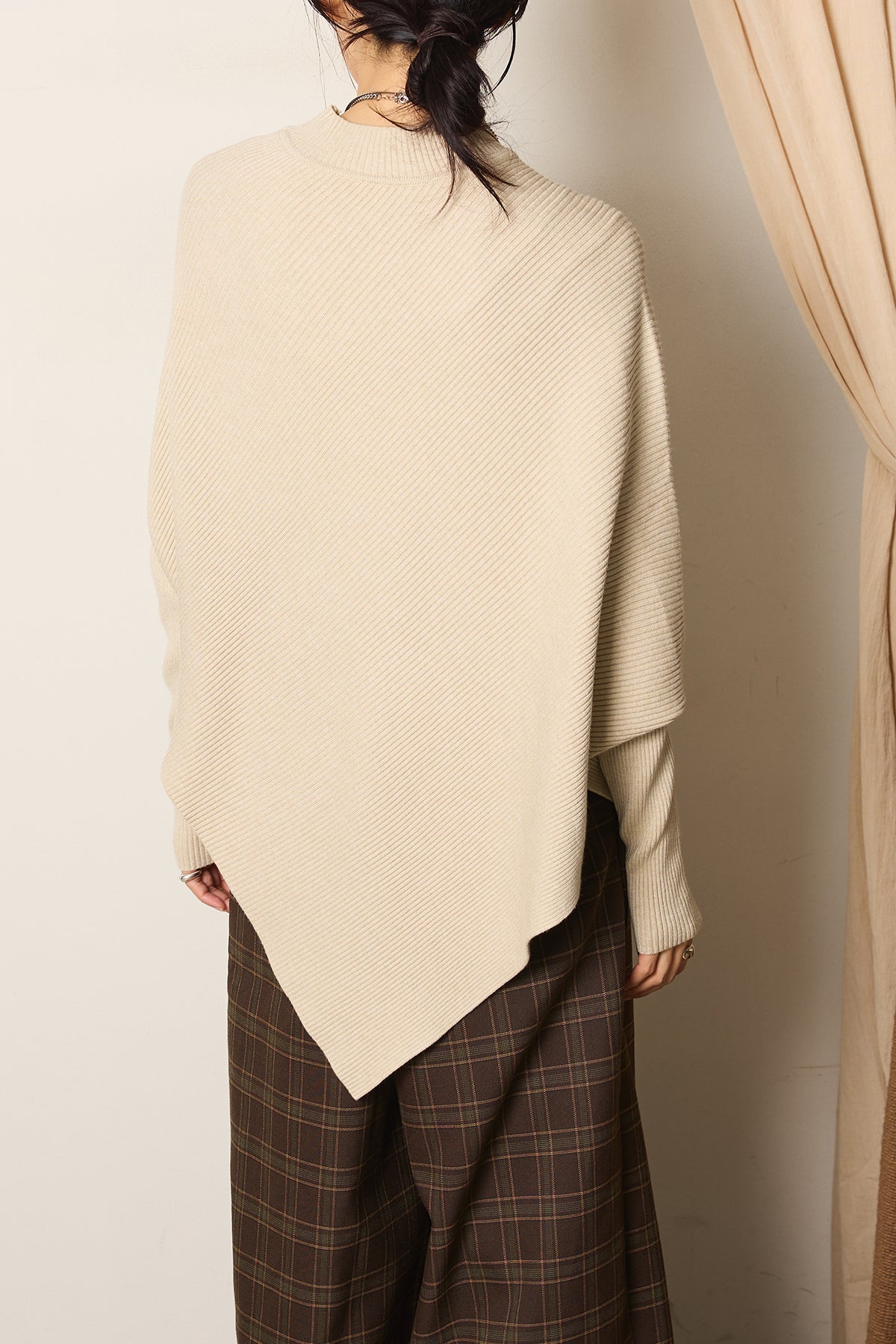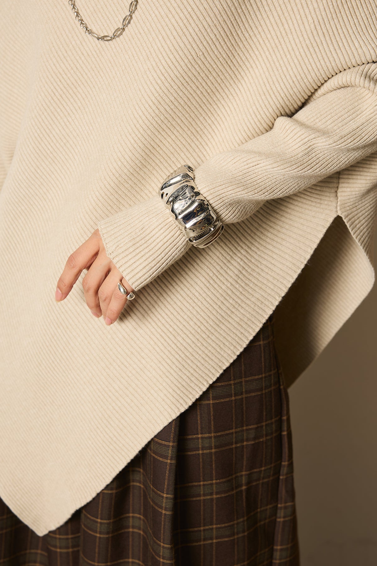 裾にアシンメトリーデザインを施したニットトップス。柔らかな素材感が心地よく、動くたびに揺れる裾のラインが洗練された印象を与えます。シンプルなボトムスと合わせるだけでコーディネートが決まり、デイリーからお出かけまで幅広く活躍する一枚です。