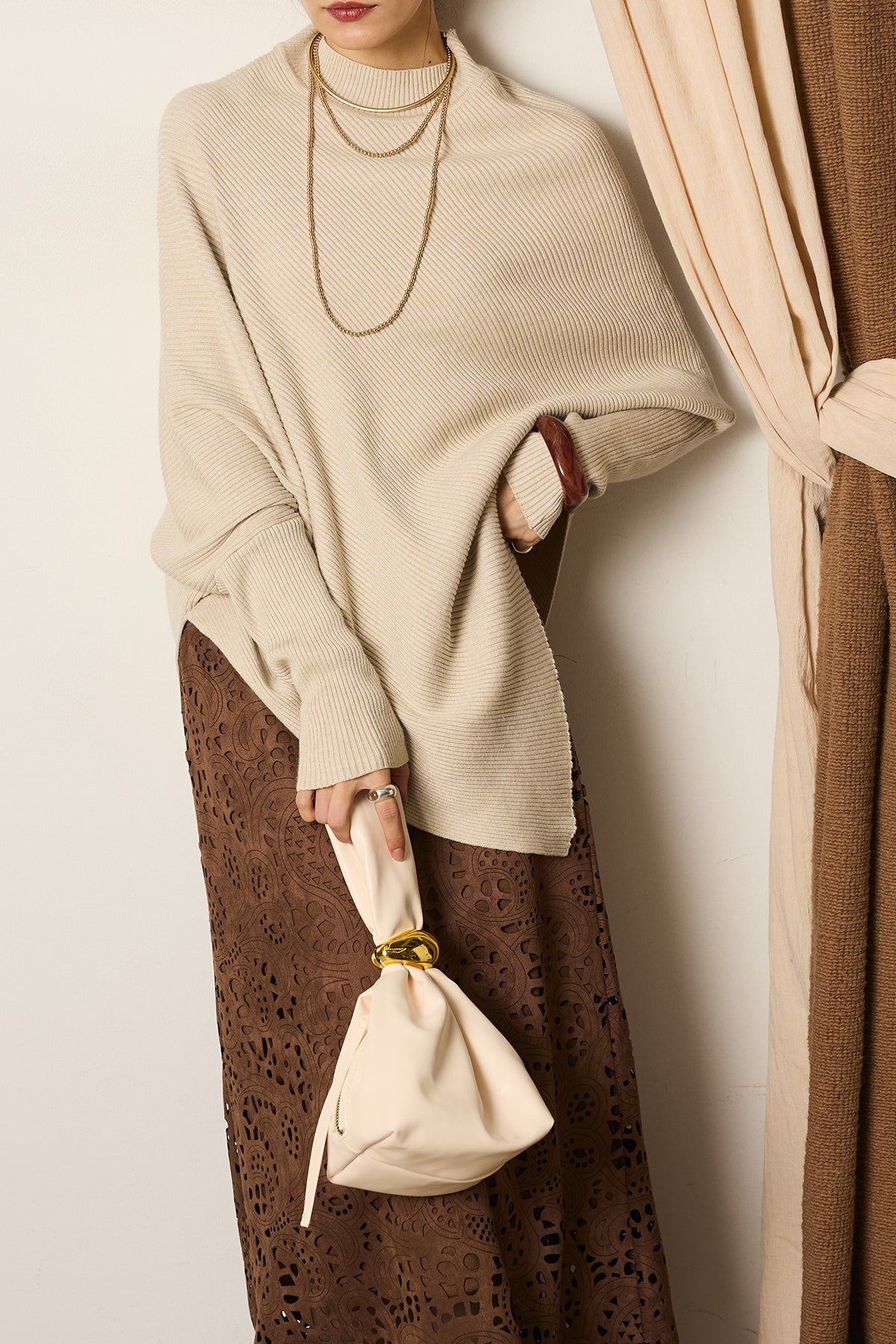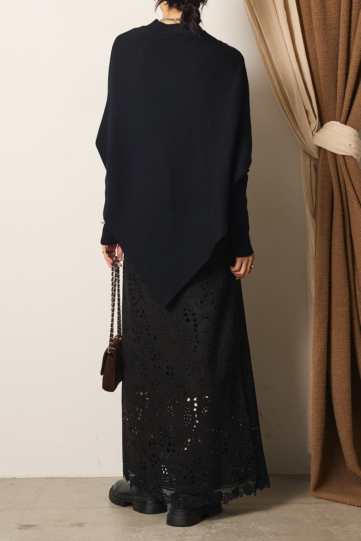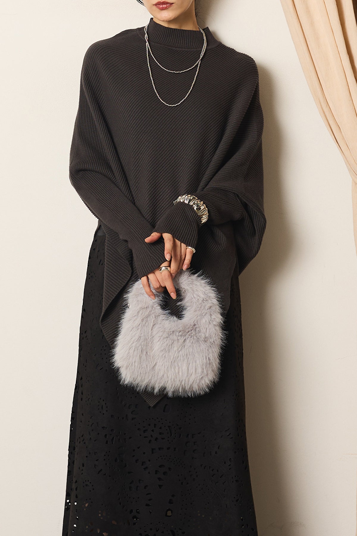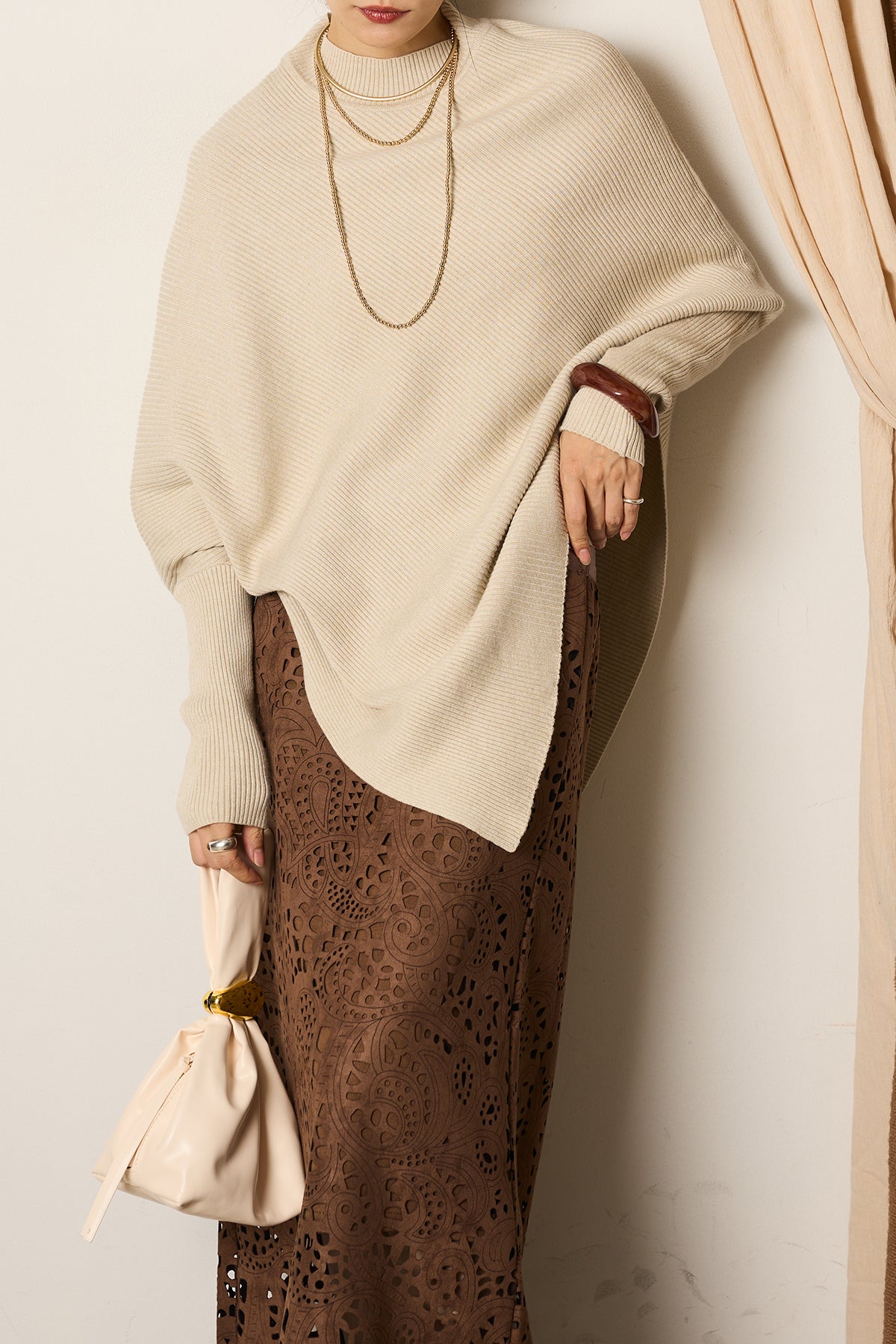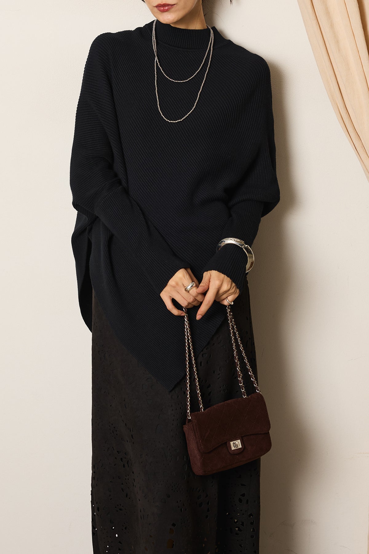 裾にアシンメトリーデザインを施したニットトップス。柔らかな素材感が心地よく、動くたびに揺れる裾のラインが洗練された印象を与えます。シンプルなボトムスと合わせるだけでコーディネートが決まり、デイリーからお出かけまで幅広く活躍する一枚です。