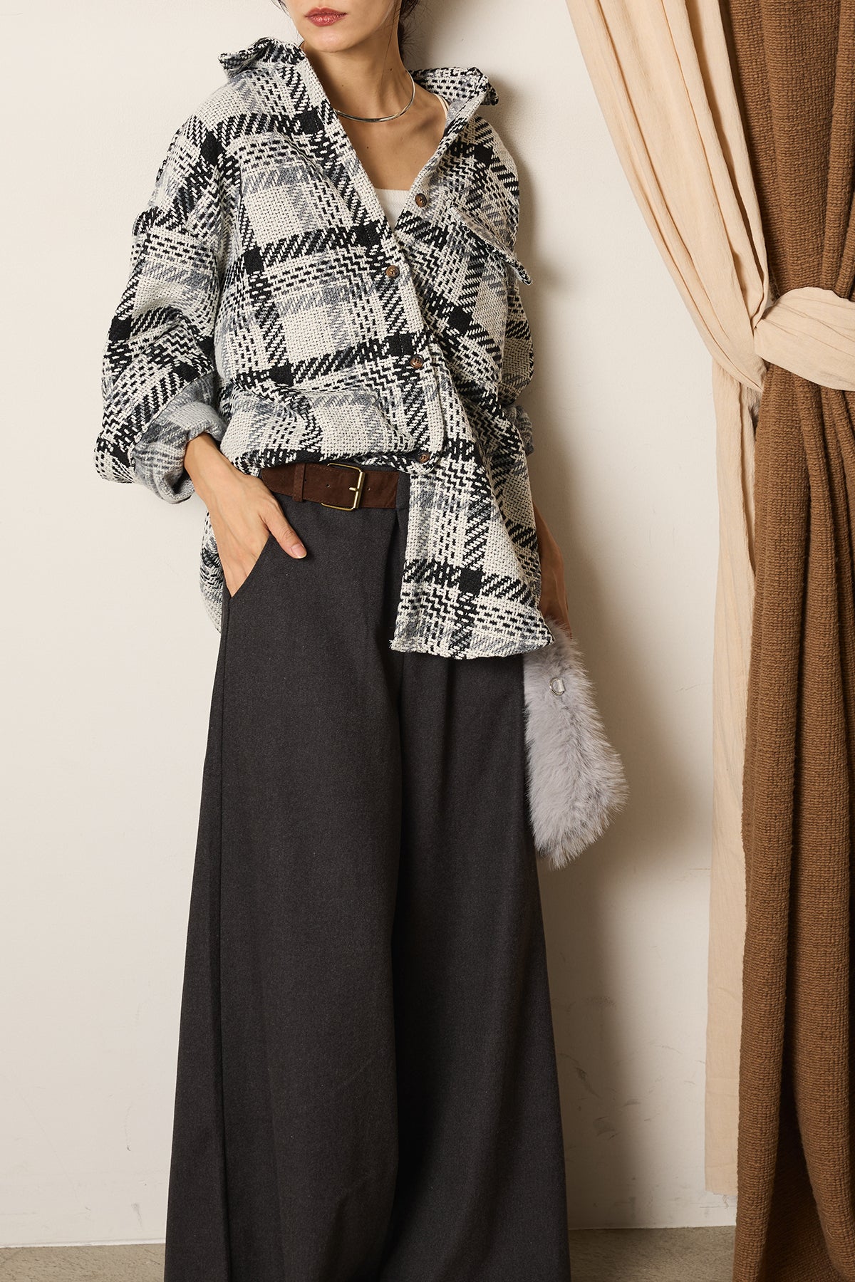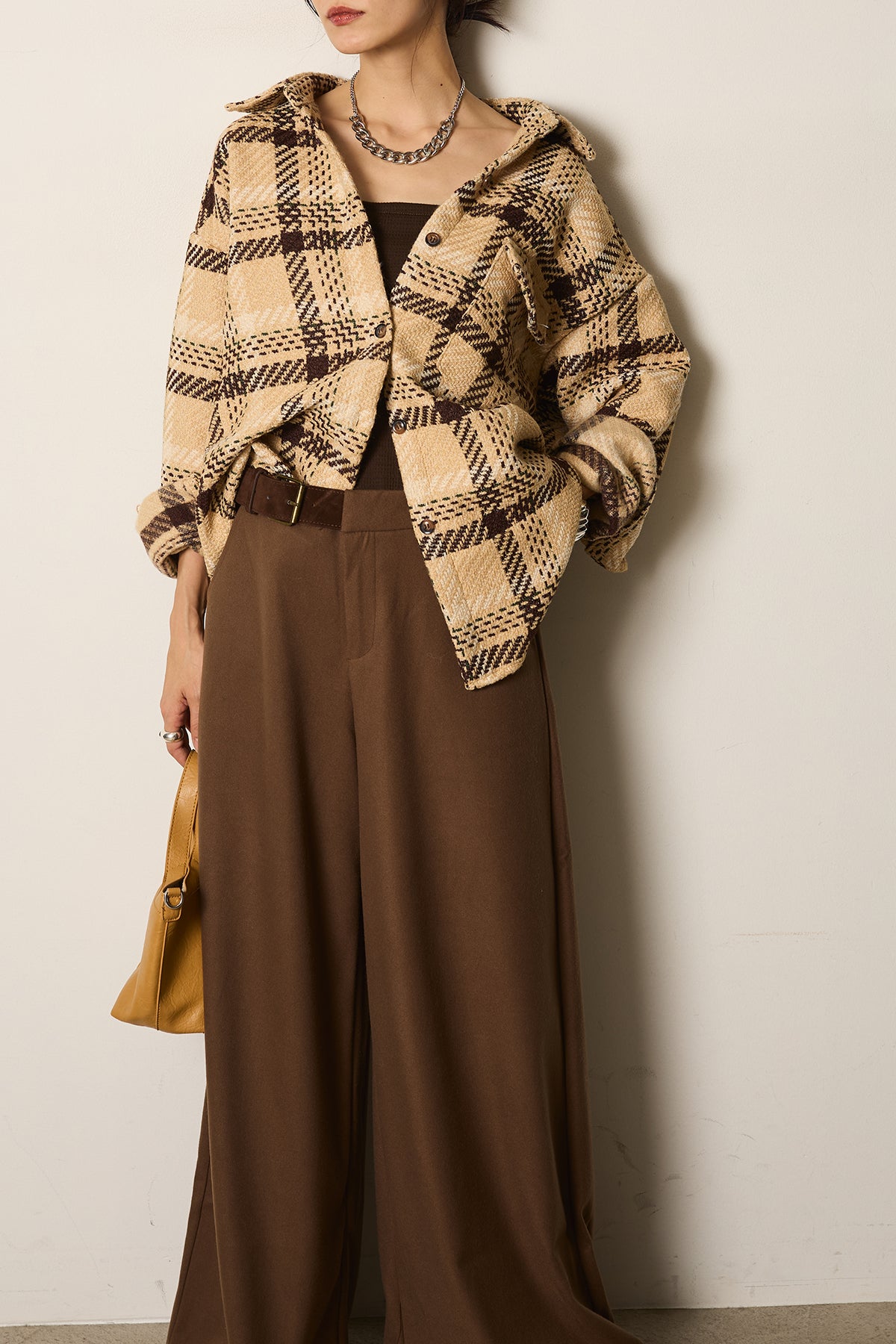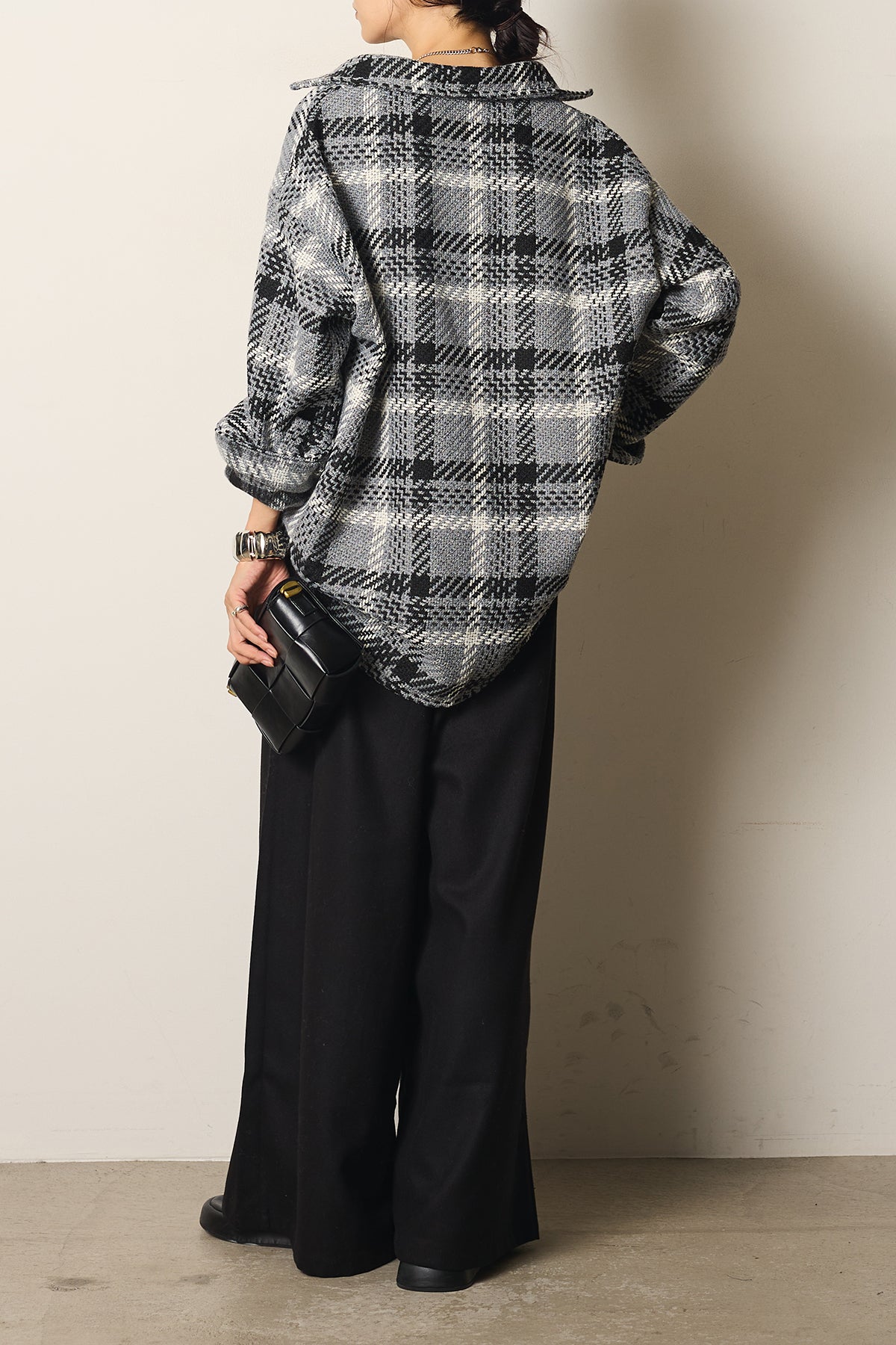 存在感のあるチェック柄が目を引くツイードジャケット。起毛感のある柔らかな風合いで、シーズンらしい温もりをプラスします。ゆとりのあるシルエットに大きめのポケットをあしらい、実用性とデザイン性を兼ね備えた一枚。羽織るだけでコーディネートが華やぐアイテムです。