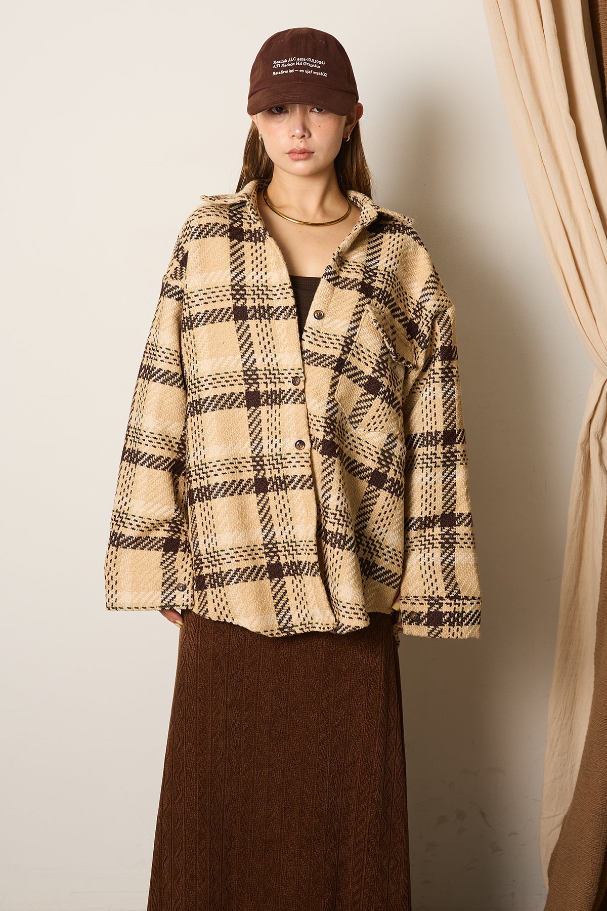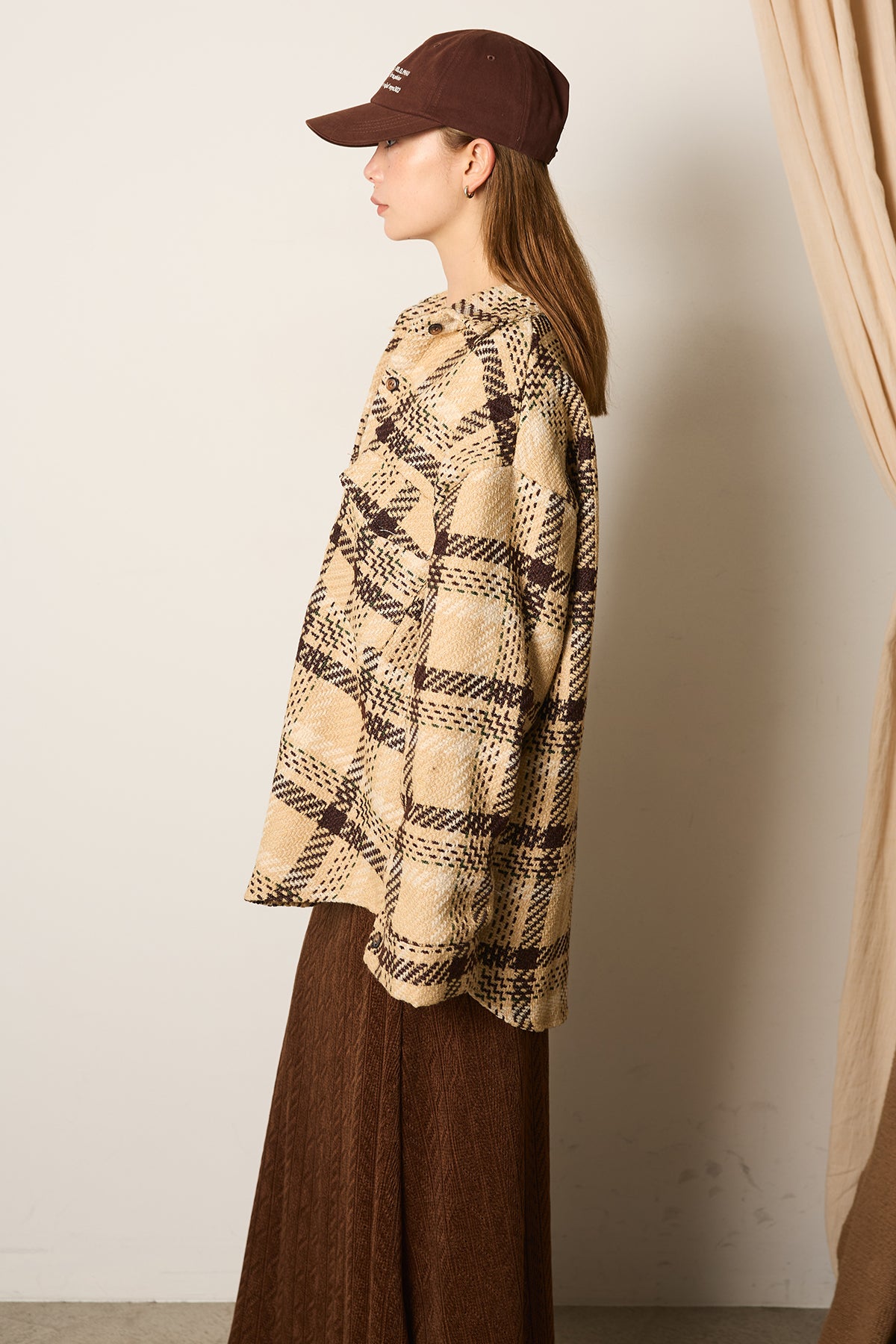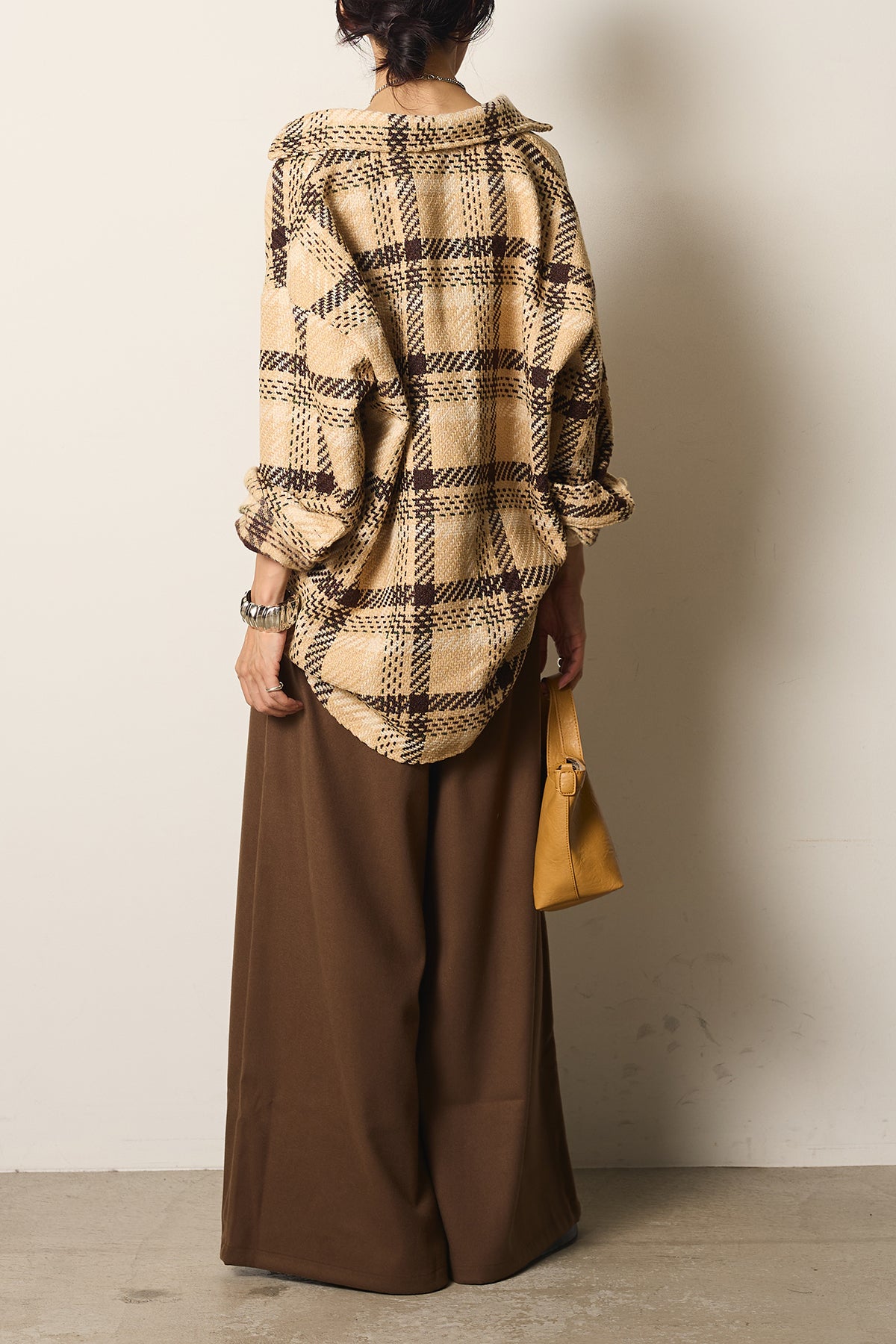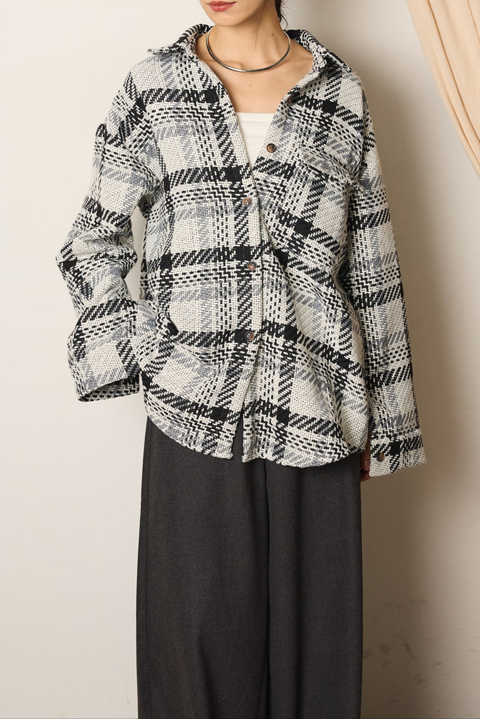 存在感のあるチェック柄が目を引くツイードジャケット。起毛感のある柔らかな風合いで、シーズンらしい温もりをプラスします。ゆとりのあるシルエットに大きめのポケットをあしらい、実用性とデザイン性を兼ね備えた一枚。羽織るだけでコーディネートが華やぐアイテムです。