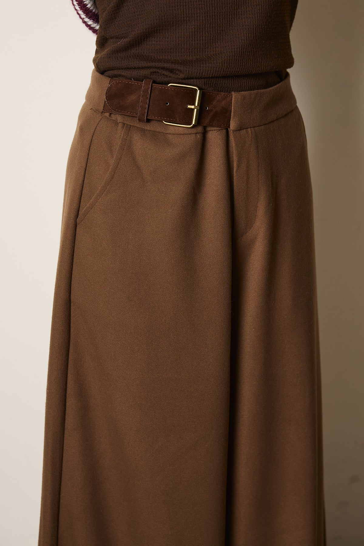 サイドにフェイクレザーベルトをあしらったワイドパンツ。ハリ感のある素材がシルエットを美しく保ち、落ち感のあるラインが脚をすらりと見せてくれます。シンプルながらもモードなアクセントを効かせたデザインで、デイリーからきれいめスタイルまで幅広く活躍する一本です。