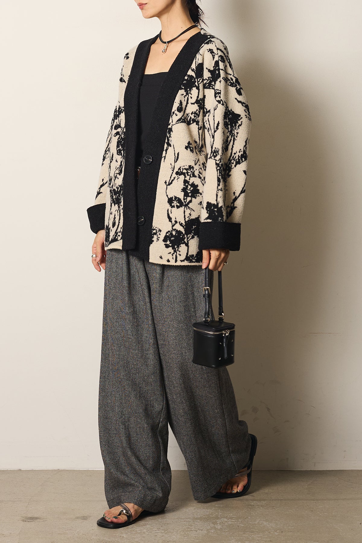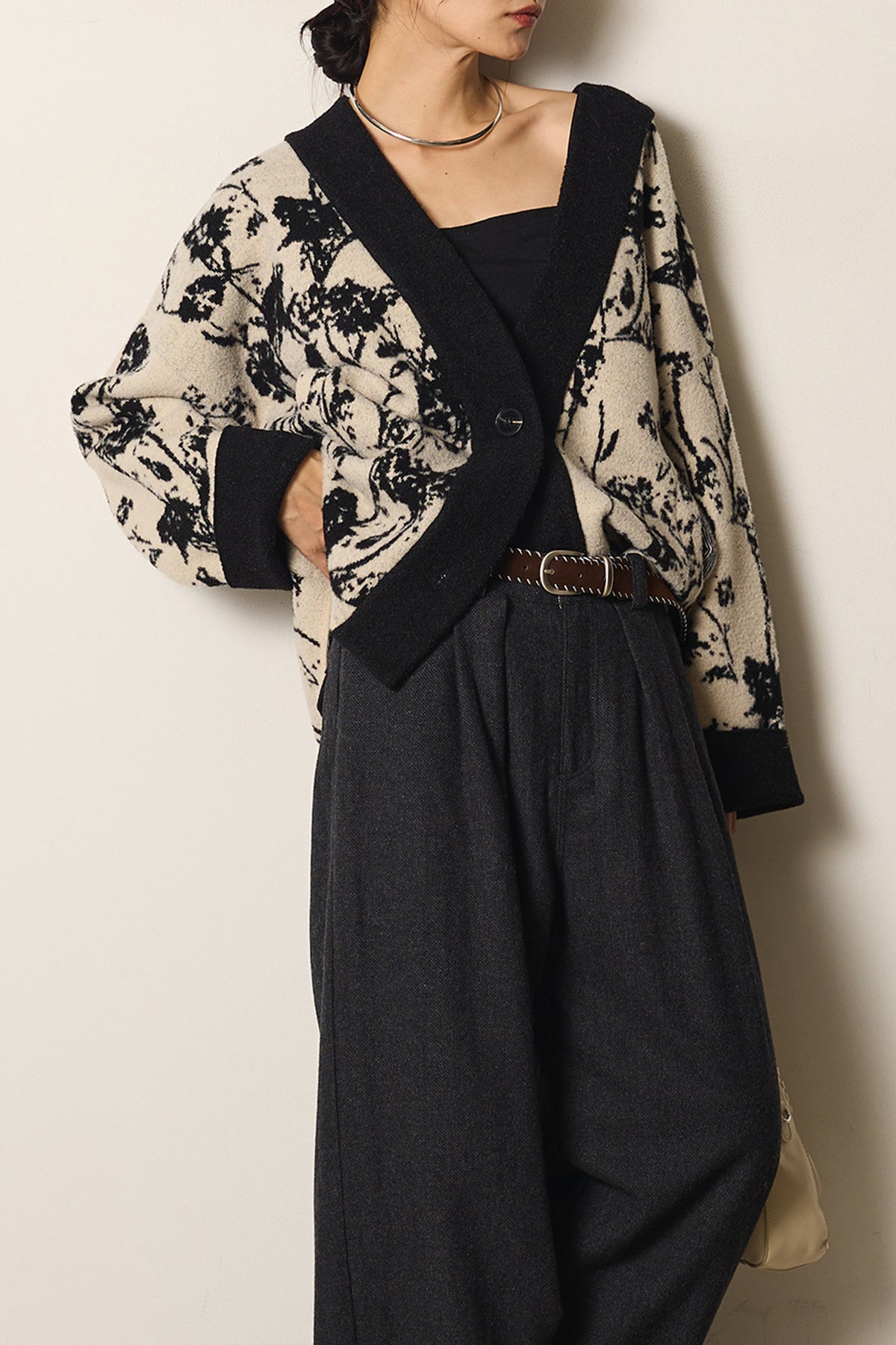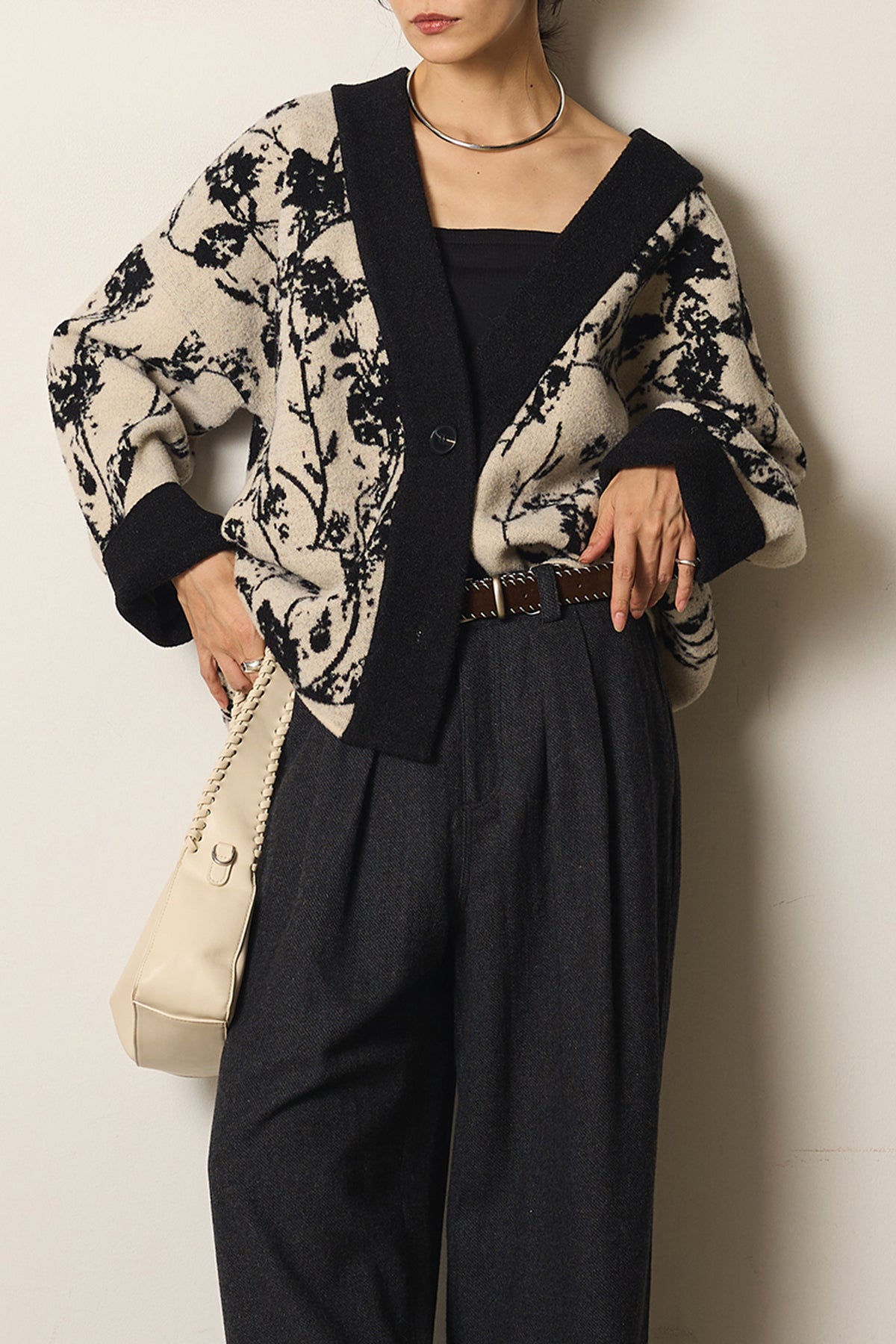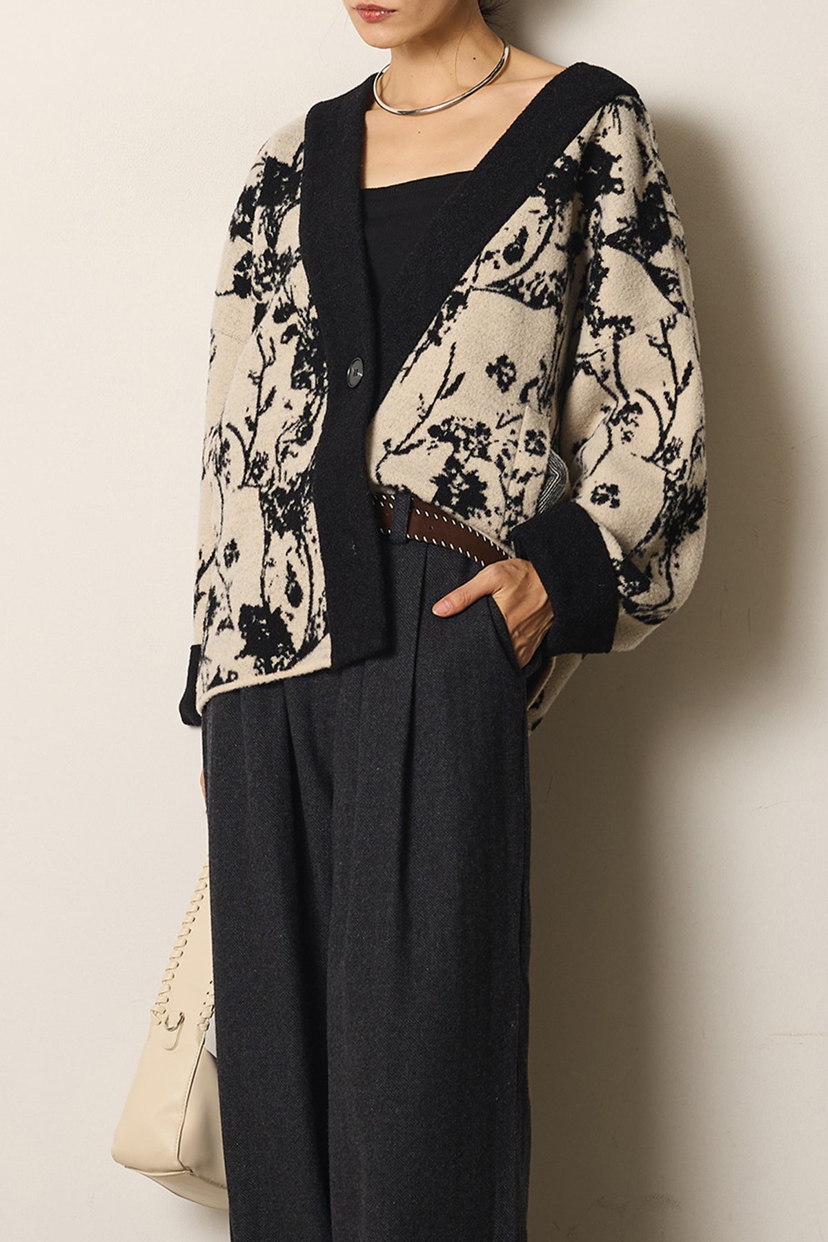 柔らかな素材にボタニカル柄をあしらったニットカーディガン。ゆったりとしたシルエットとドロップショルダーが抜け感を生み、羽織るだけで季節感のあるスタイルに仕上がります。存在感のある柄ながら落ち着いた配色で取り入れやすく、デイリーからお出かけまで活躍する一枚です。