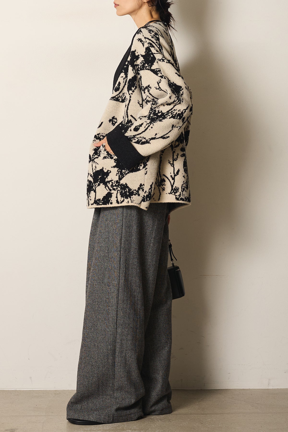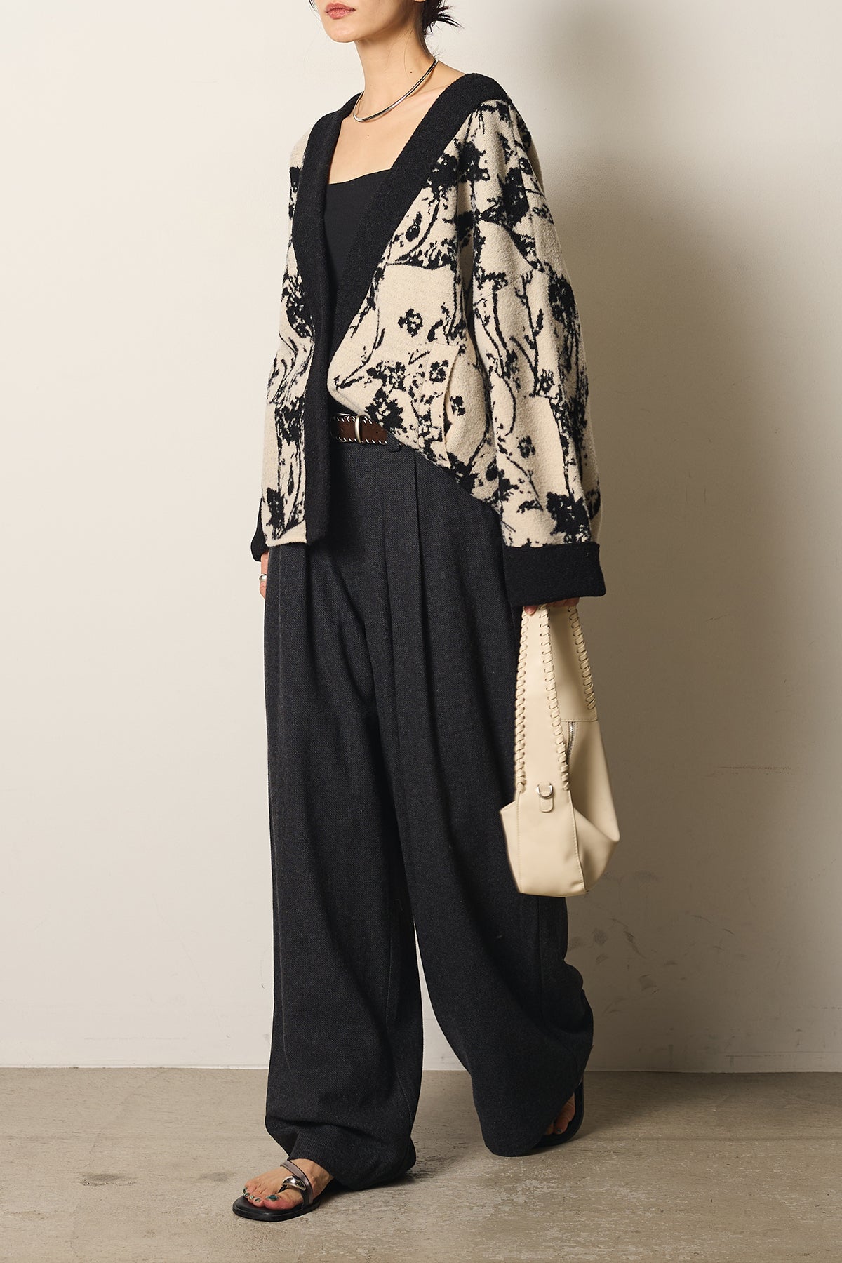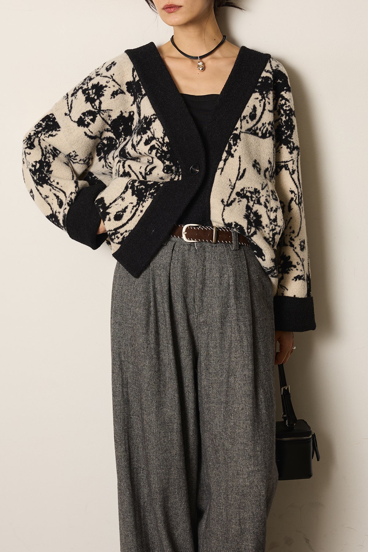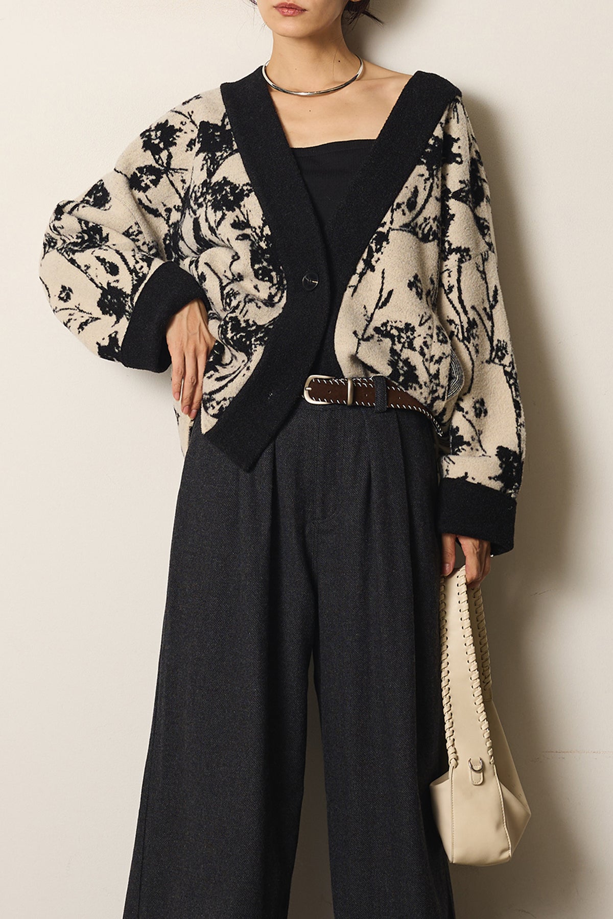 柔らかな素材にボタニカル柄をあしらったニットカーディガン。ゆったりとしたシルエットとドロップショルダーが抜け感を生み、羽織るだけで季節感のあるスタイルに仕上がります。存在感のある柄ながら落ち着いた配色で取り入れやすく、デイリーからお出かけまで活躍する一枚です。
