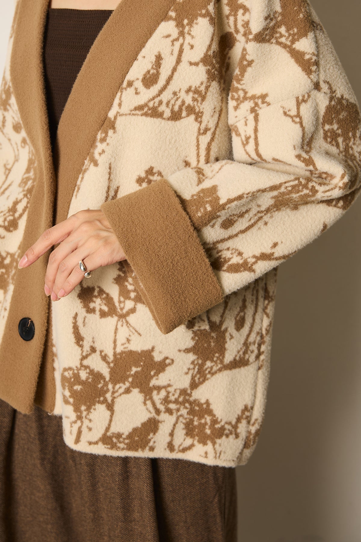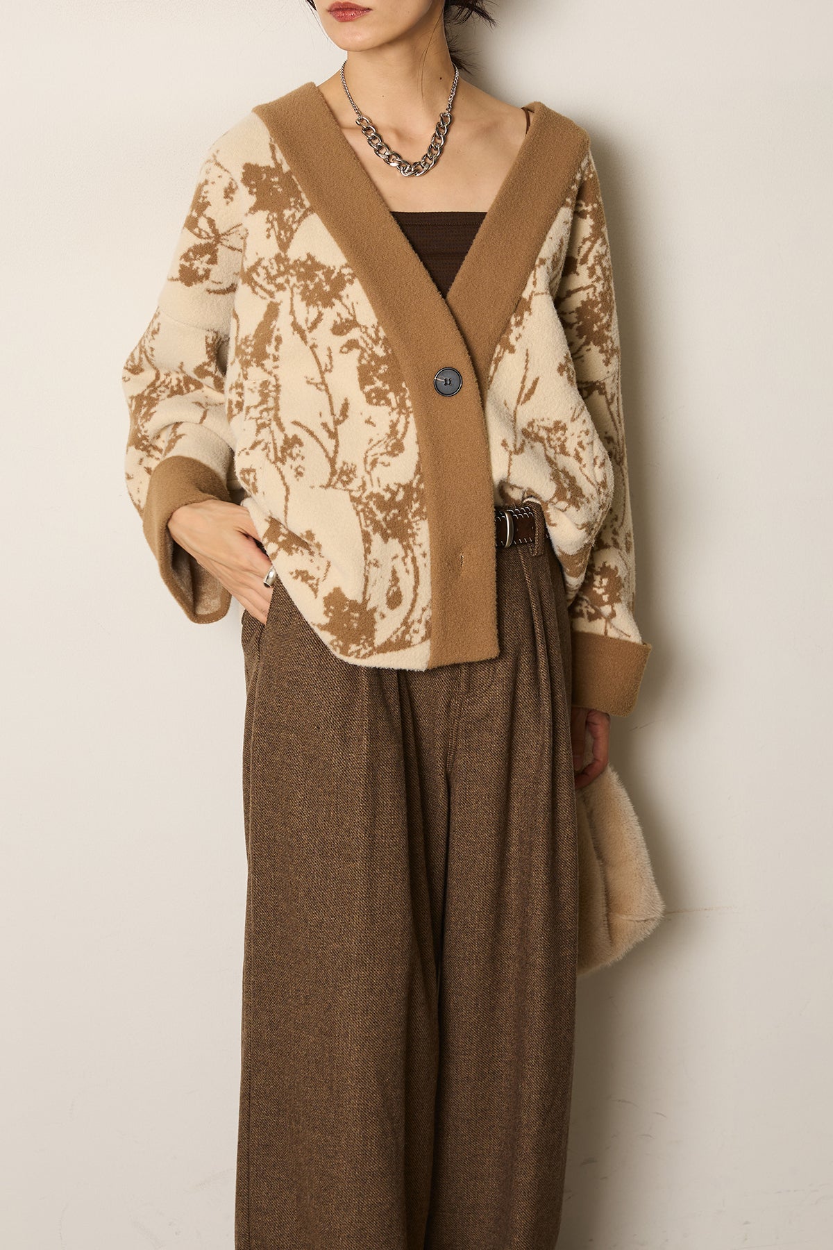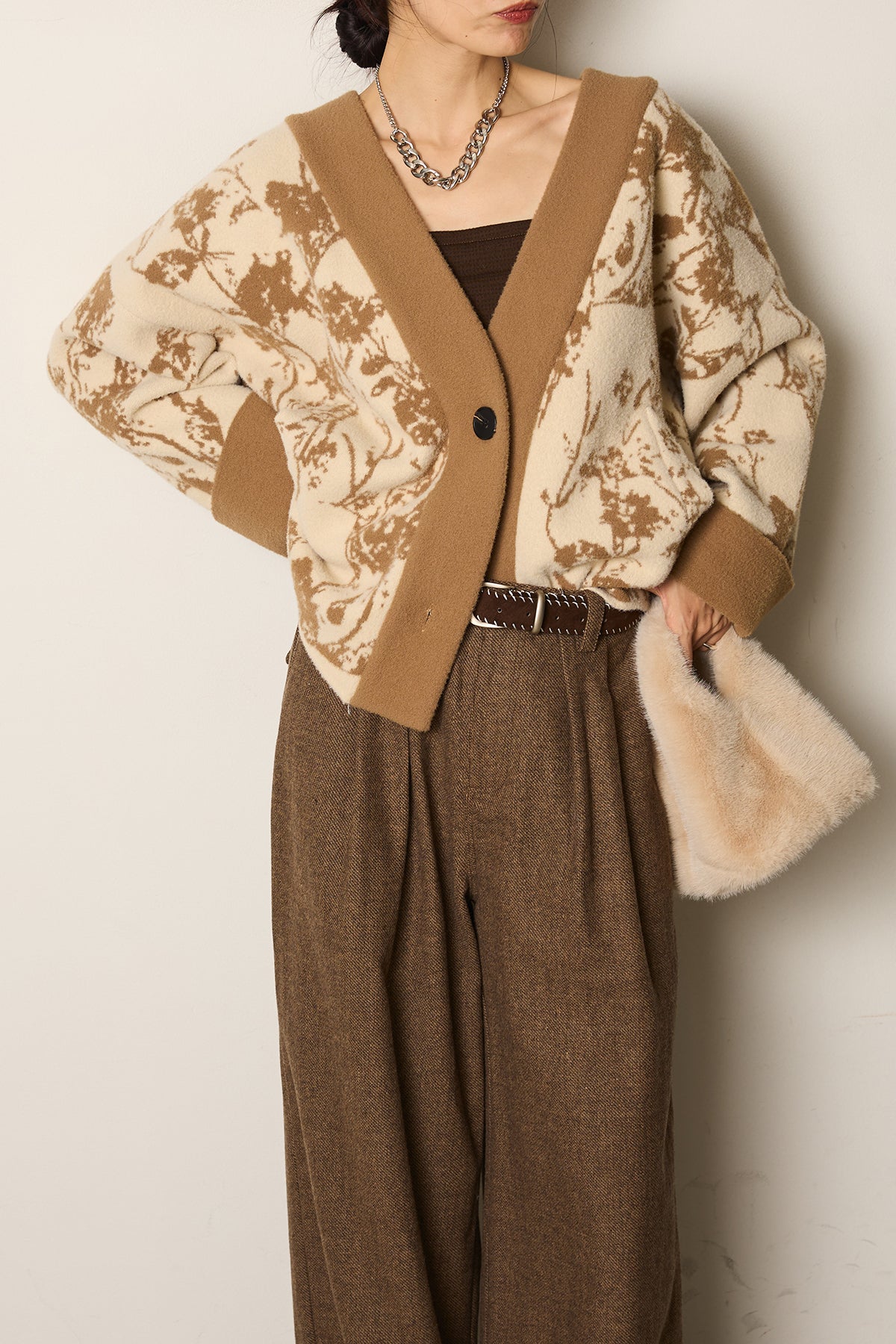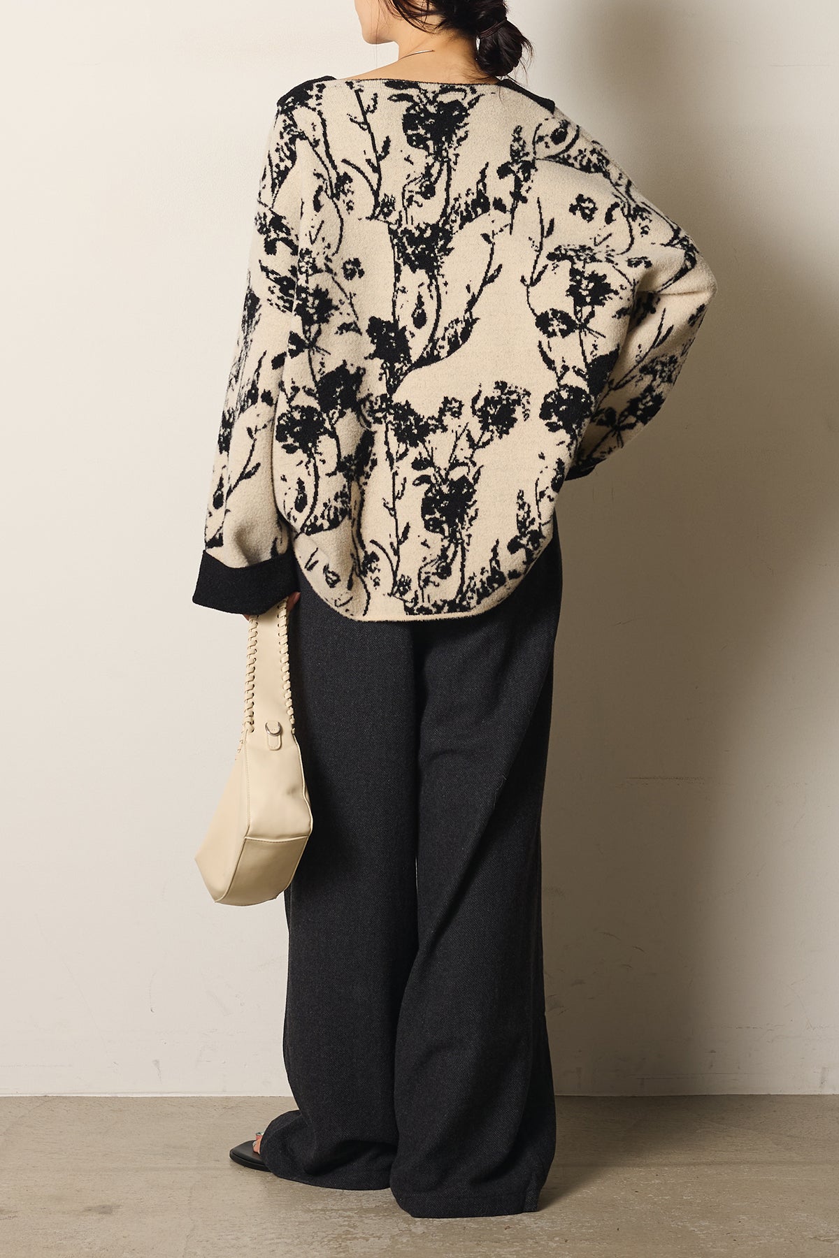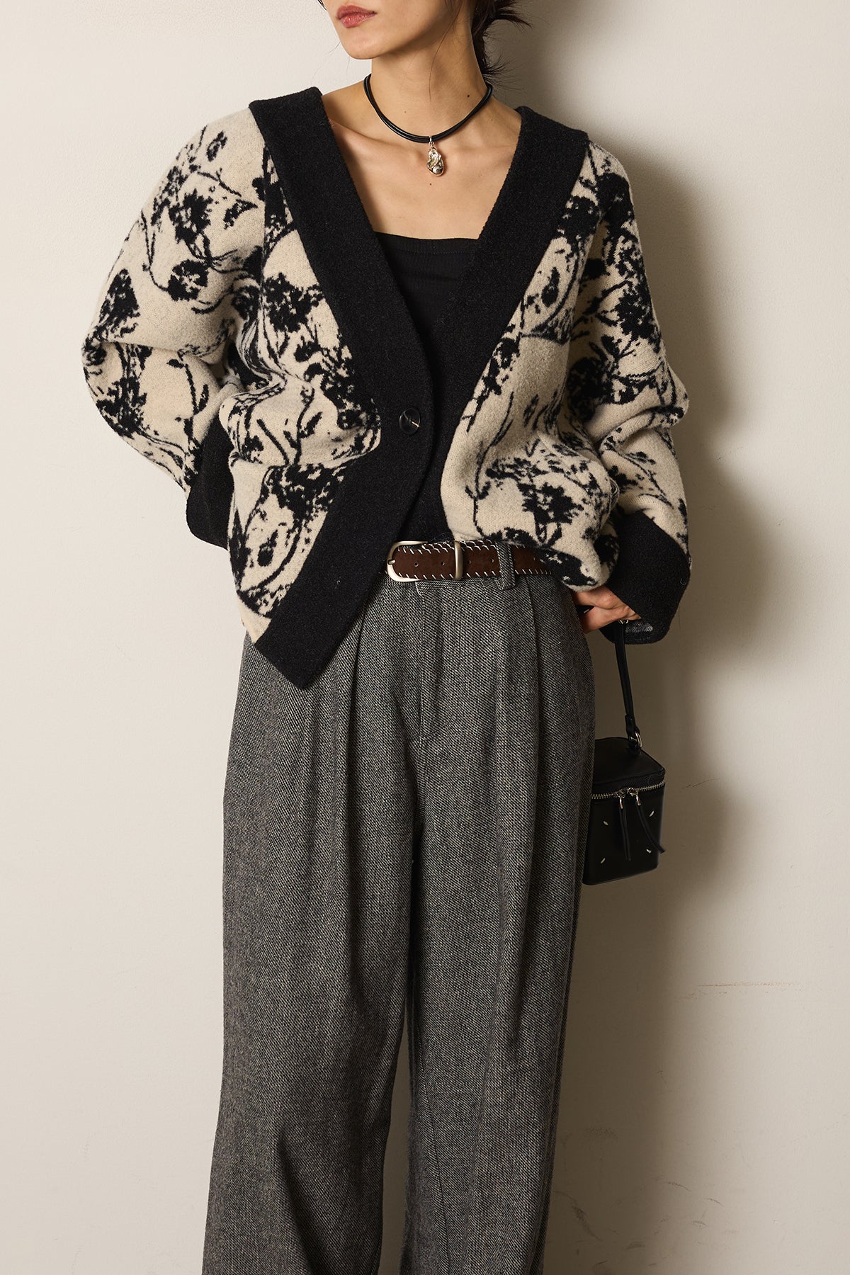 柔らかな素材にボタニカル柄をあしらったニットカーディガン。ゆったりとしたシルエットとドロップショルダーが抜け感を生み、羽織るだけで季節感のあるスタイルに仕上がります。存在感のある柄ながら落ち着いた配色で取り入れやすく、デイリーからお出かけまで活躍する一枚です。