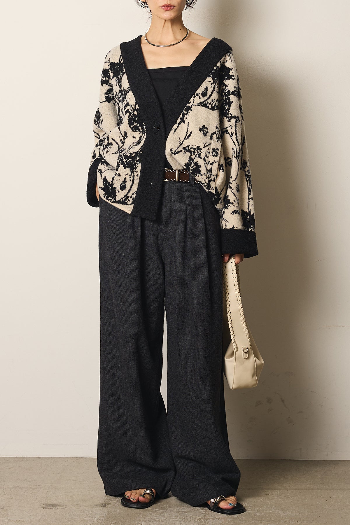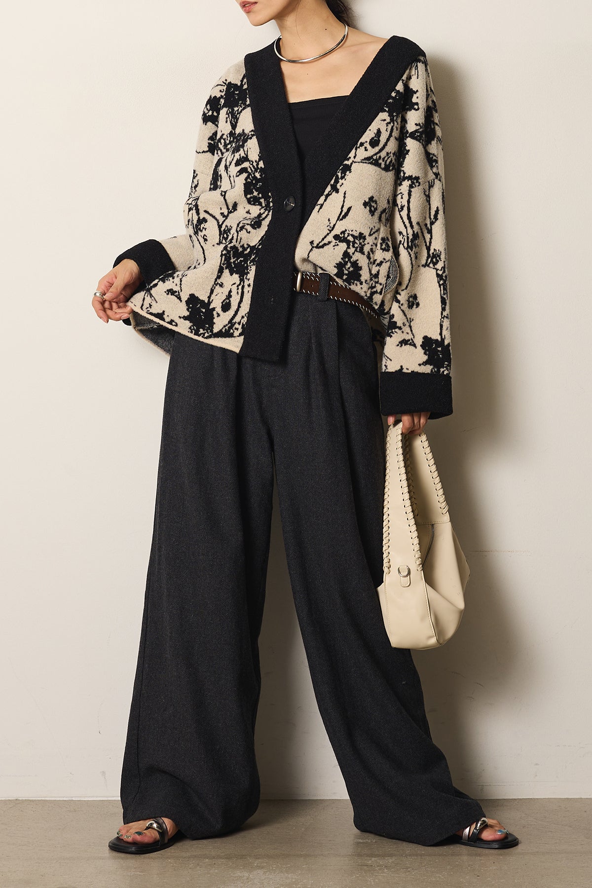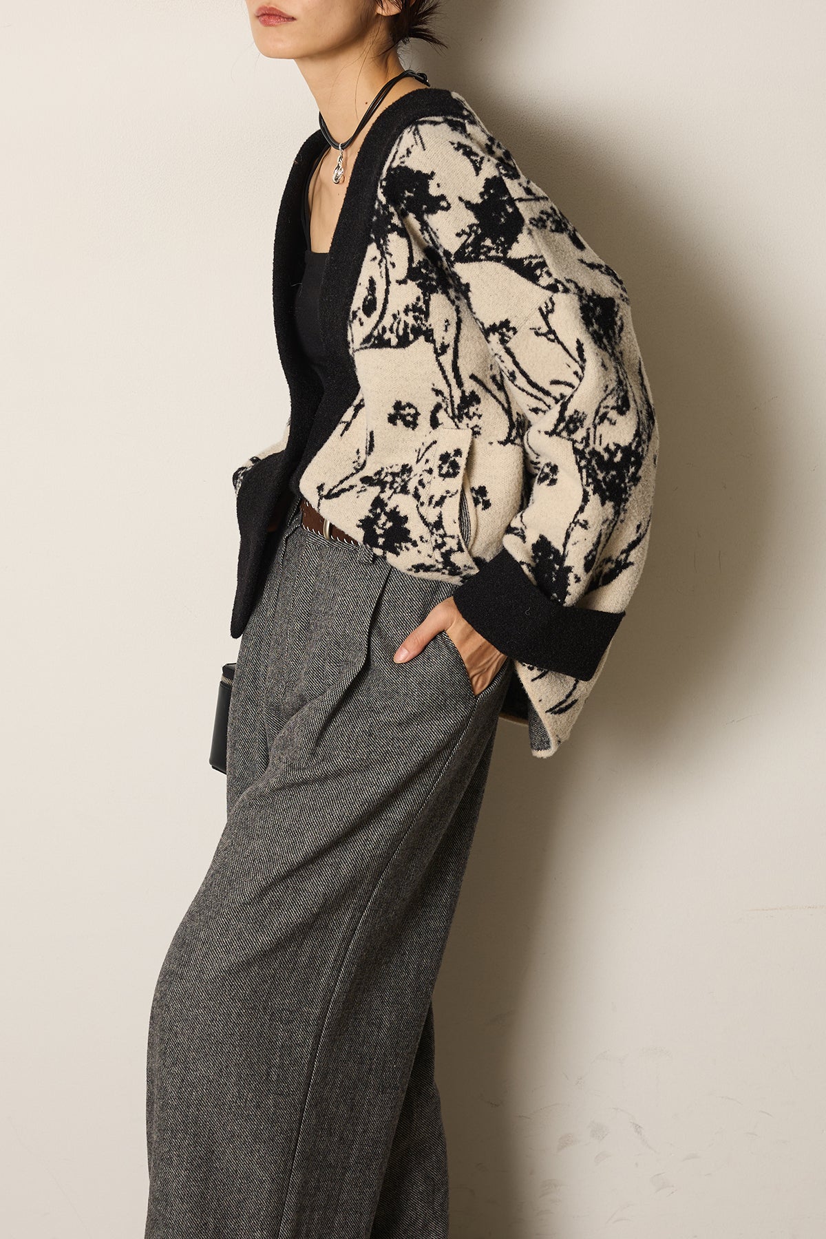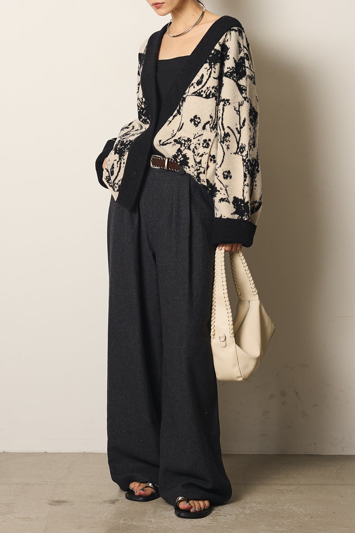 柔らかな素材にボタニカル柄をあしらったニットカーディガン。ゆったりとしたシルエットとドロップショルダーが抜け感を生み、羽織るだけで季節感のあるスタイルに仕上がります。存在感のある柄ながら落ち着いた配色で取り入れやすく、デイリーからお出かけまで活躍する一枚です。