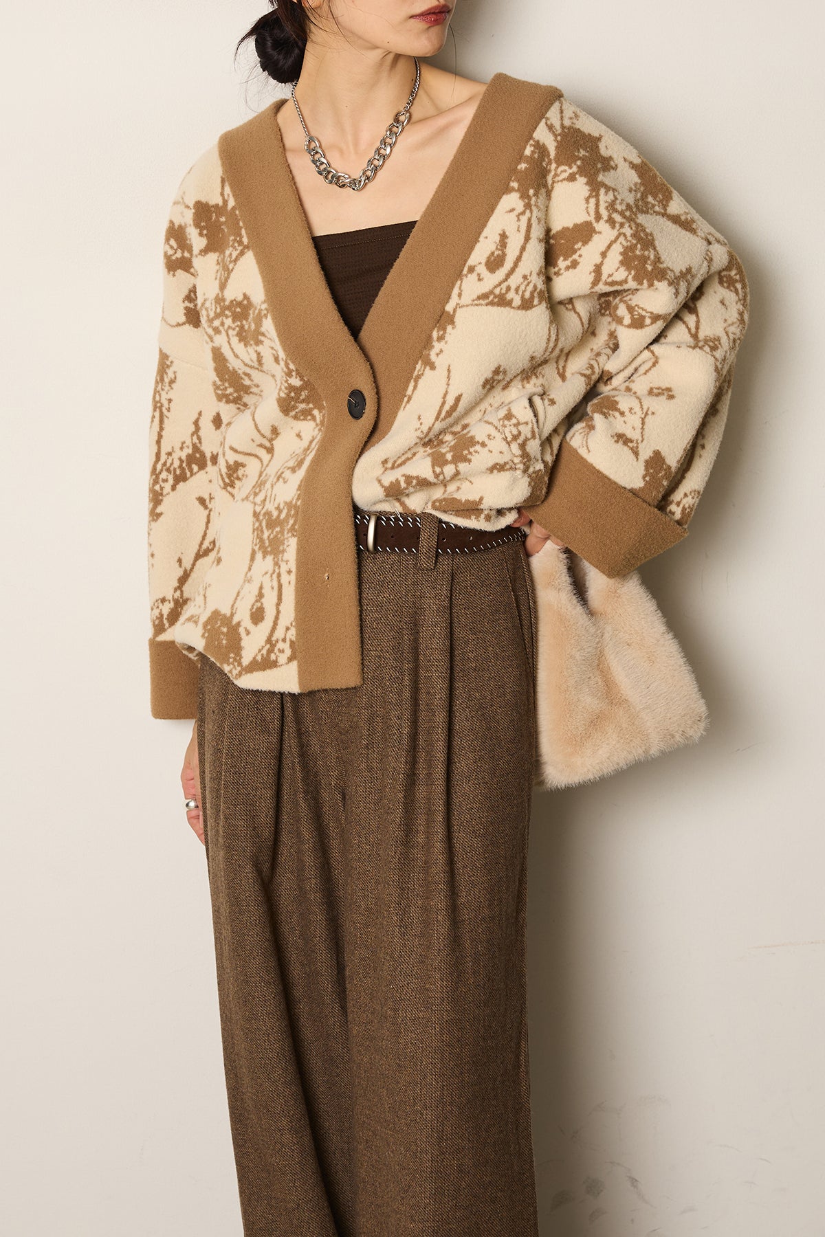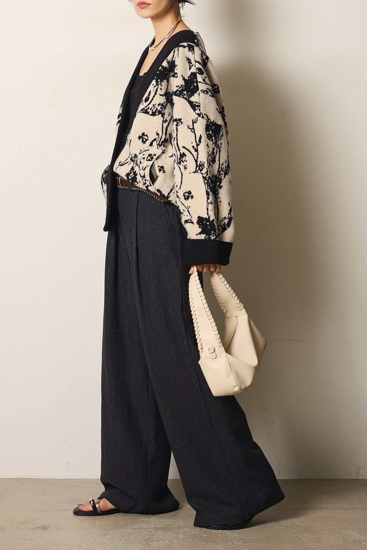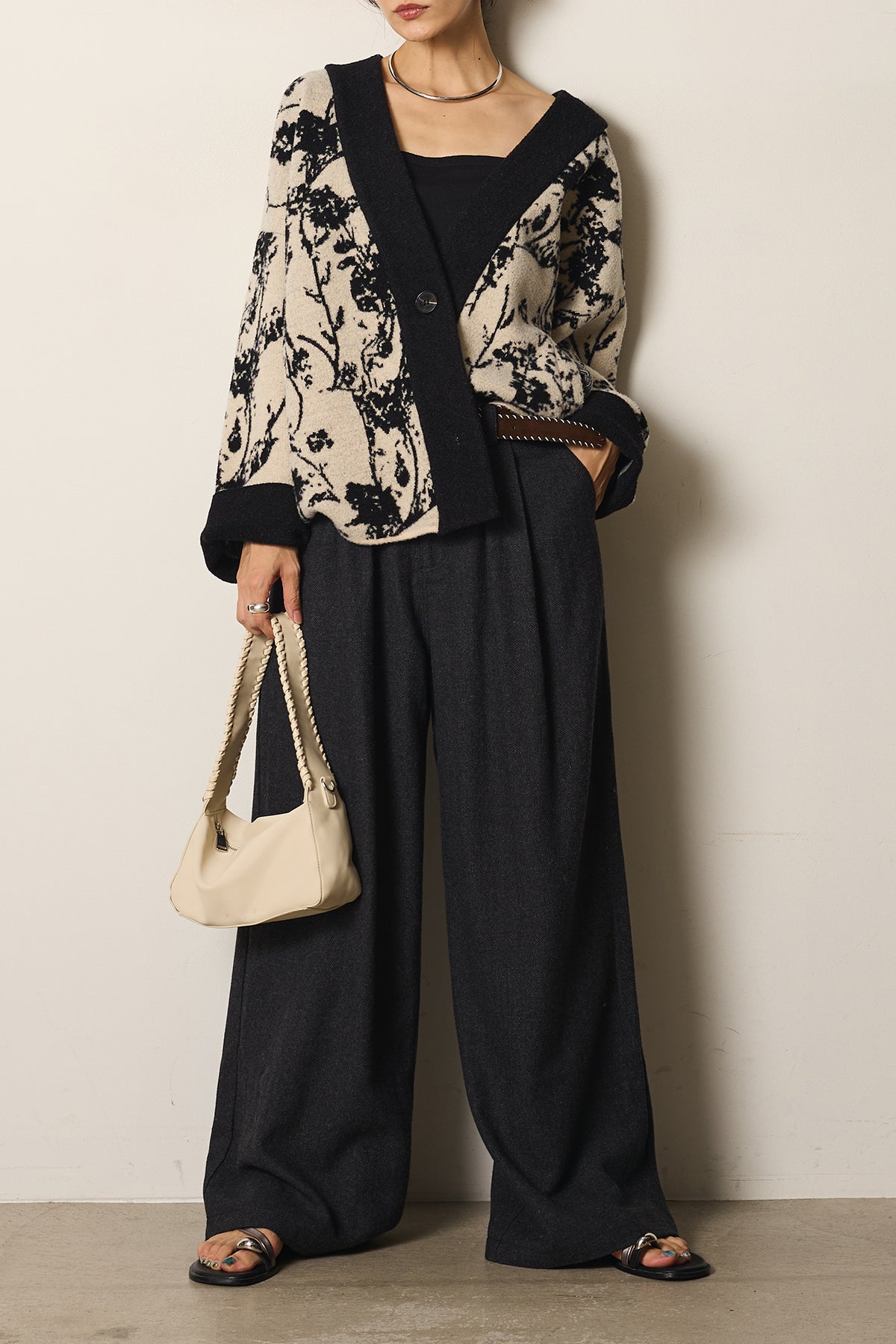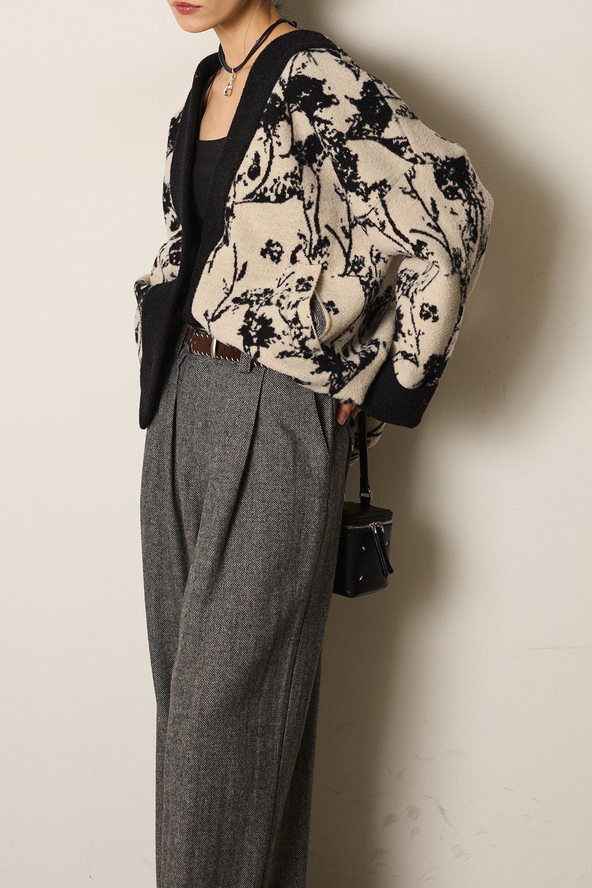 柔らかな素材にボタニカル柄をあしらったニットカーディガン。ゆったりとしたシルエットとドロップショルダーが抜け感を生み、羽織るだけで季節感のあるスタイルに仕上がります。存在感のある柄ながら落ち着いた配色で取り入れやすく、デイリーからお出かけまで活躍する一枚です。