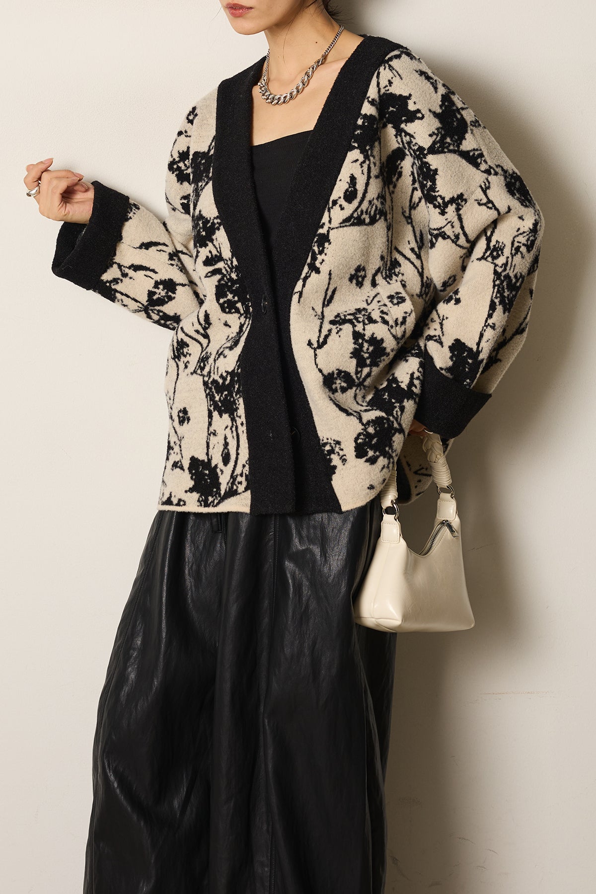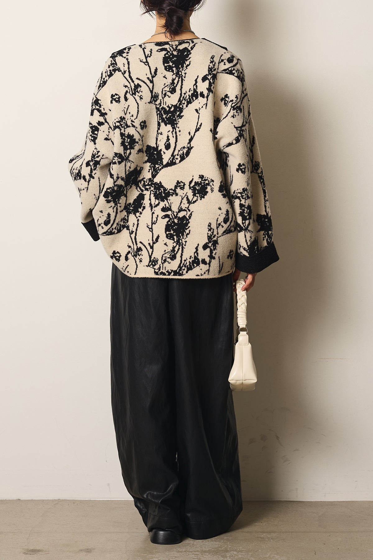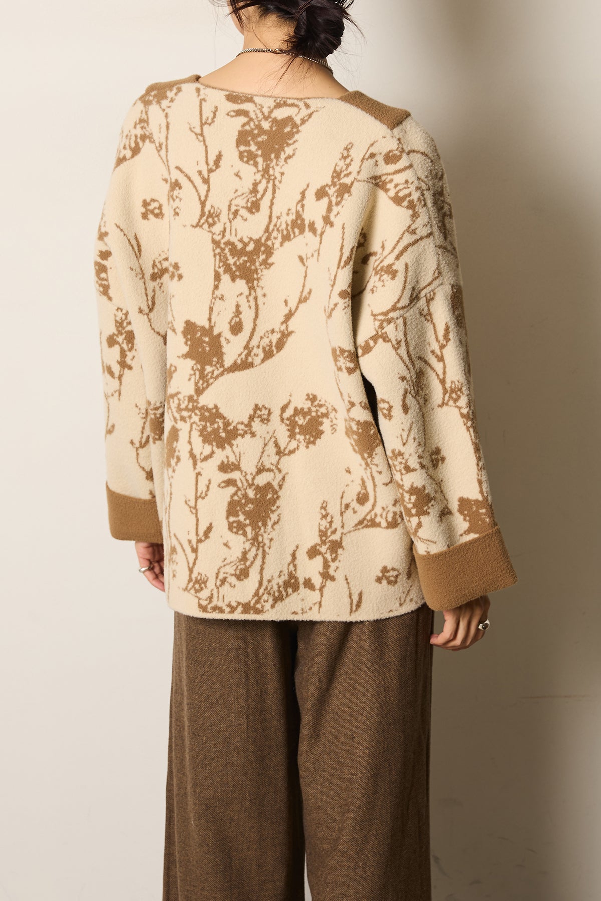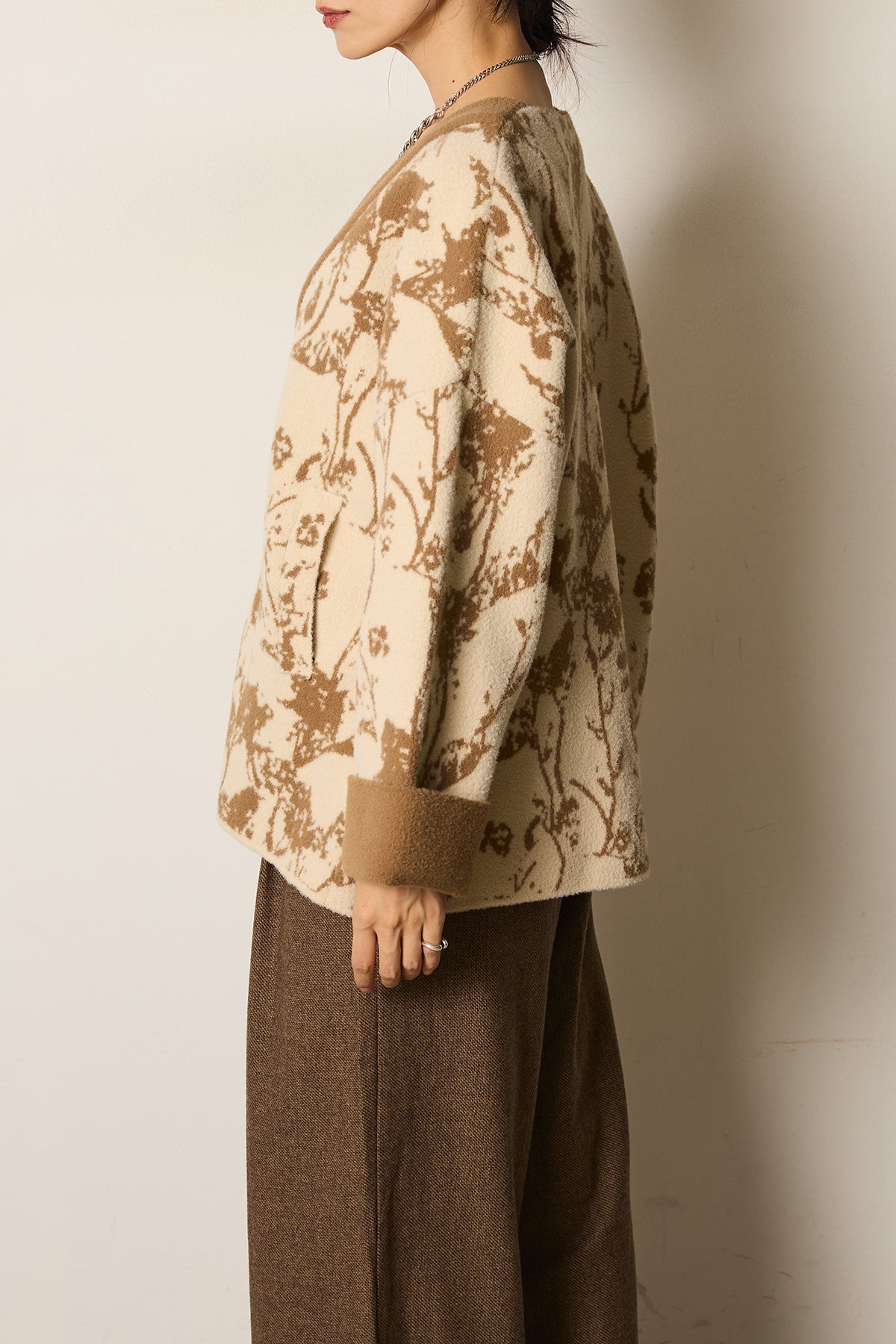 柔らかな素材にボタニカル柄をあしらったニットカーディガン。ゆったりとしたシルエットとドロップショルダーが抜け感を生み、羽織るだけで季節感のあるスタイルに仕上がります。存在感のある柄ながら落ち着いた配色で取り入れやすく、デイリーからお出かけまで活躍する一枚です。