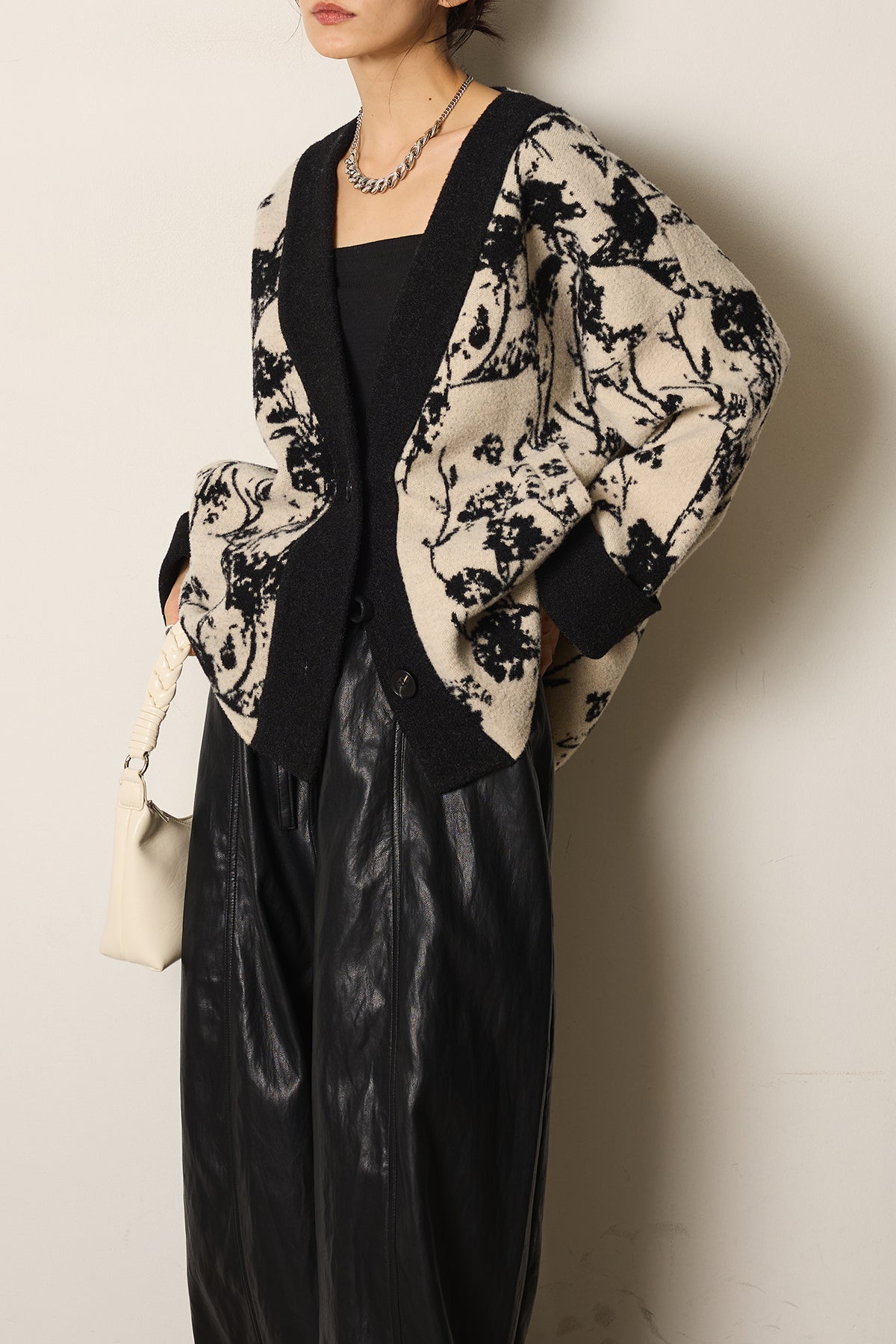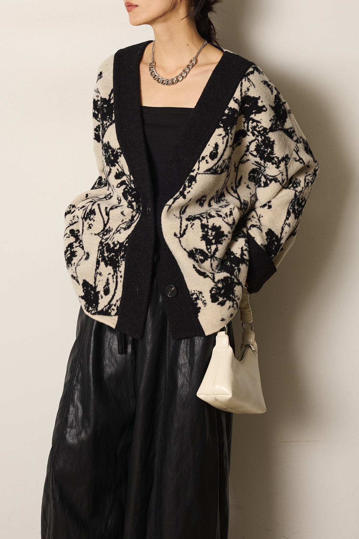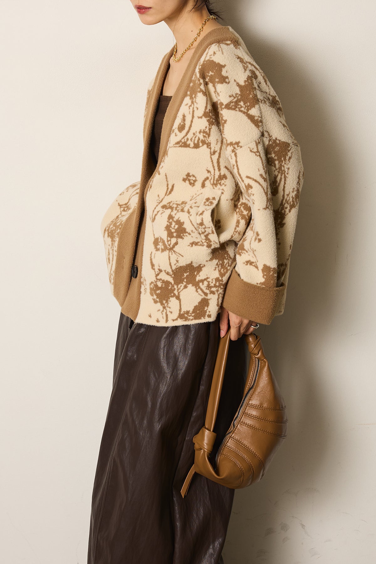 柔らかな素材にボタニカル柄をあしらったニットカーディガン。ゆったりとしたシルエットとドロップショルダーが抜け感を生み、羽織るだけで季節感のあるスタイルに仕上がります。存在感のある柄ながら落ち着いた配色で取り入れやすく、デイリーからお出かけまで活躍する一枚です。