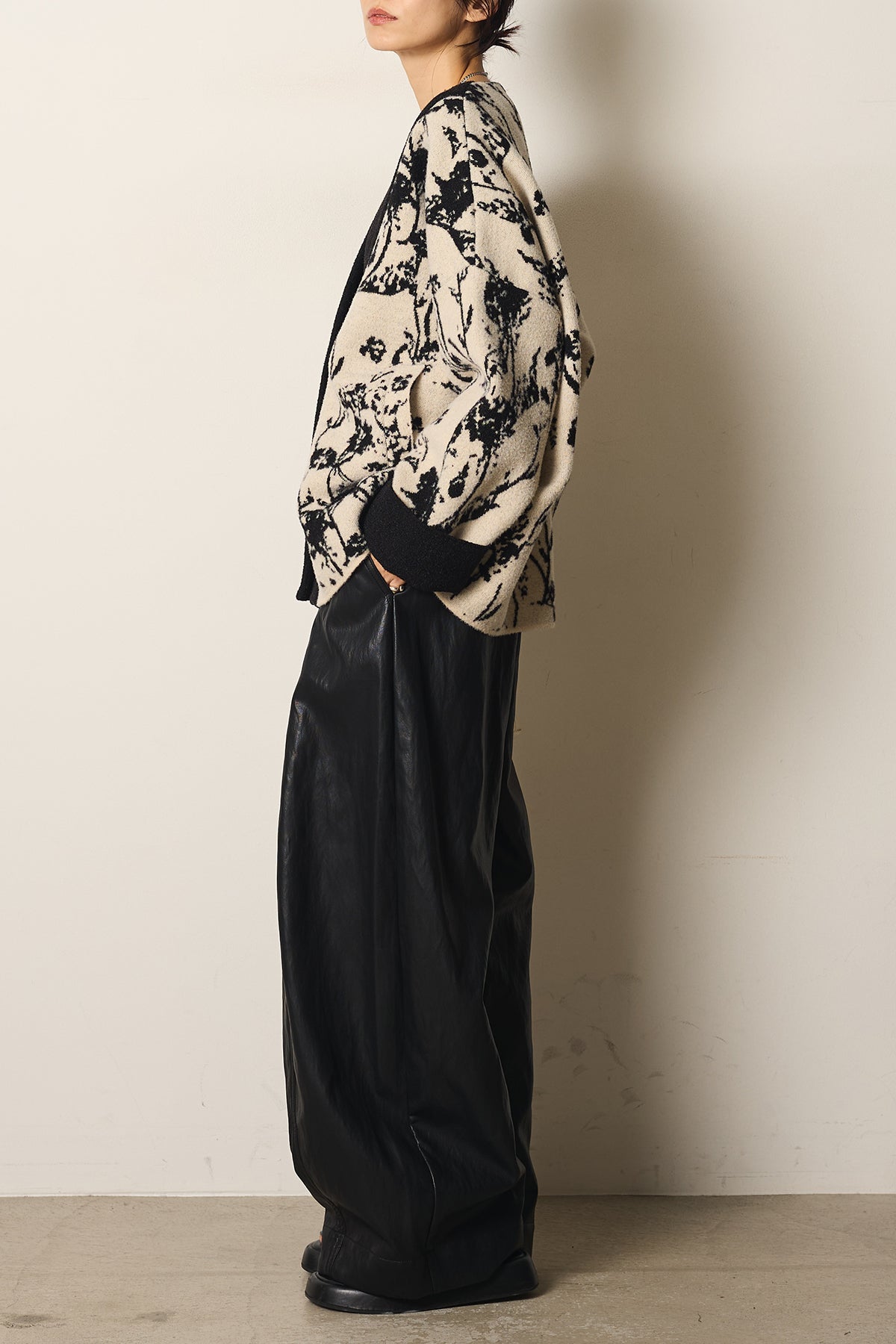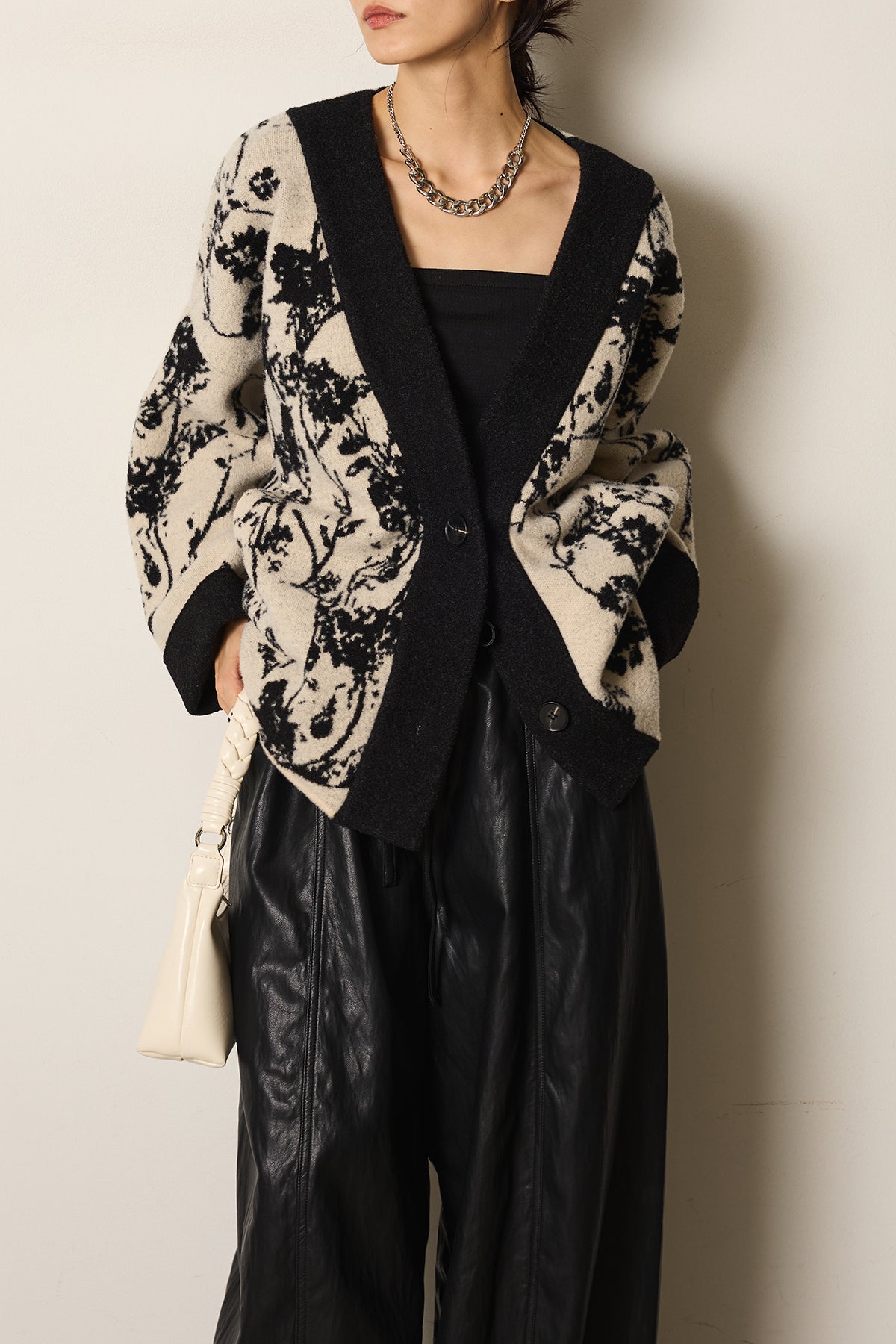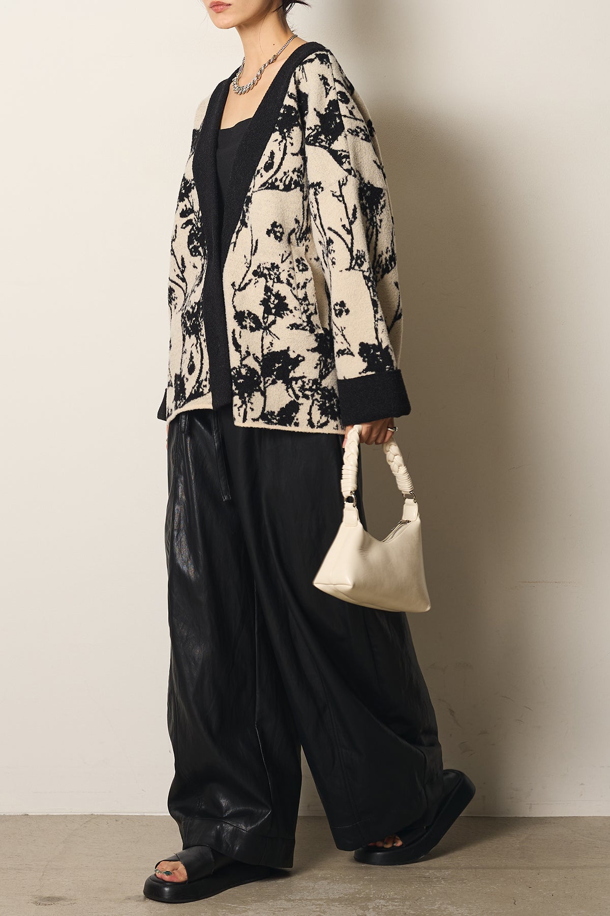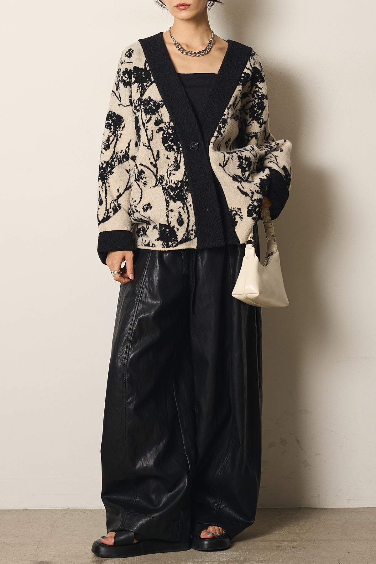 柔らかな素材にボタニカル柄をあしらったニットカーディガン。ゆったりとしたシルエットとドロップショルダーが抜け感を生み、羽織るだけで季節感のあるスタイルに仕上がります。存在感のある柄ながら落ち着いた配色で取り入れやすく、デイリーからお出かけまで活躍する一枚です。