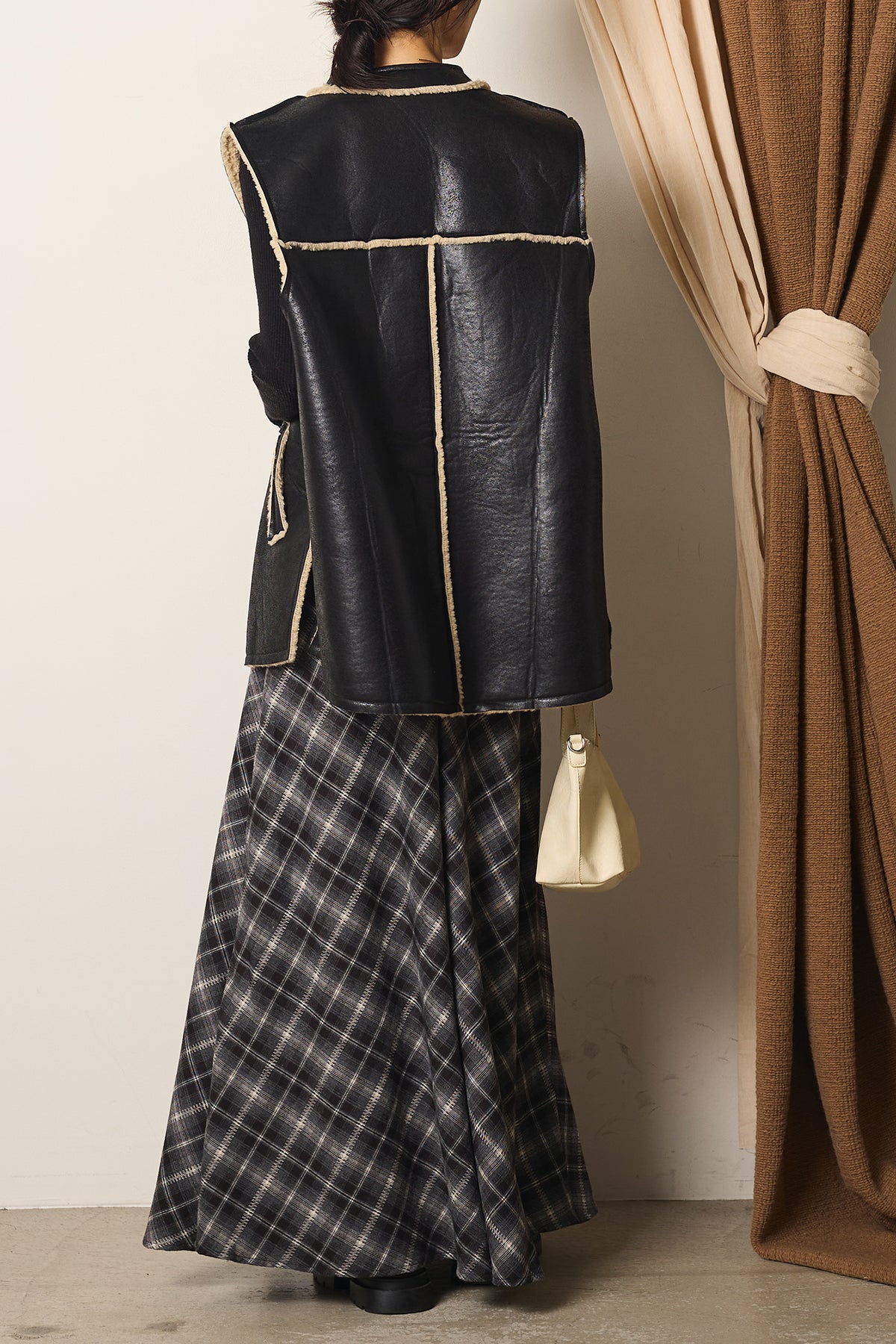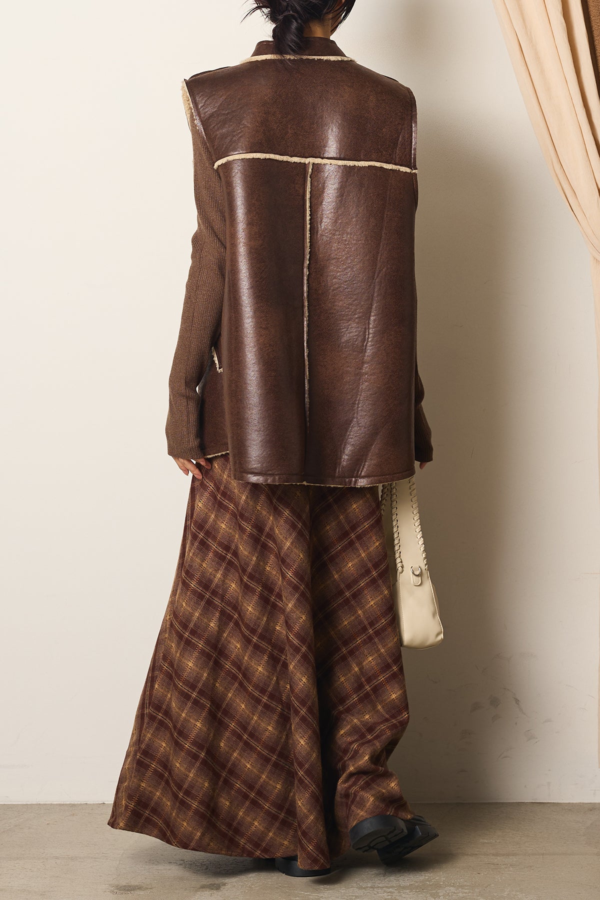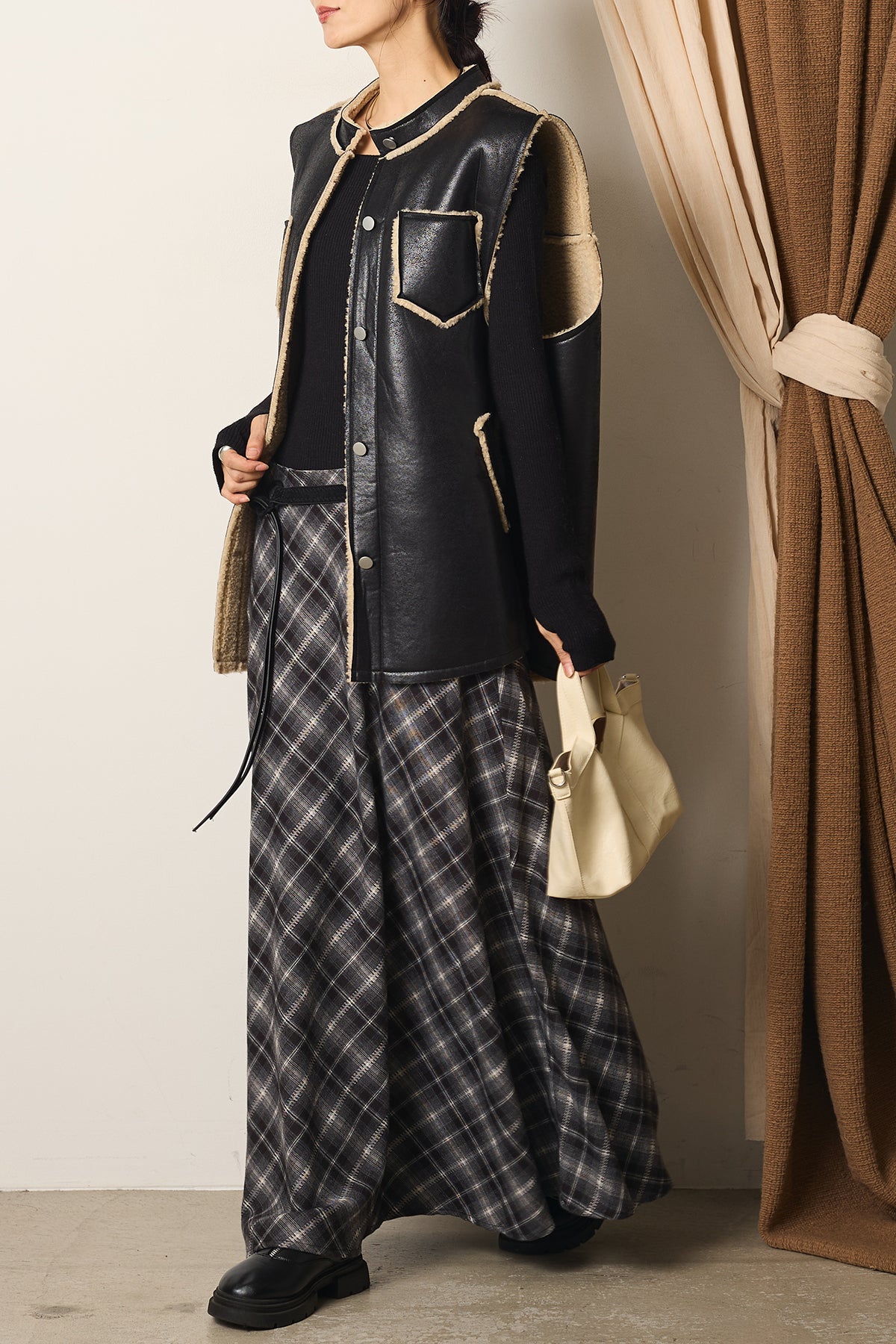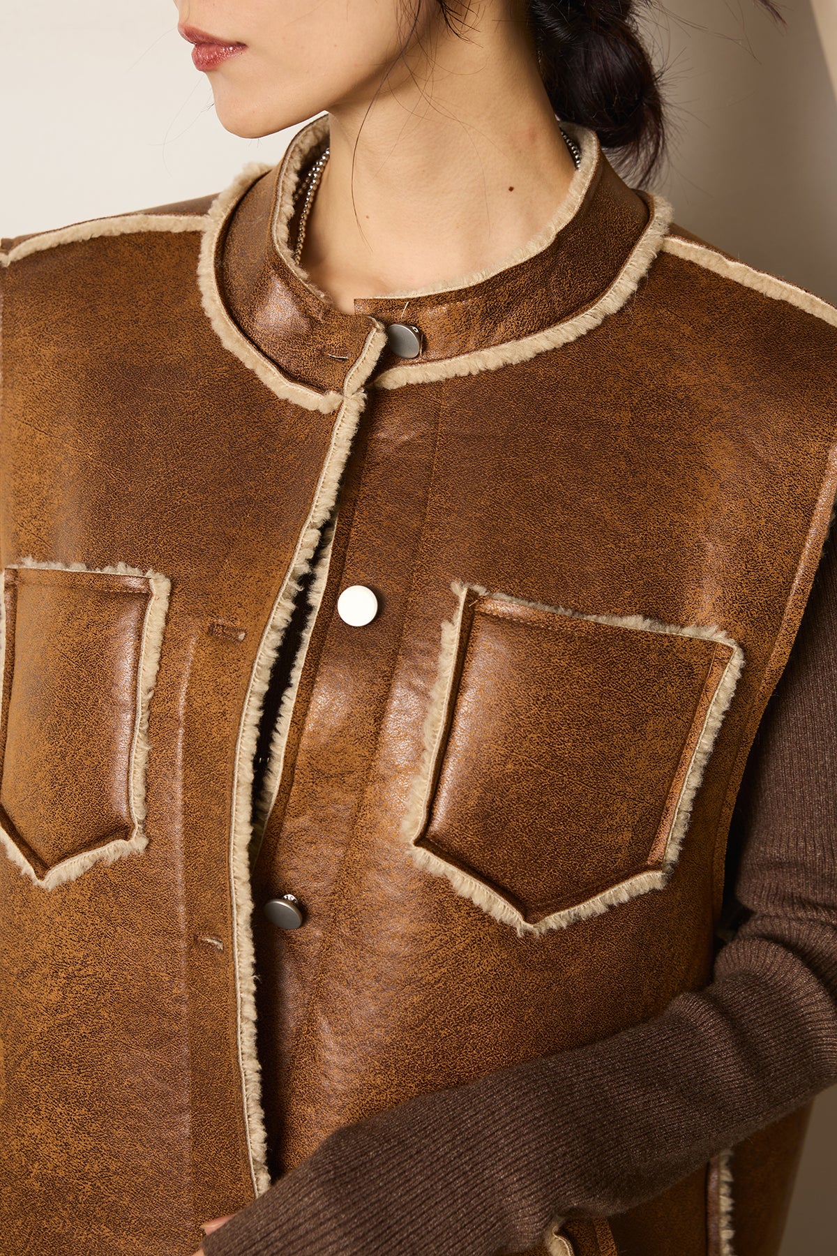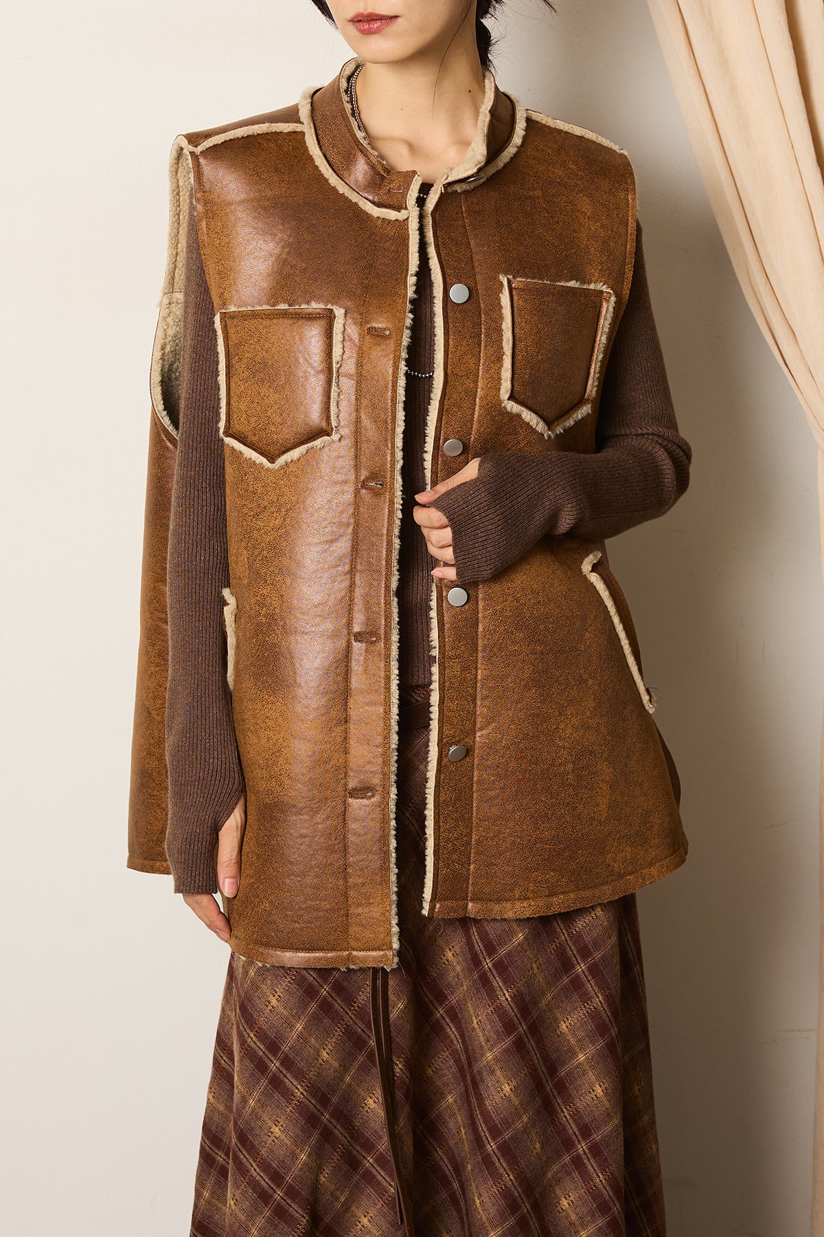 艶感のあるフェイクレザーにムートン調の裏地を合わせたベスト。異素材のコントラストがスタイリングに奥行きを与え、羽織るだけでモードな雰囲気をプラスします。ゆとりのあるシルエットでレイヤードしやすく、季節の変わり目から冬本番まで活躍する一枚です。