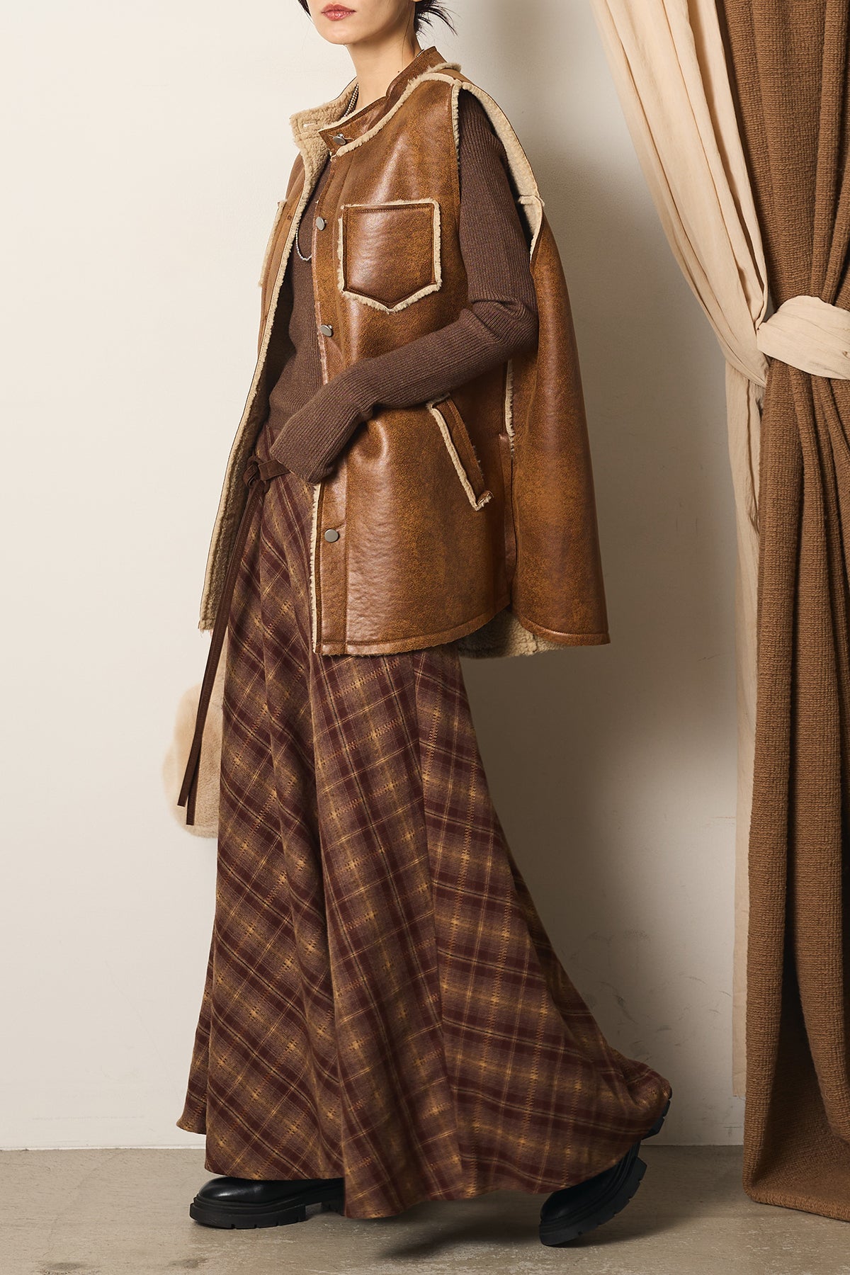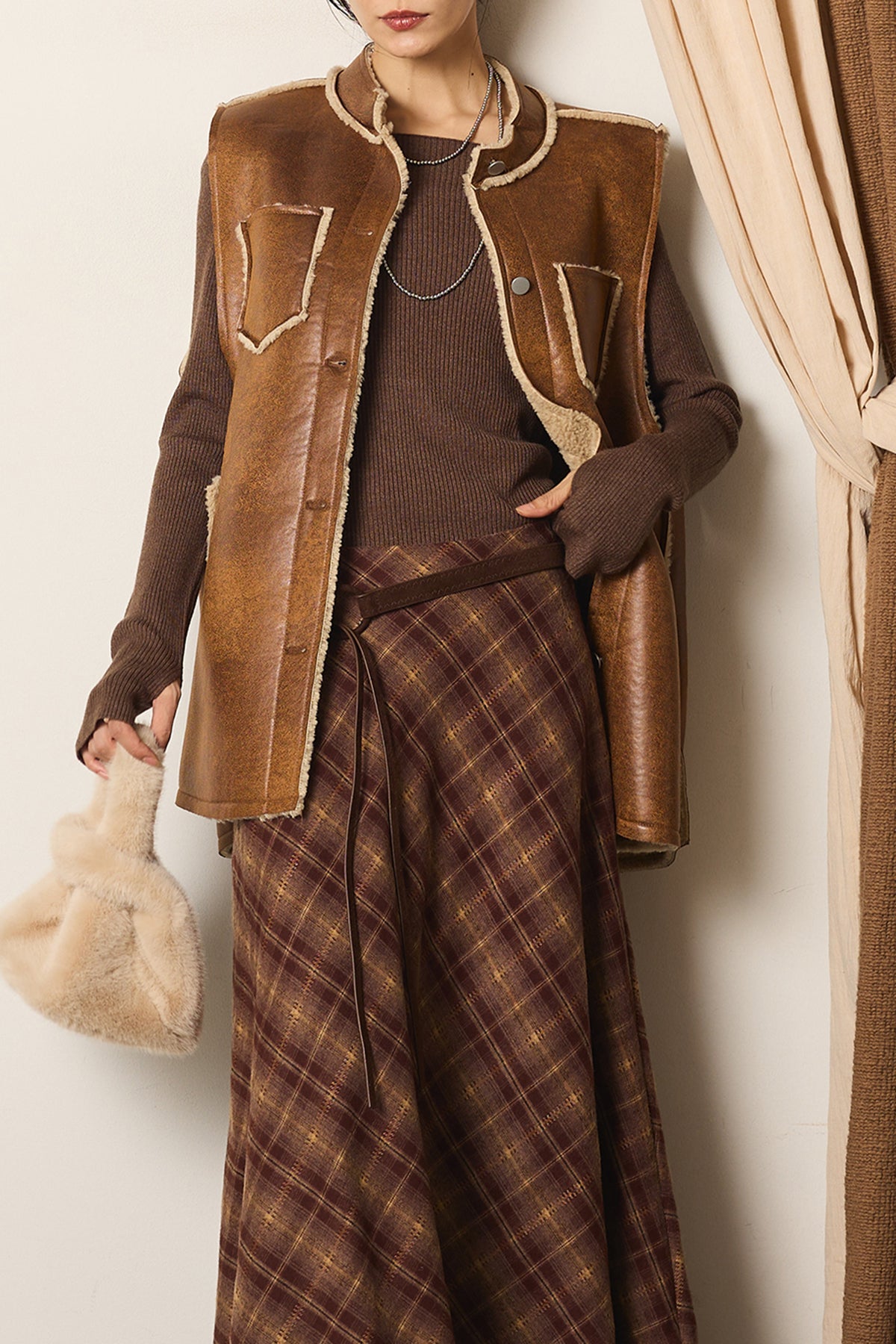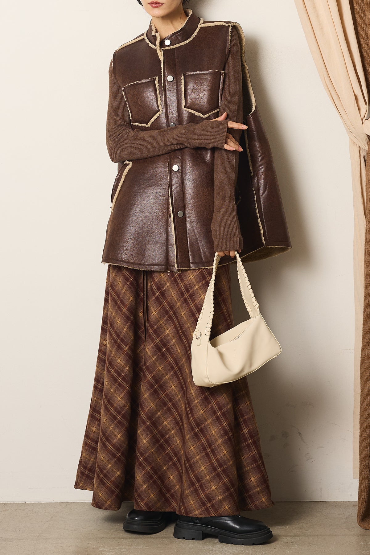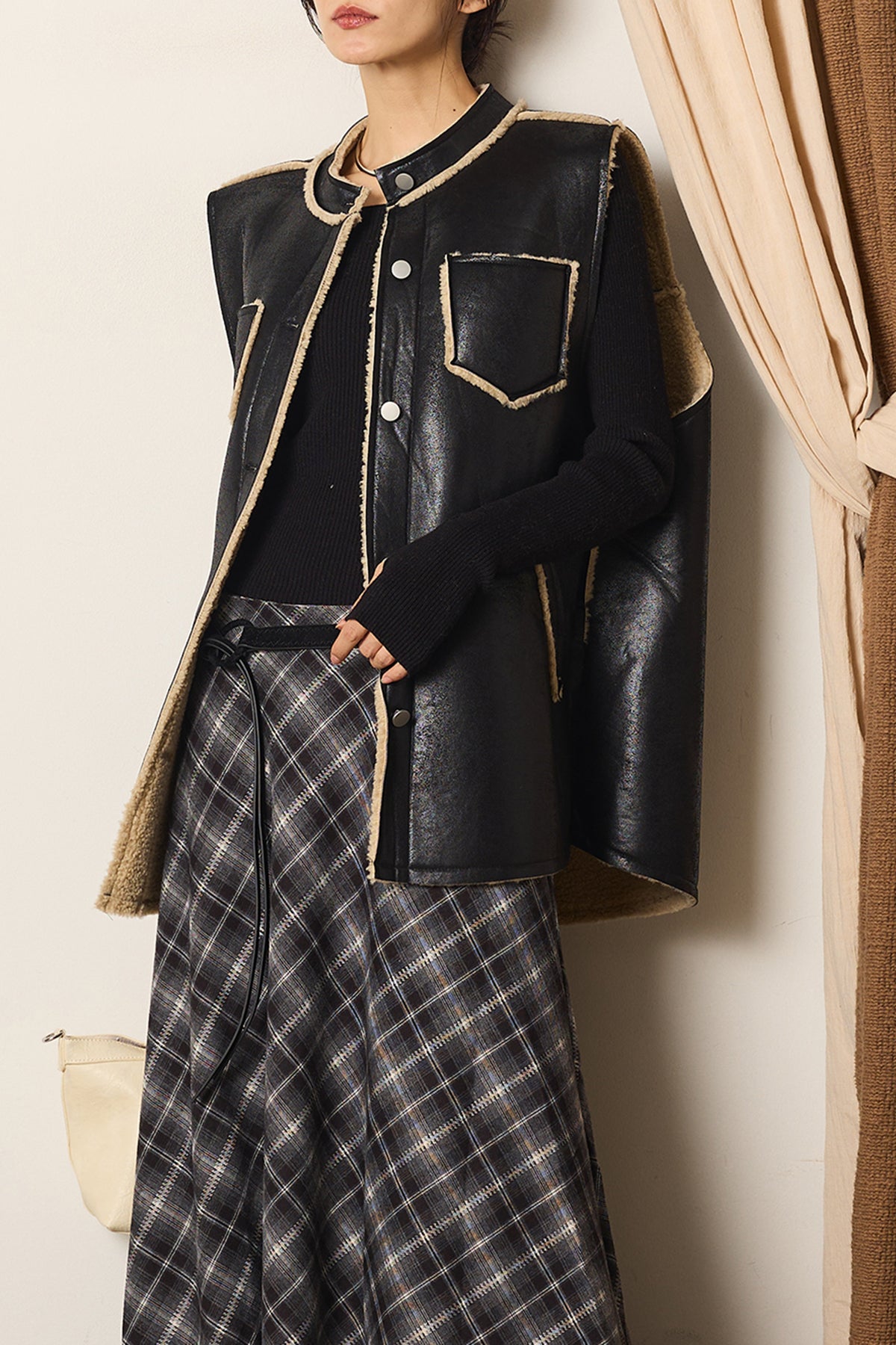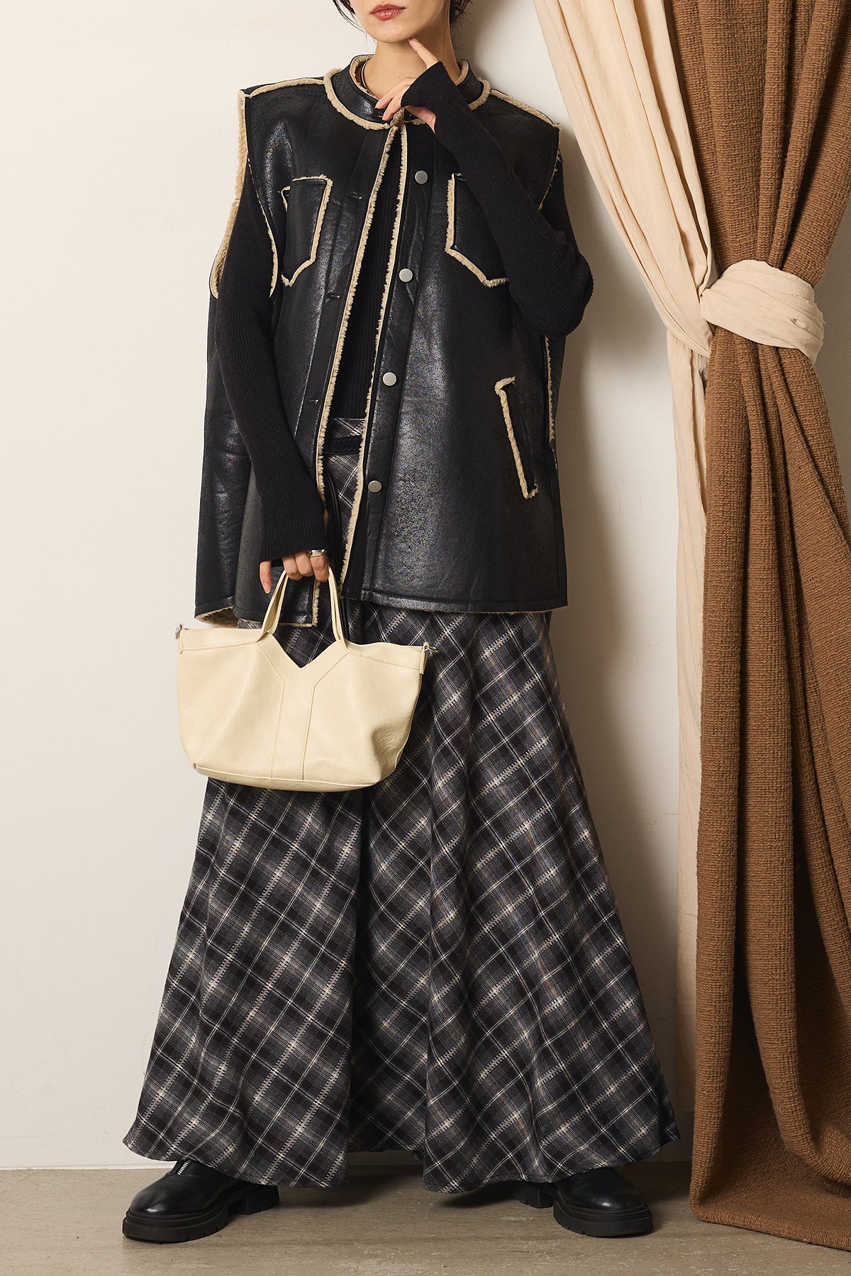 艶感のあるフェイクレザーにムートン調の裏地を合わせたベスト。異素材のコントラストがスタイリングに奥行きを与え、羽織るだけでモードな雰囲気をプラスします。ゆとりのあるシルエットでレイヤードしやすく、季節の変わり目から冬本番まで活躍する一枚です。