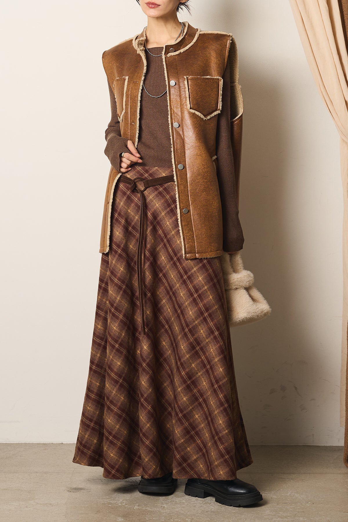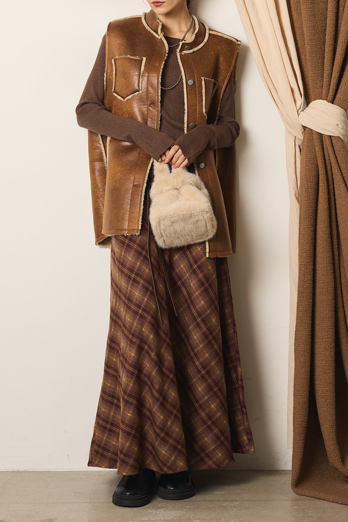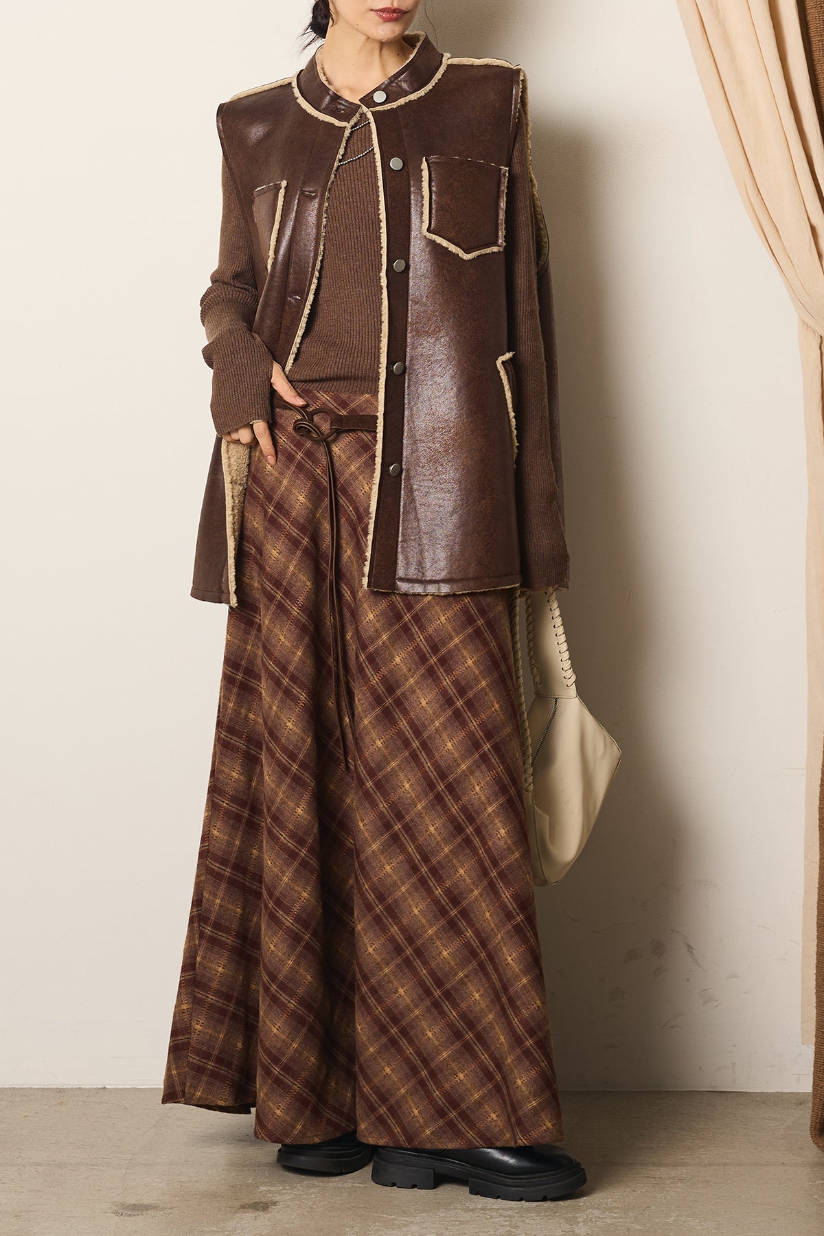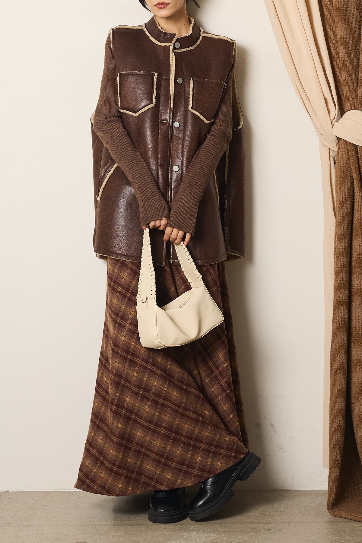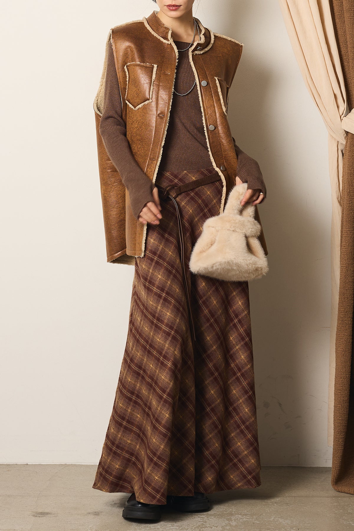 艶感のあるフェイクレザーにムートン調の裏地を合わせたベスト。異素材のコントラストがスタイリングに奥行きを与え、羽織るだけでモードな雰囲気をプラスします。ゆとりのあるシルエットでレイヤードしやすく、季節の変わり目から冬本番まで活躍する一枚です。