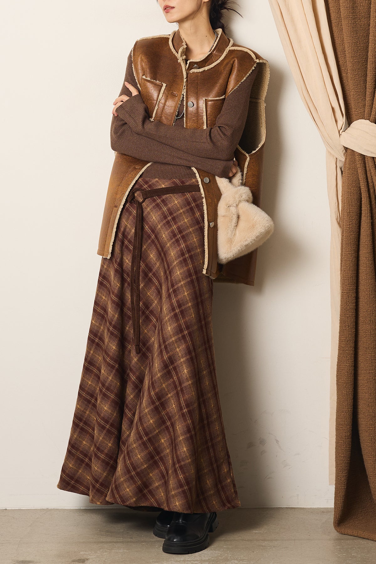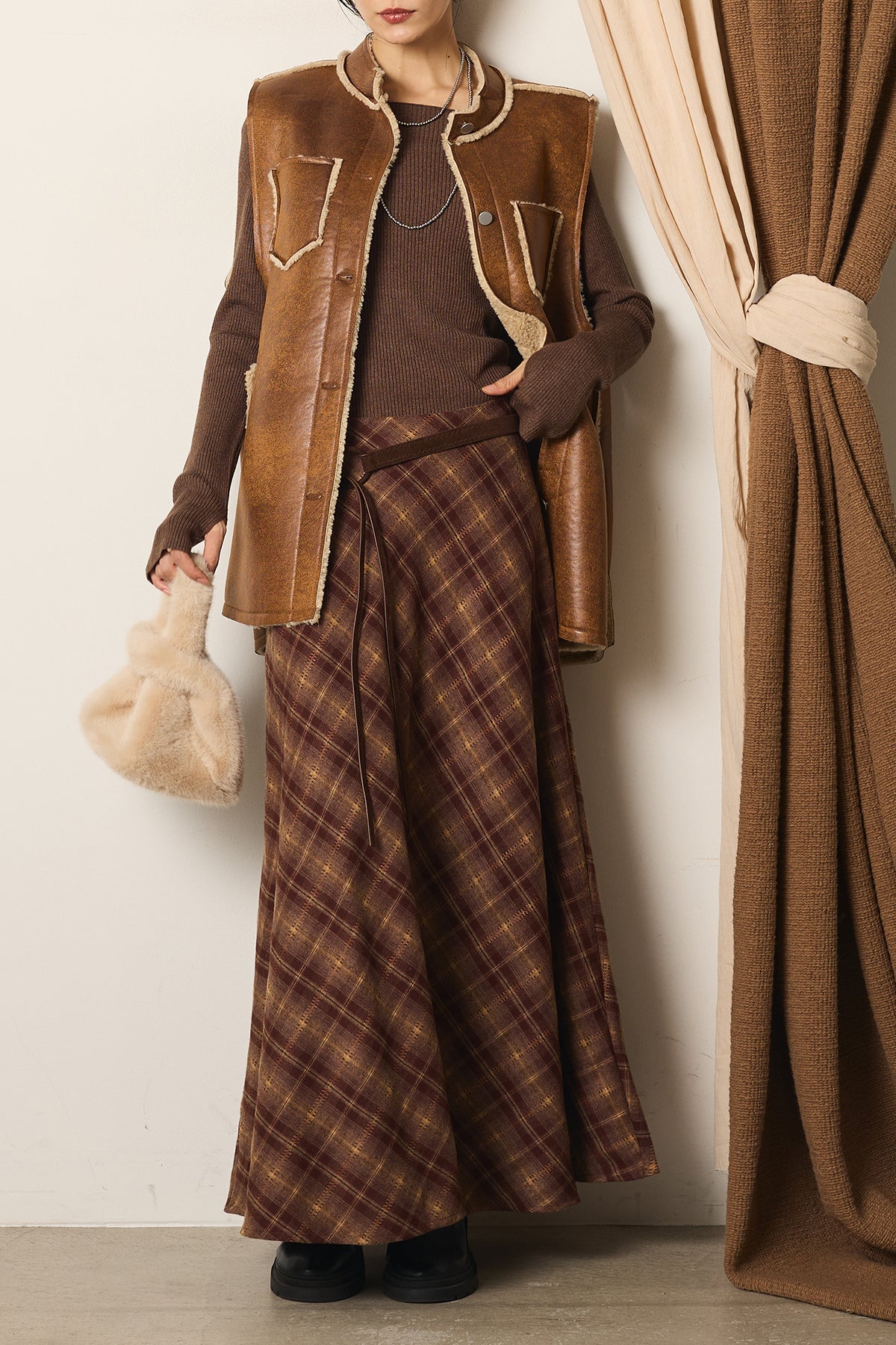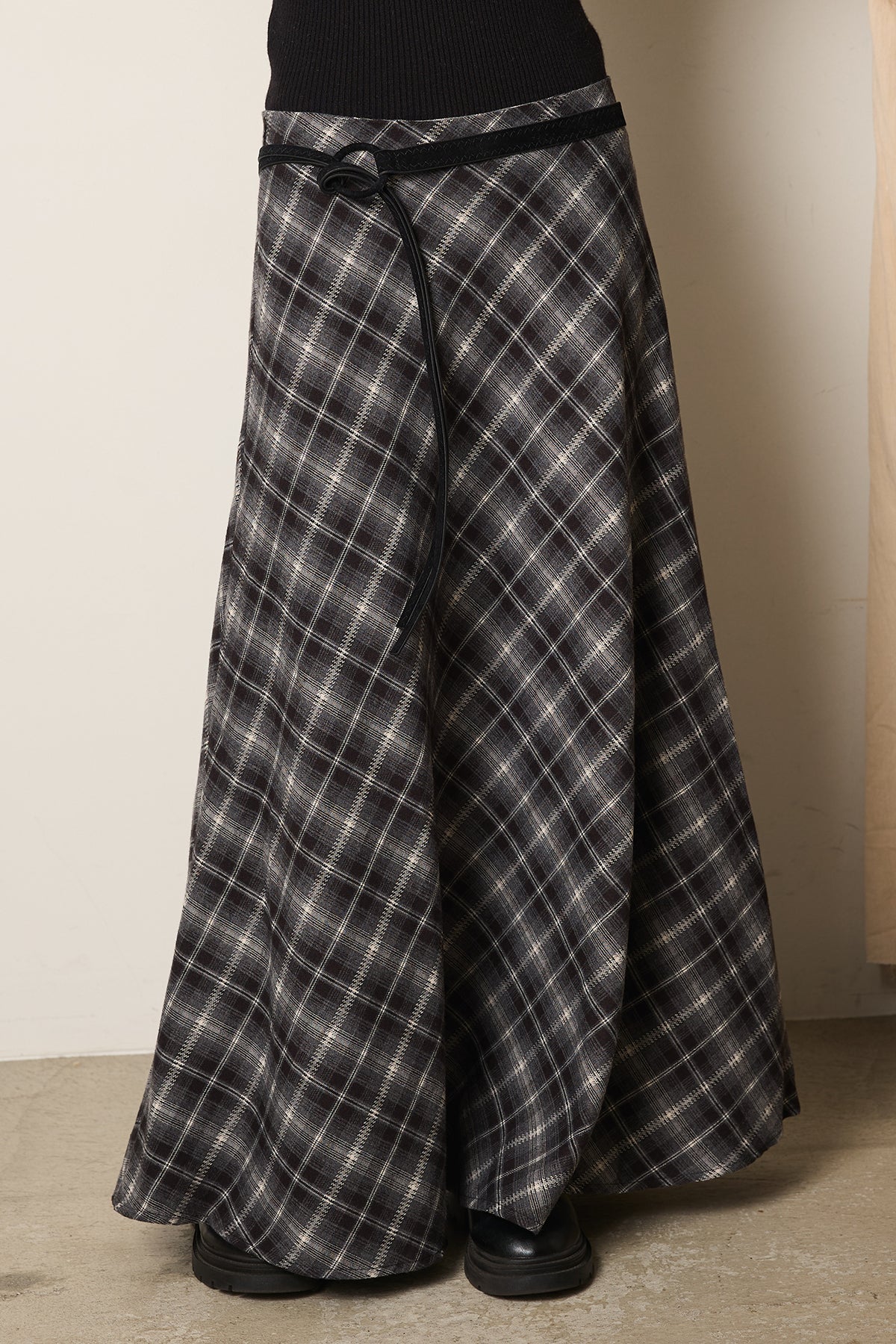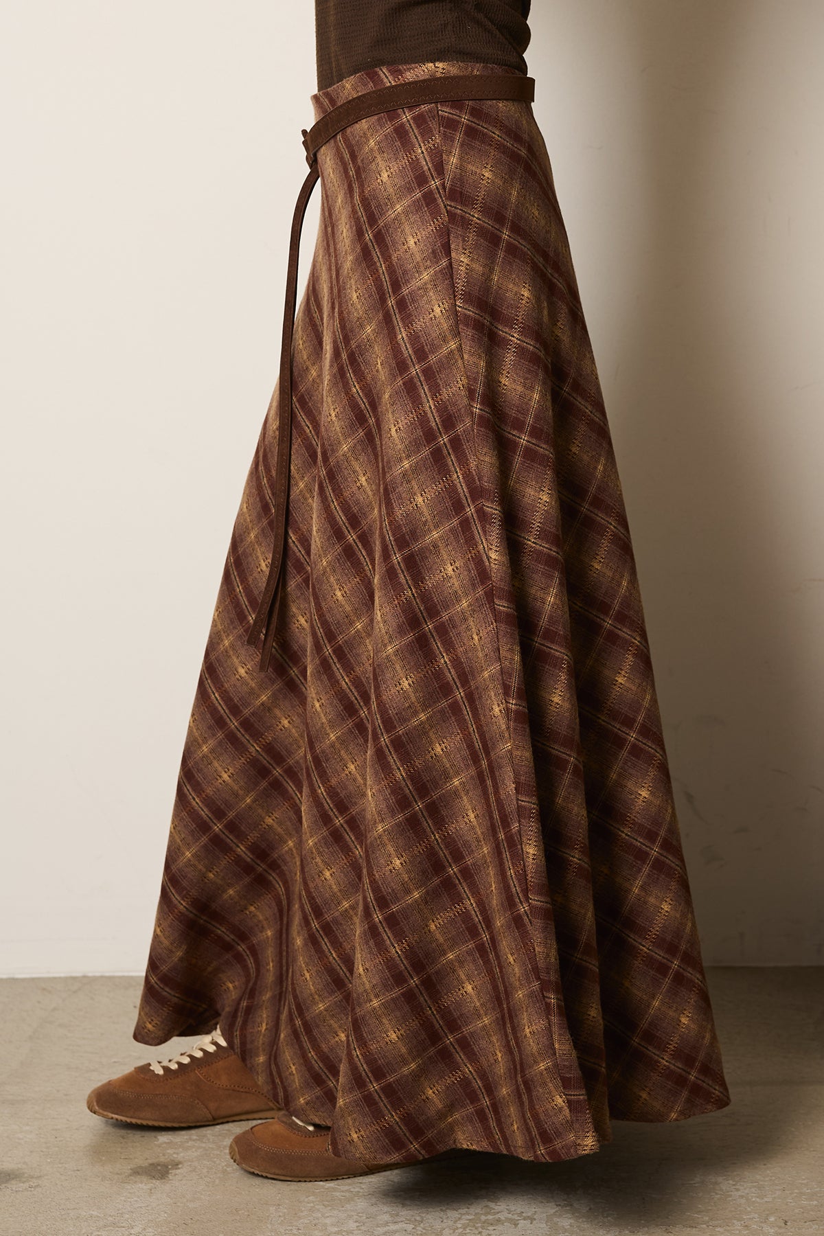 クラシカルなタータンチェック柄が目を引くスカート。付属のベルトがウエストを引き締め、広がりのあるフレアシルエットを美しく引き立てます。存在感のある柄ながら落ち着いた配色で取り入れやすく、ニットやシャツと合わせるだけでシーズンライクなスタイリングが完成する一枚です。