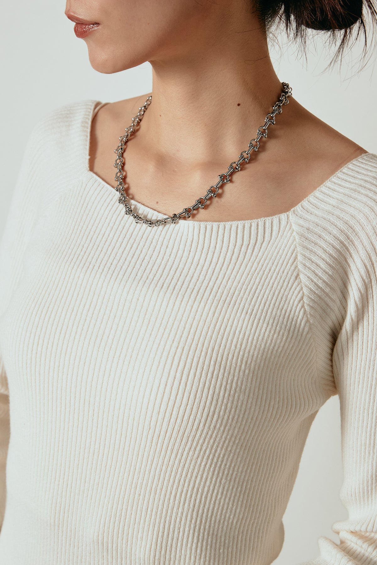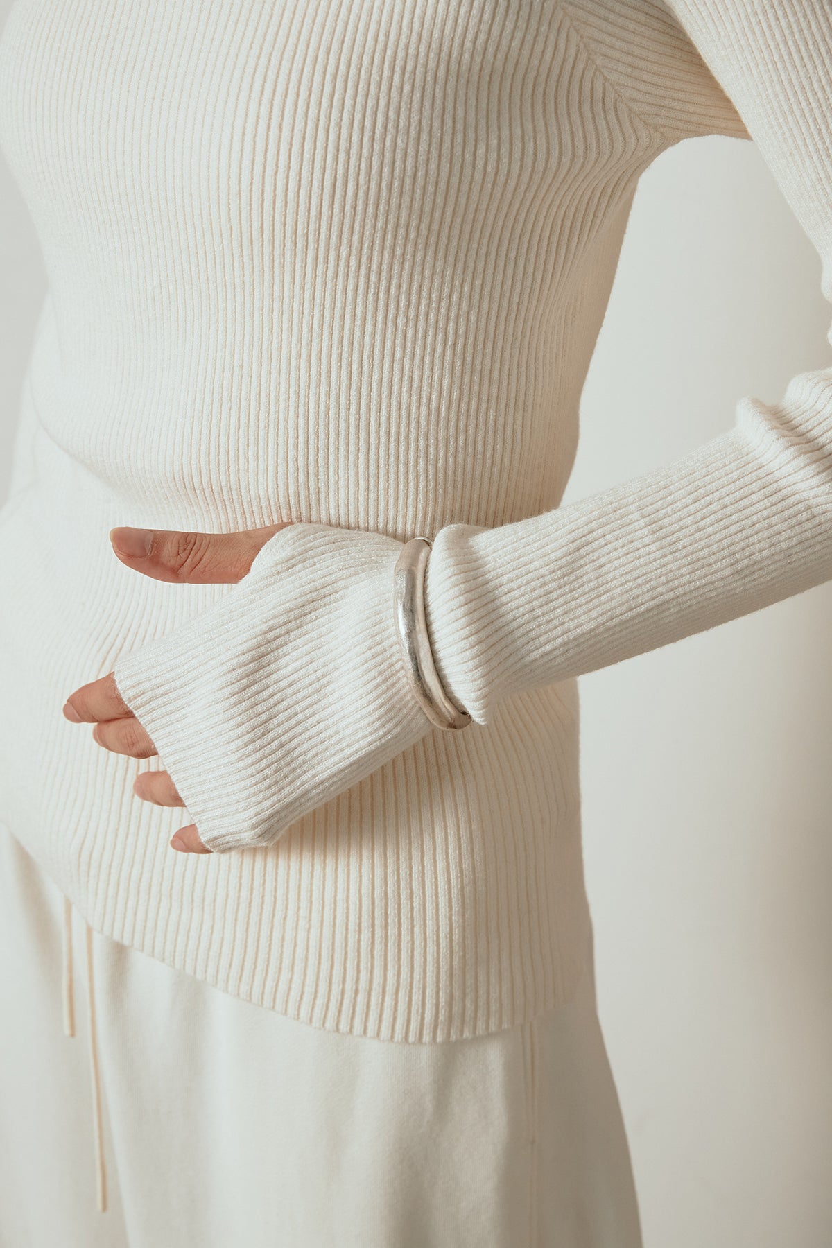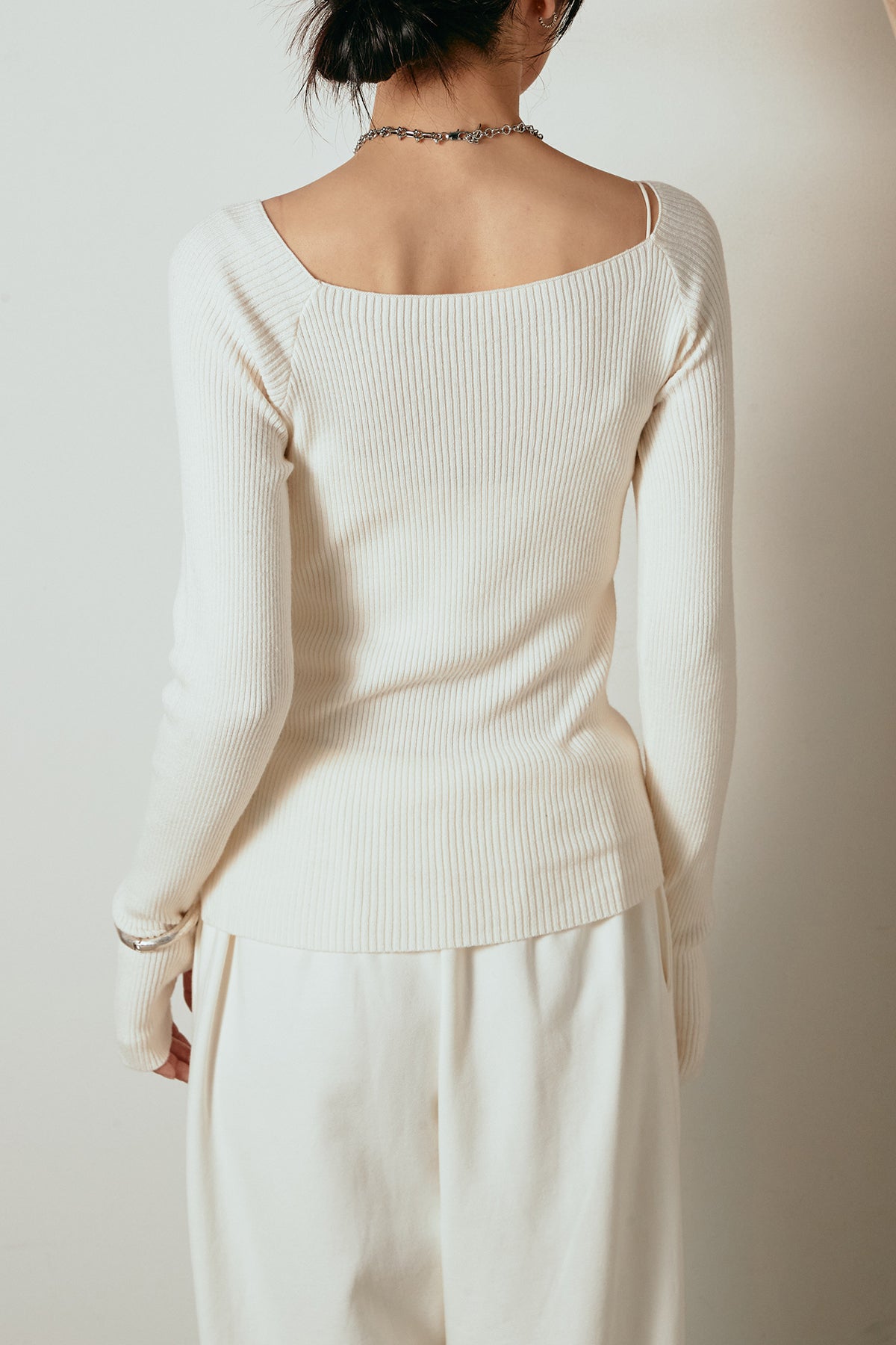 すっきりとしたリブ編みで仕上げたオフショルトップス。華奢なストラップを添えることで抜け感を加え、シンプルながらも洗練された印象に。程よくフィットするシルエットが美しいラインを引き立て、デイリーからモードなスタイリングまで幅広く活躍する一枚です。
