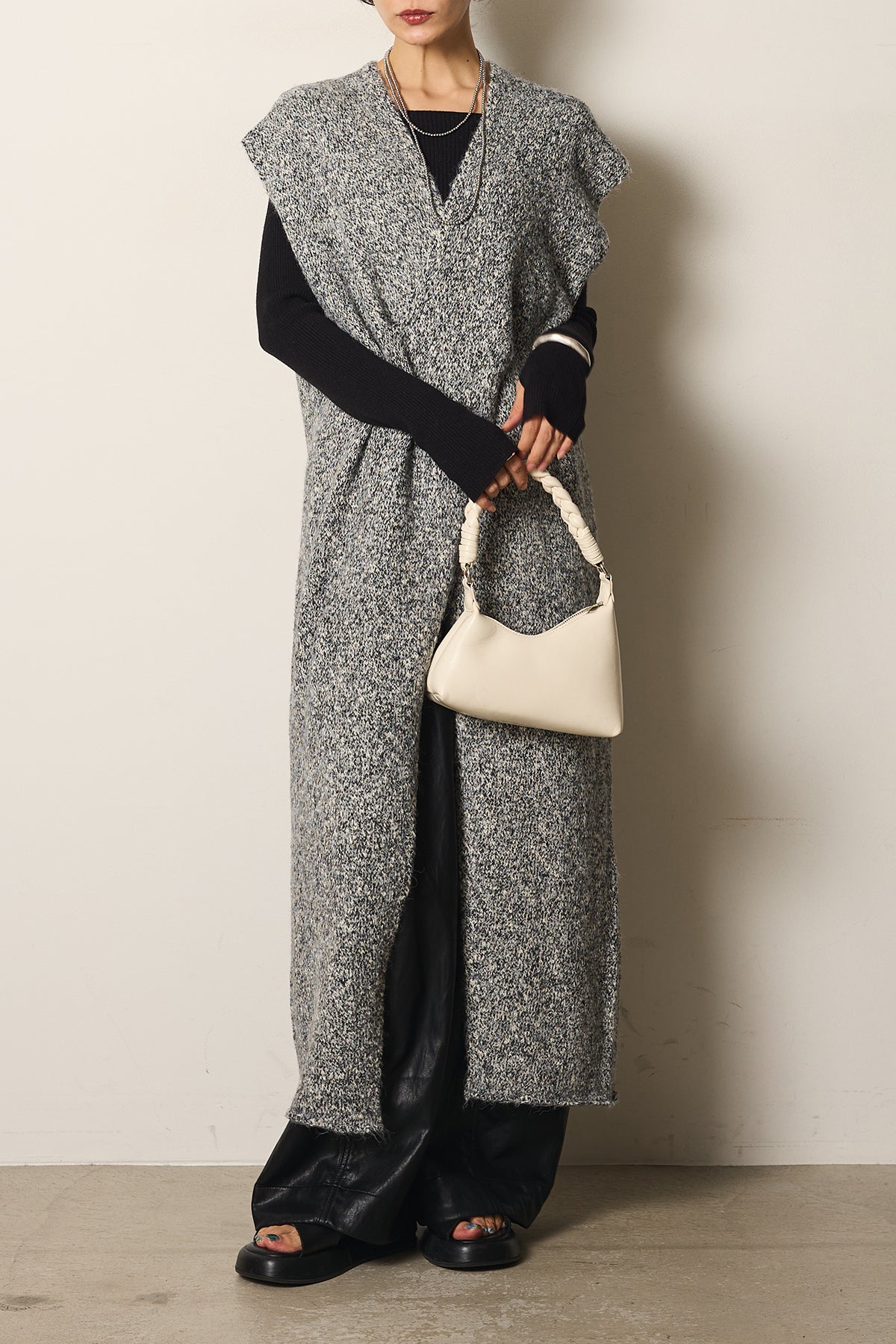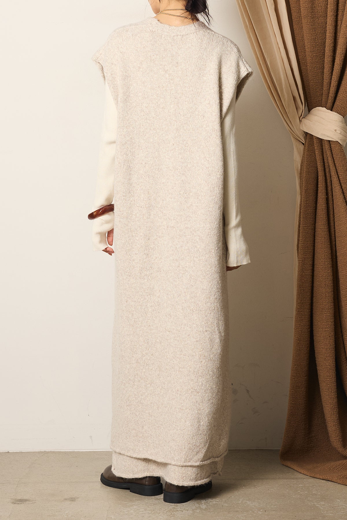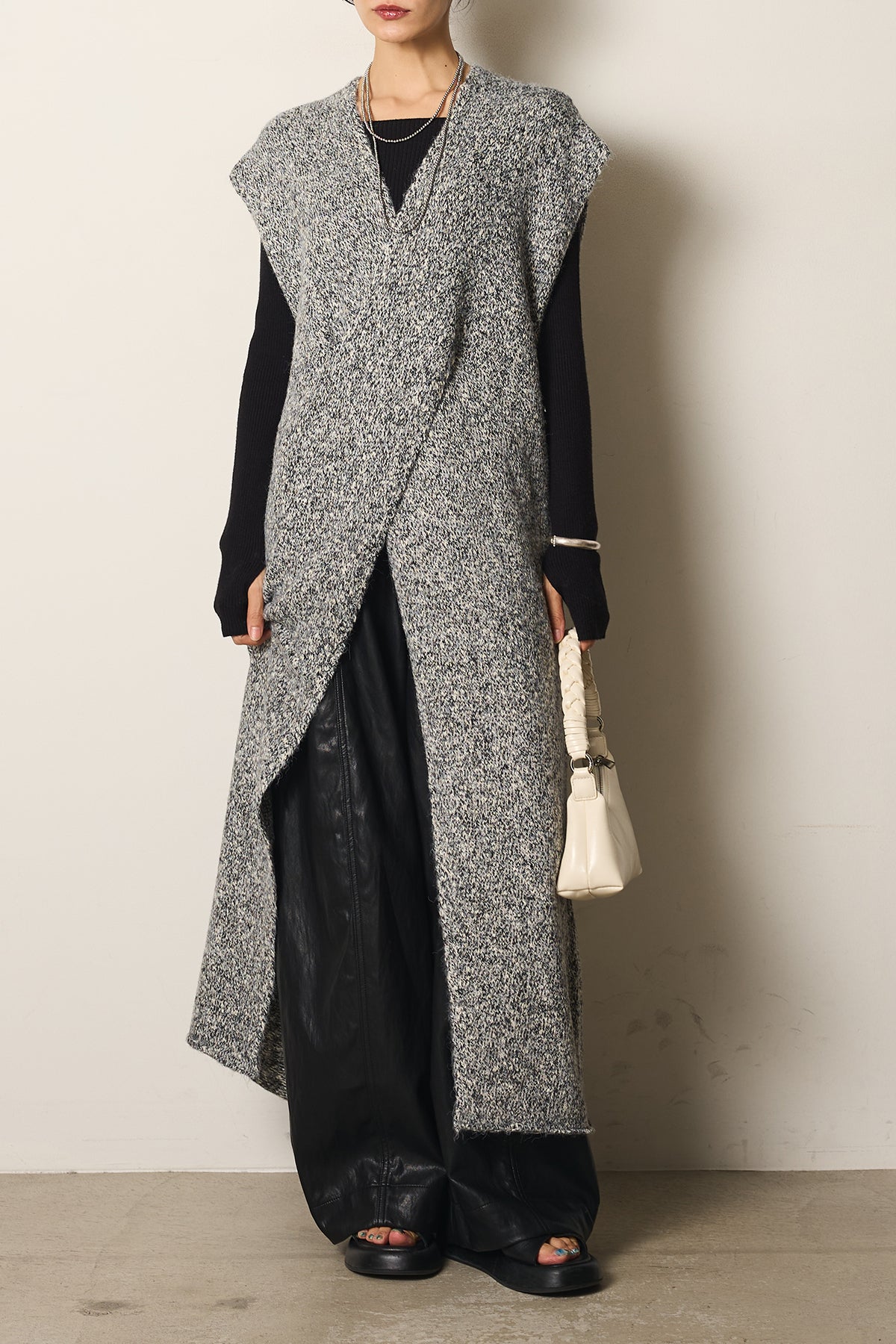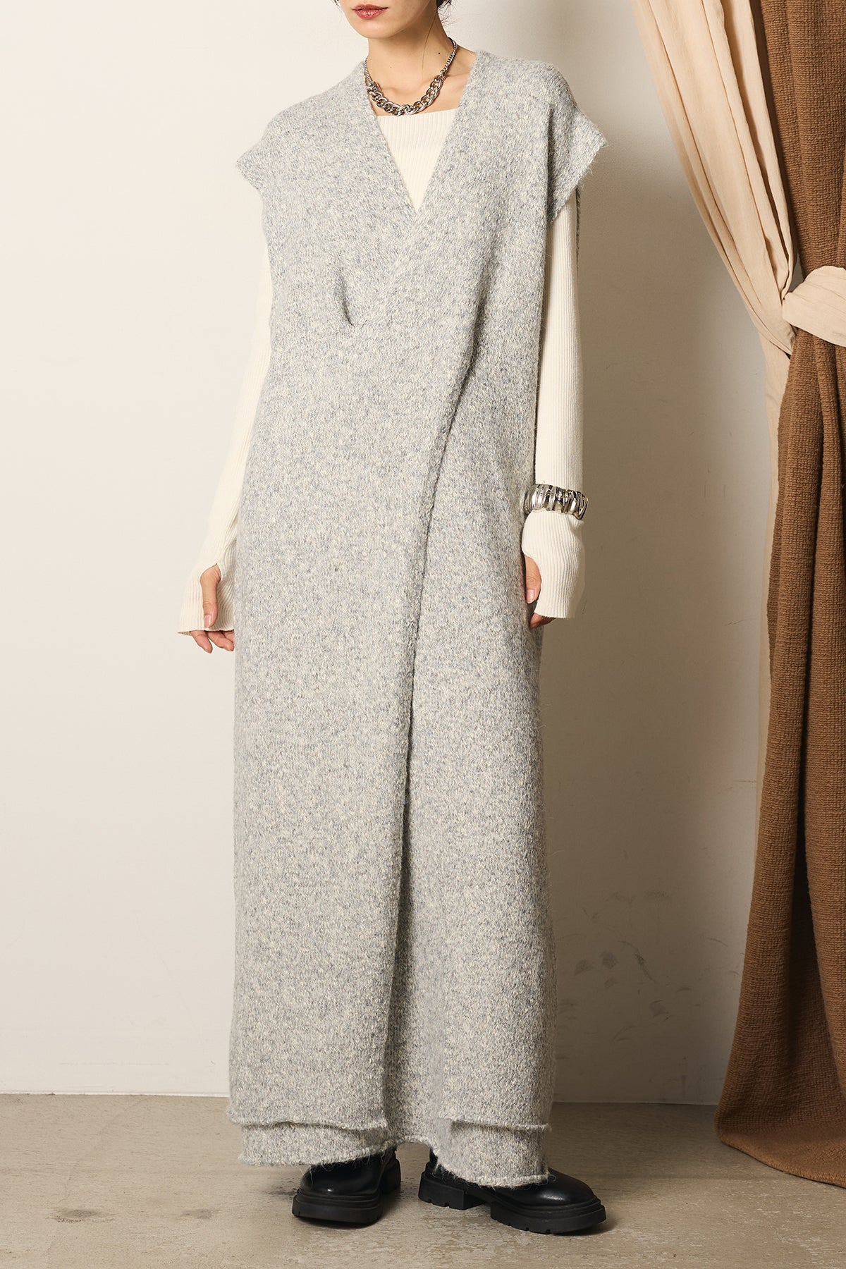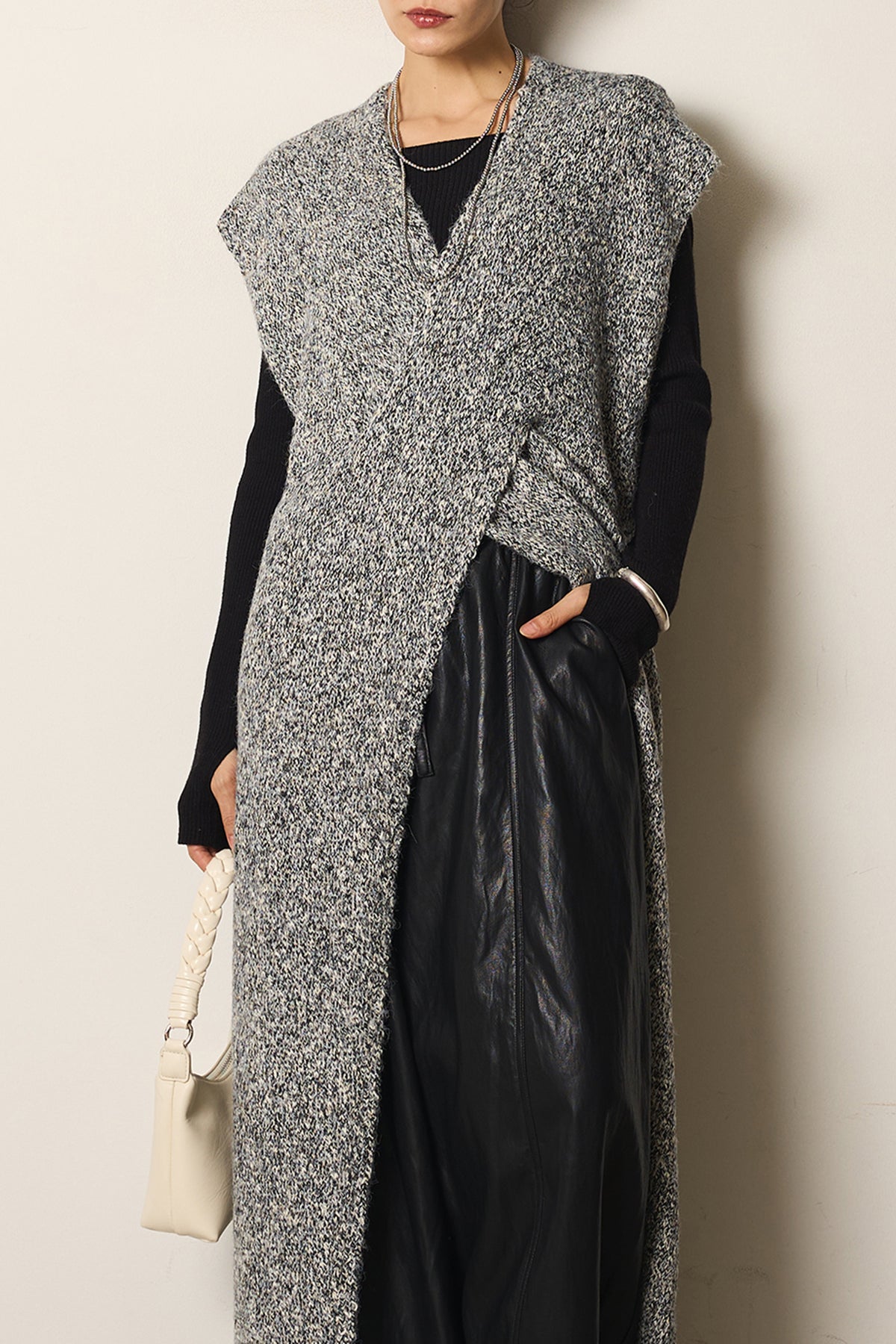 立体感のあるミックス糸で仕上げたニットワンピース。フロントのクロスデザインがシンプルな中にアクセントを添え、モードな雰囲気を漂わせます。ゆったりとしたシルエットでリラックス感がありながらも、レイヤード次第で表情を変えられる万能な一枚です。