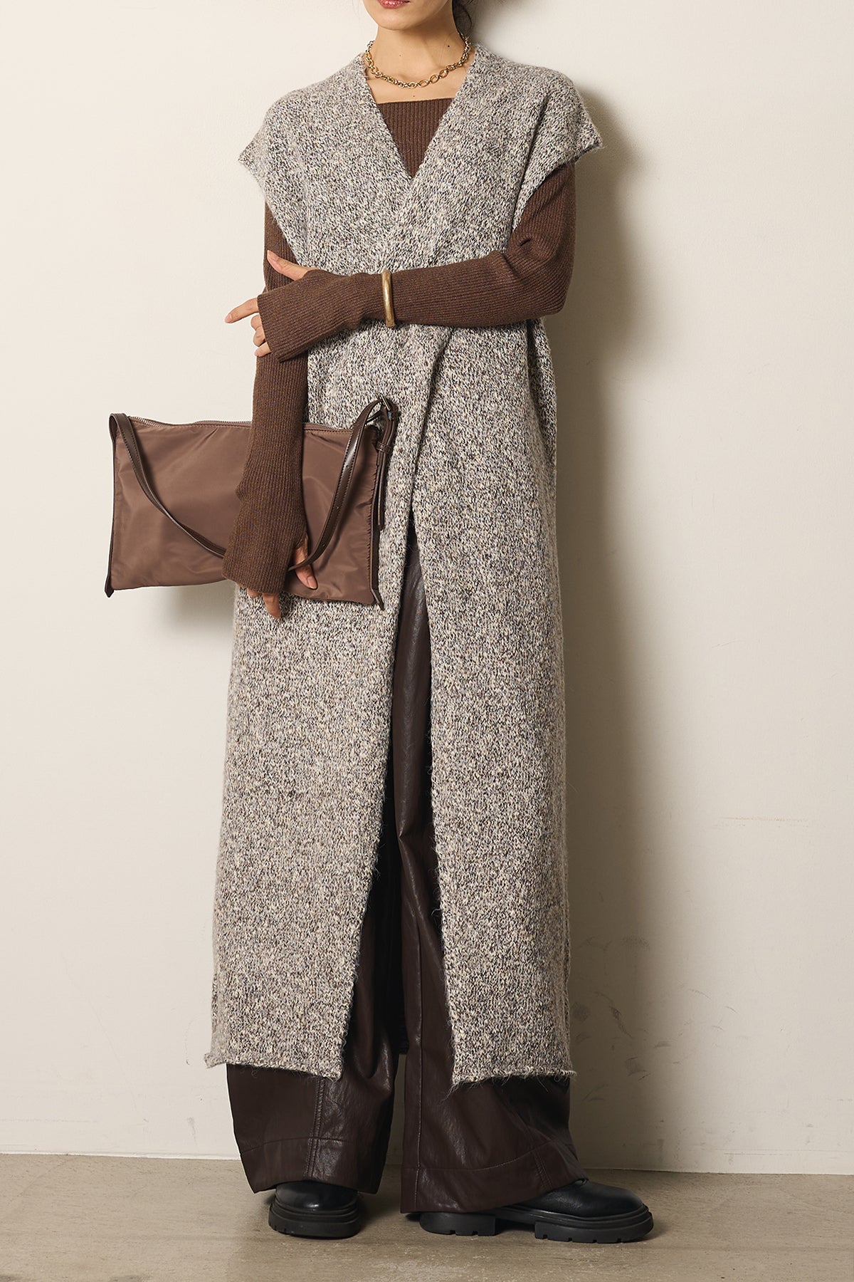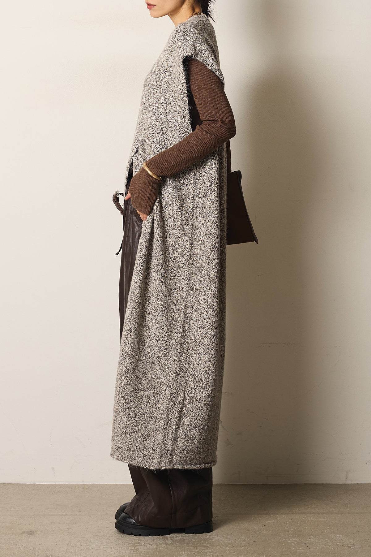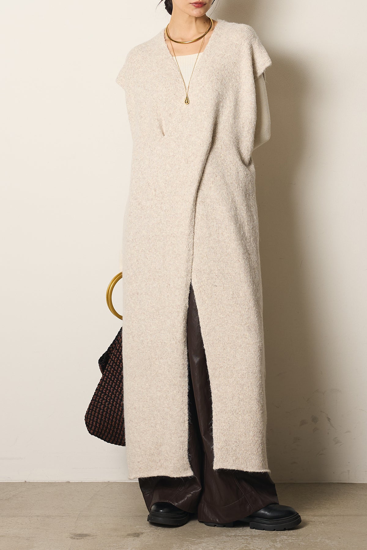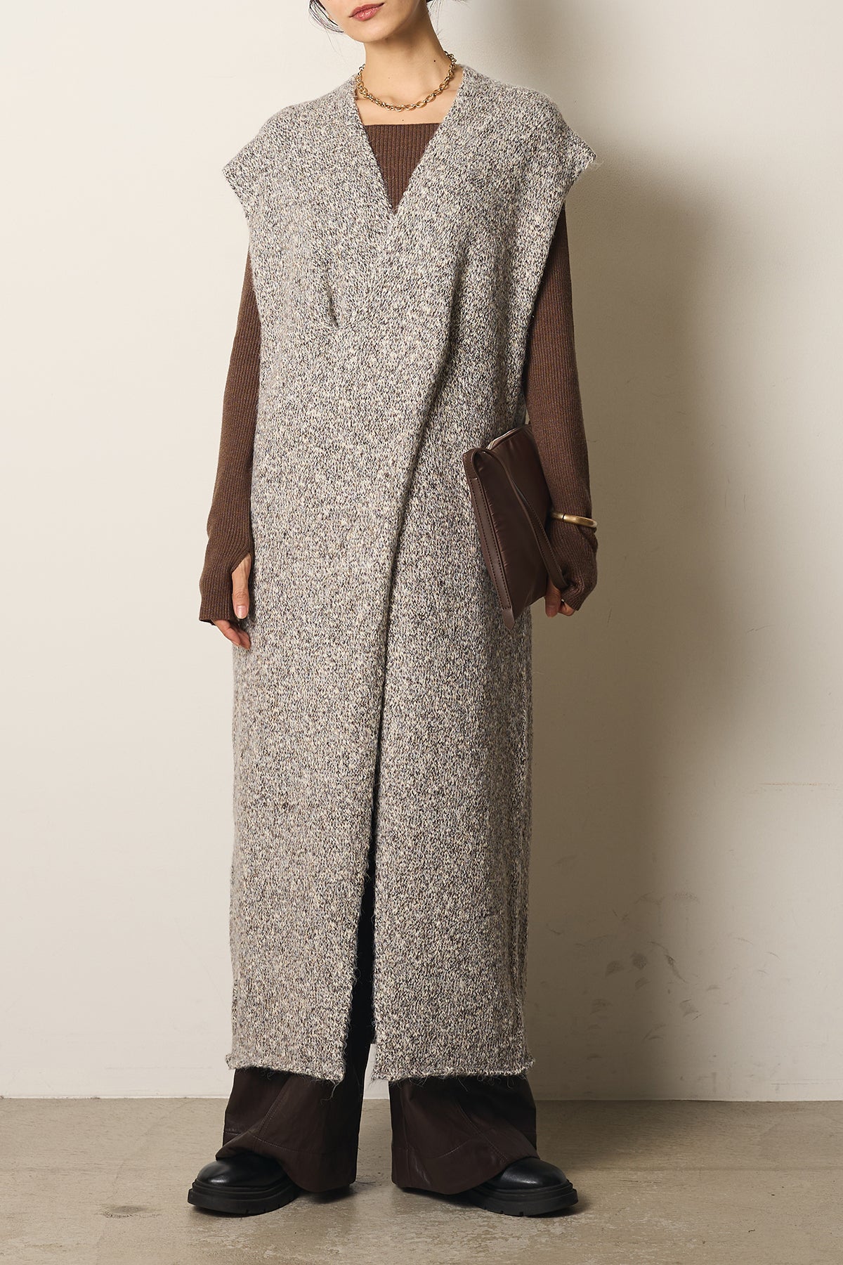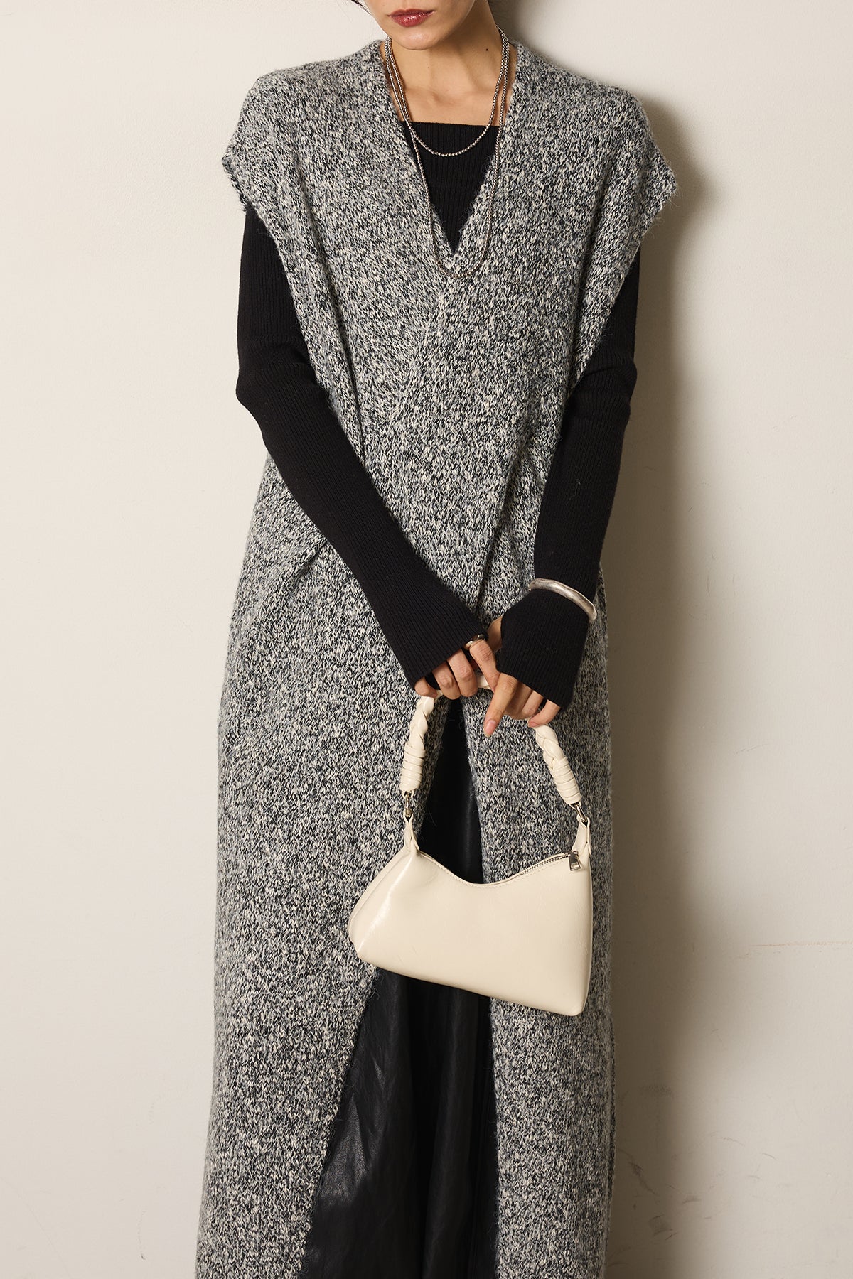 立体感のあるミックス糸で仕上げたニットワンピース。フロントのクロスデザインがシンプルな中にアクセントを添え、モードな雰囲気を漂わせます。ゆったりとしたシルエットでリラックス感がありながらも、レイヤード次第で表情を変えられる万能な一枚です。