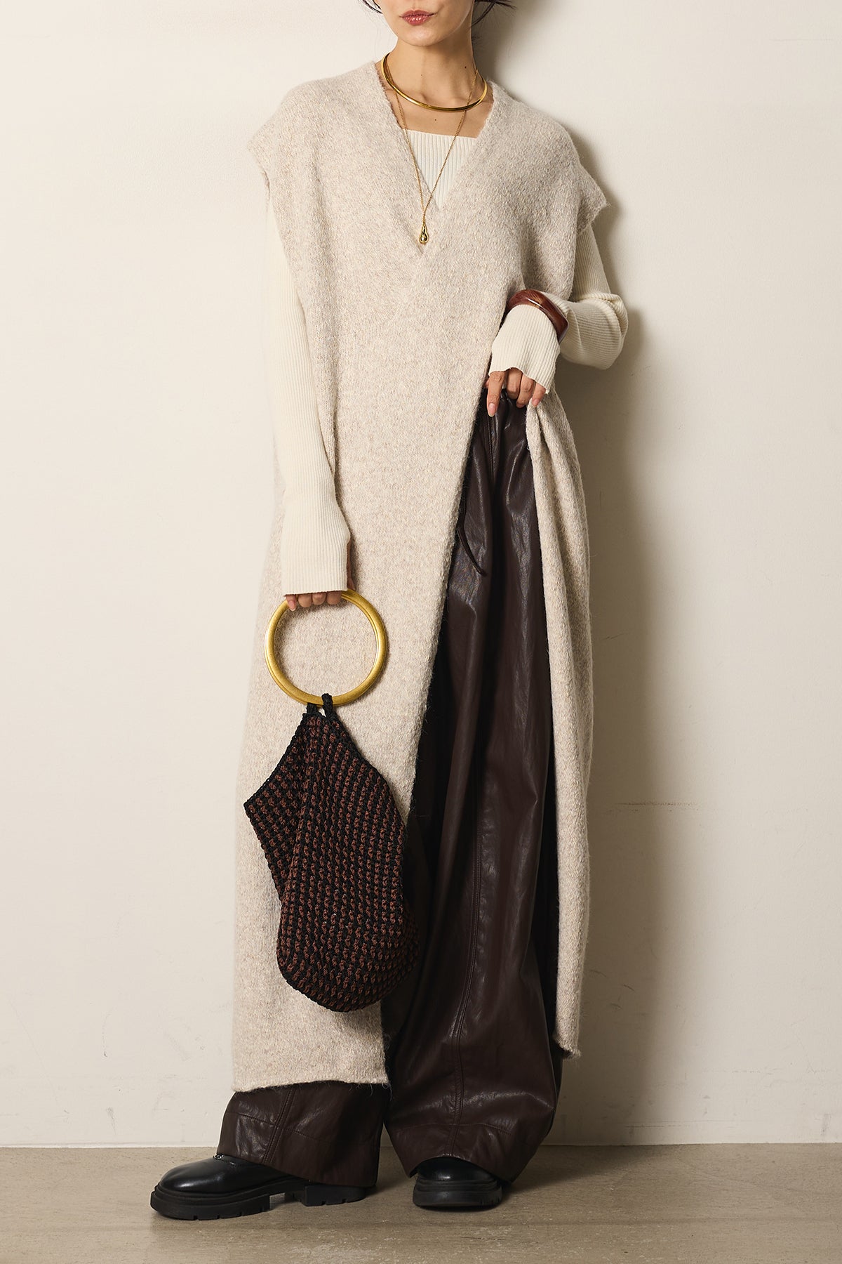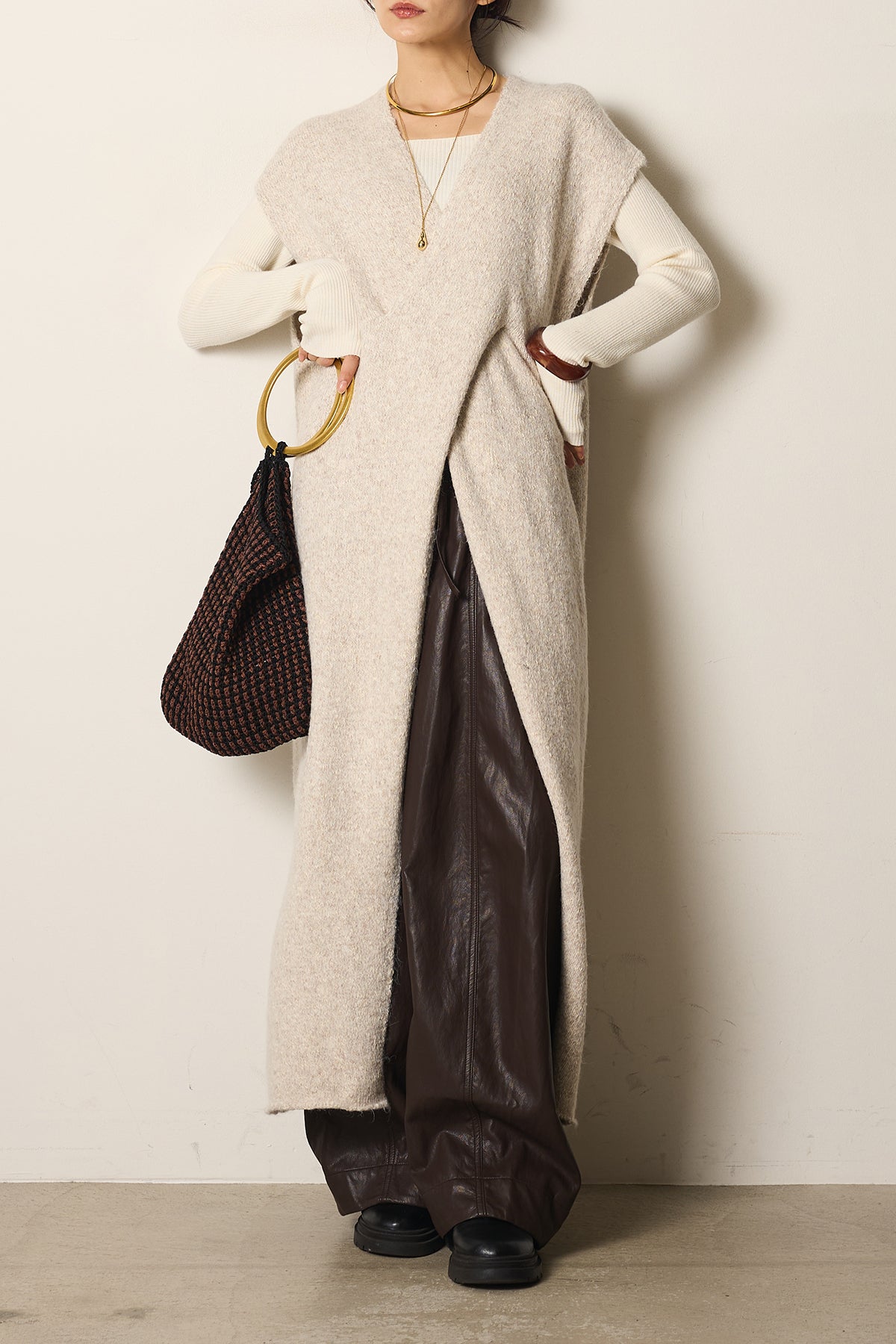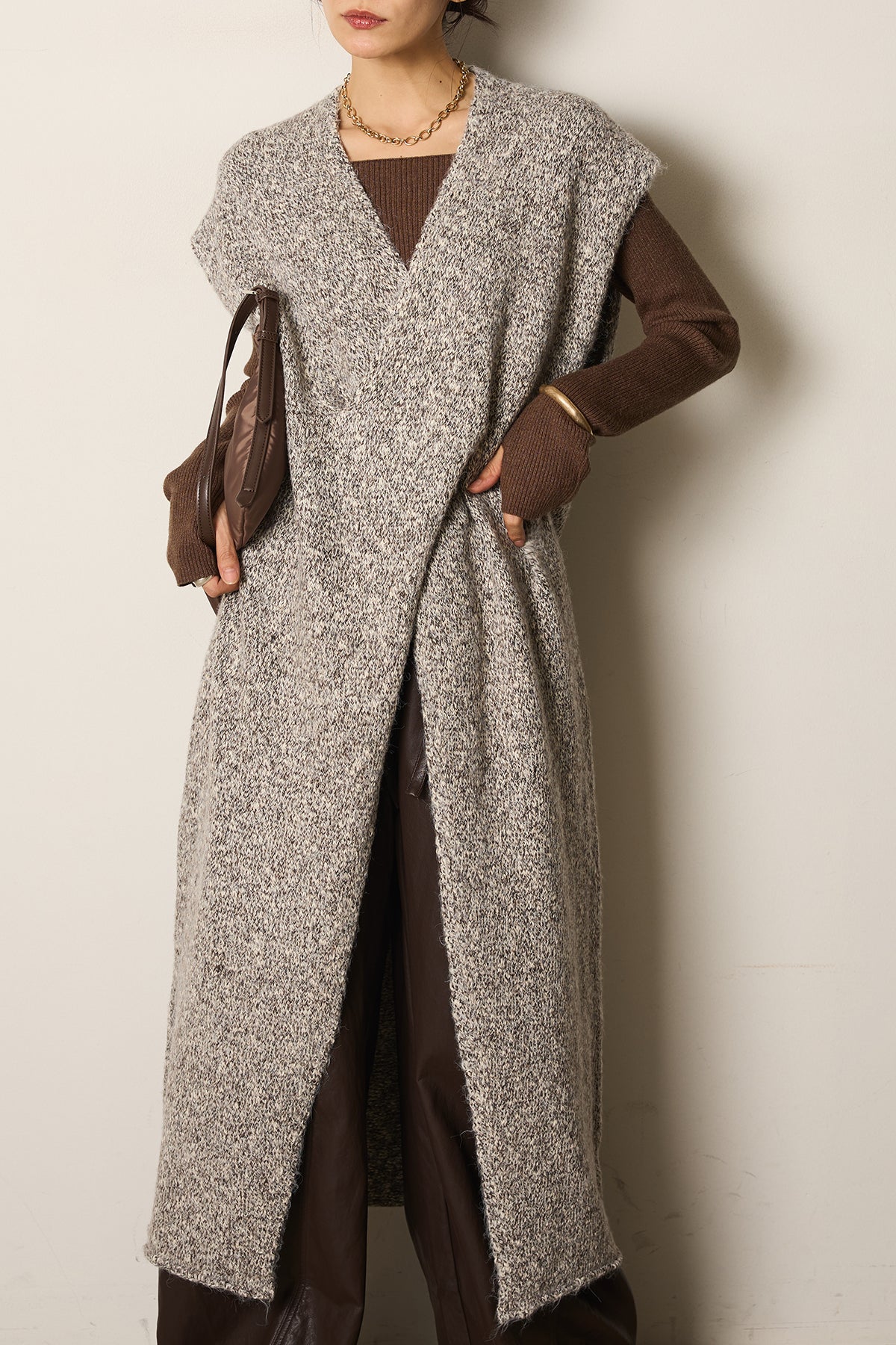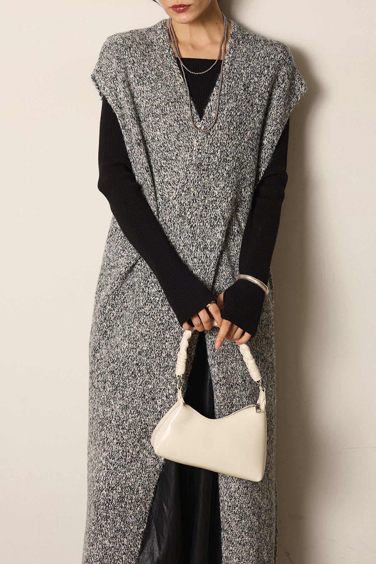 立体感のあるミックス糸で仕上げたニットワンピース。フロントのクロスデザインがシンプルな中にアクセントを添え、モードな雰囲気を漂わせます。ゆったりとしたシルエットでリラックス感がありながらも、レイヤード次第で表情を変えられる万能な一枚です。