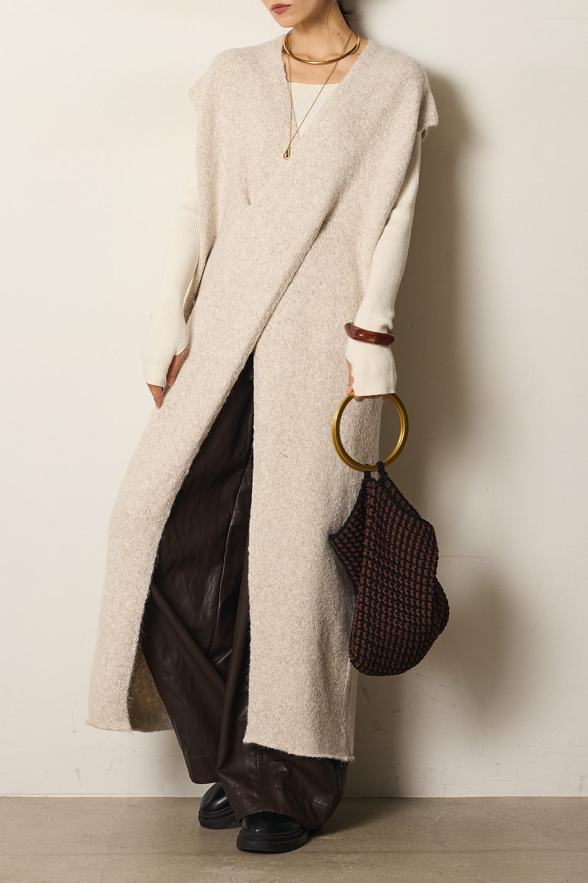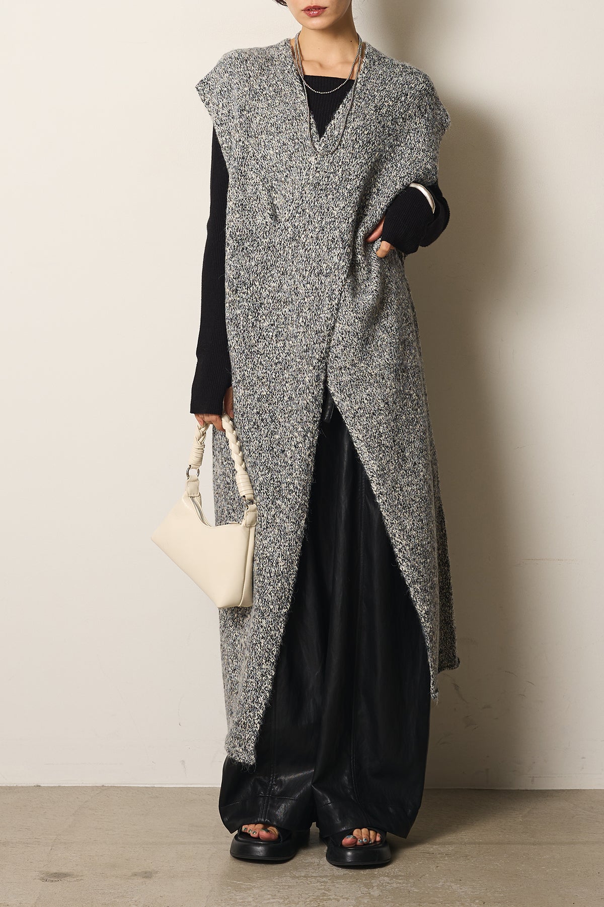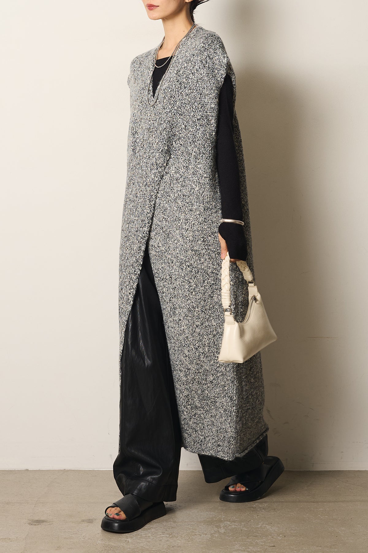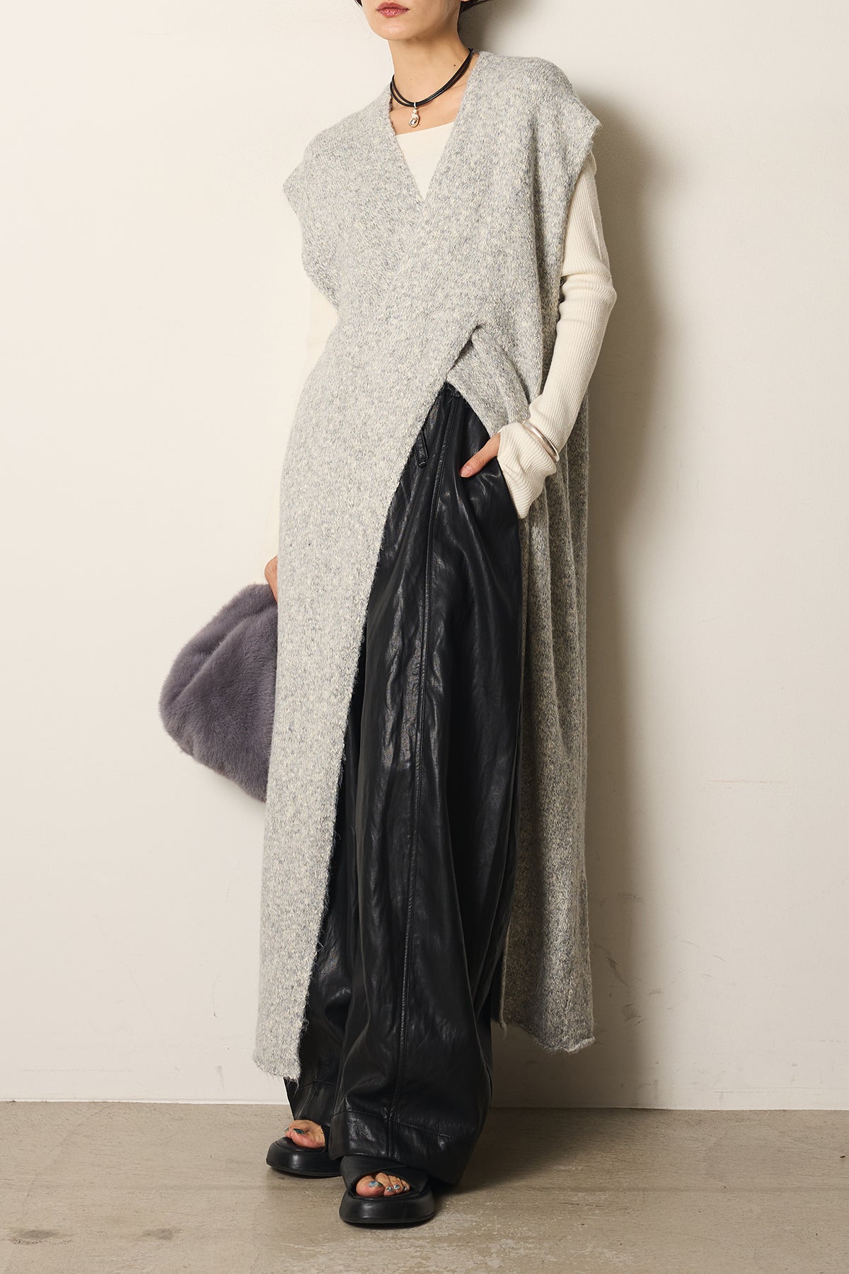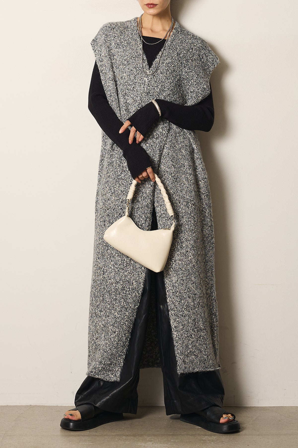 立体感のあるミックス糸で仕上げたニットワンピース。フロントのクロスデザインがシンプルな中にアクセントを添え、モードな雰囲気を漂わせます。ゆったりとしたシルエットでリラックス感がありながらも、レイヤード次第で表情を変えられる万能な一枚です。