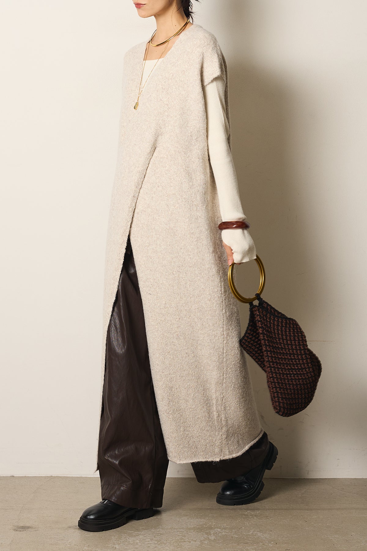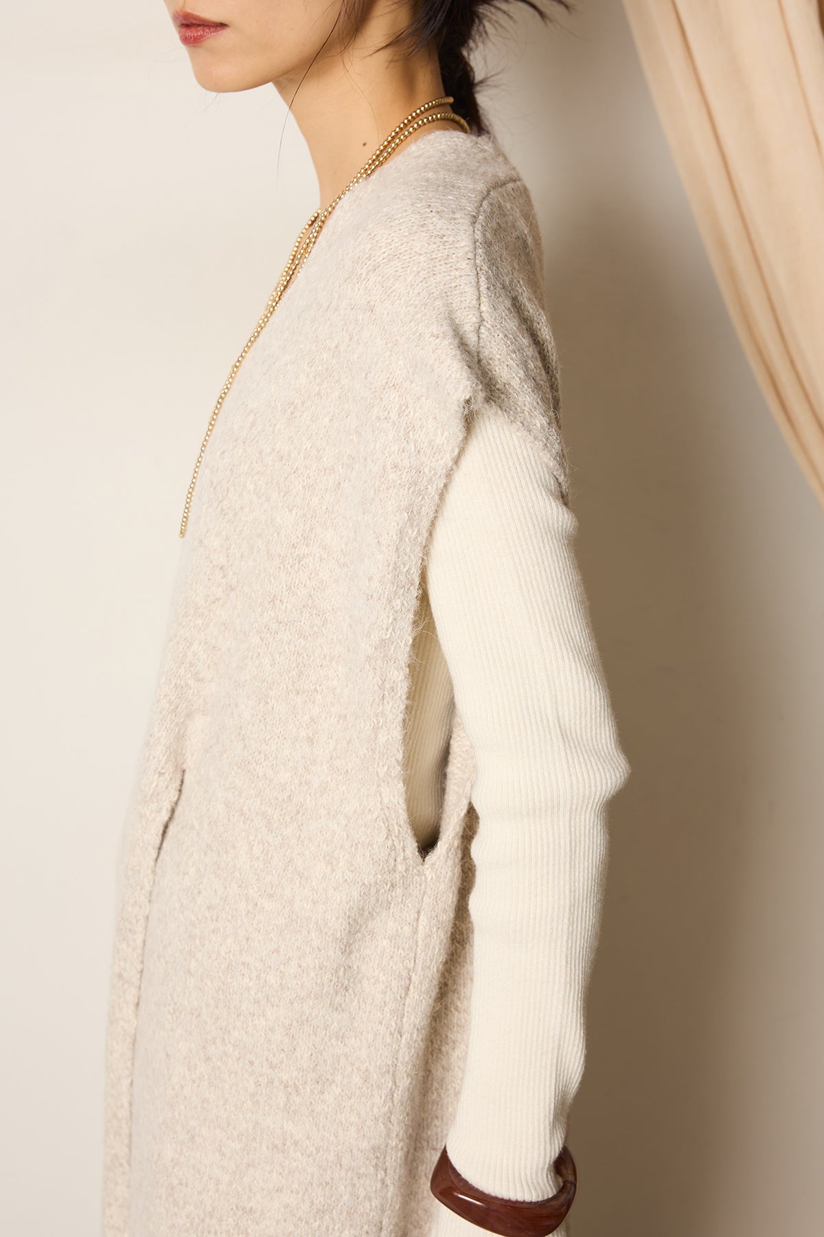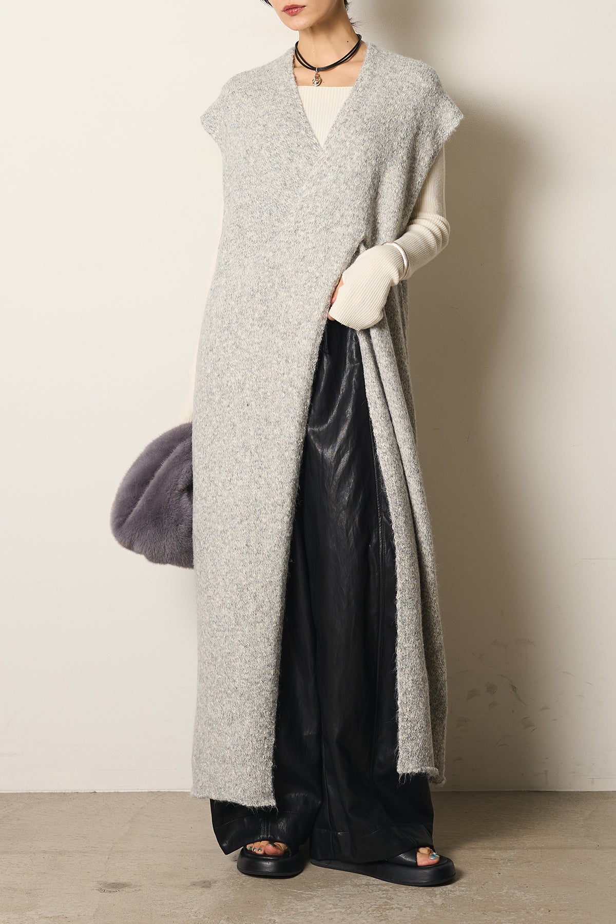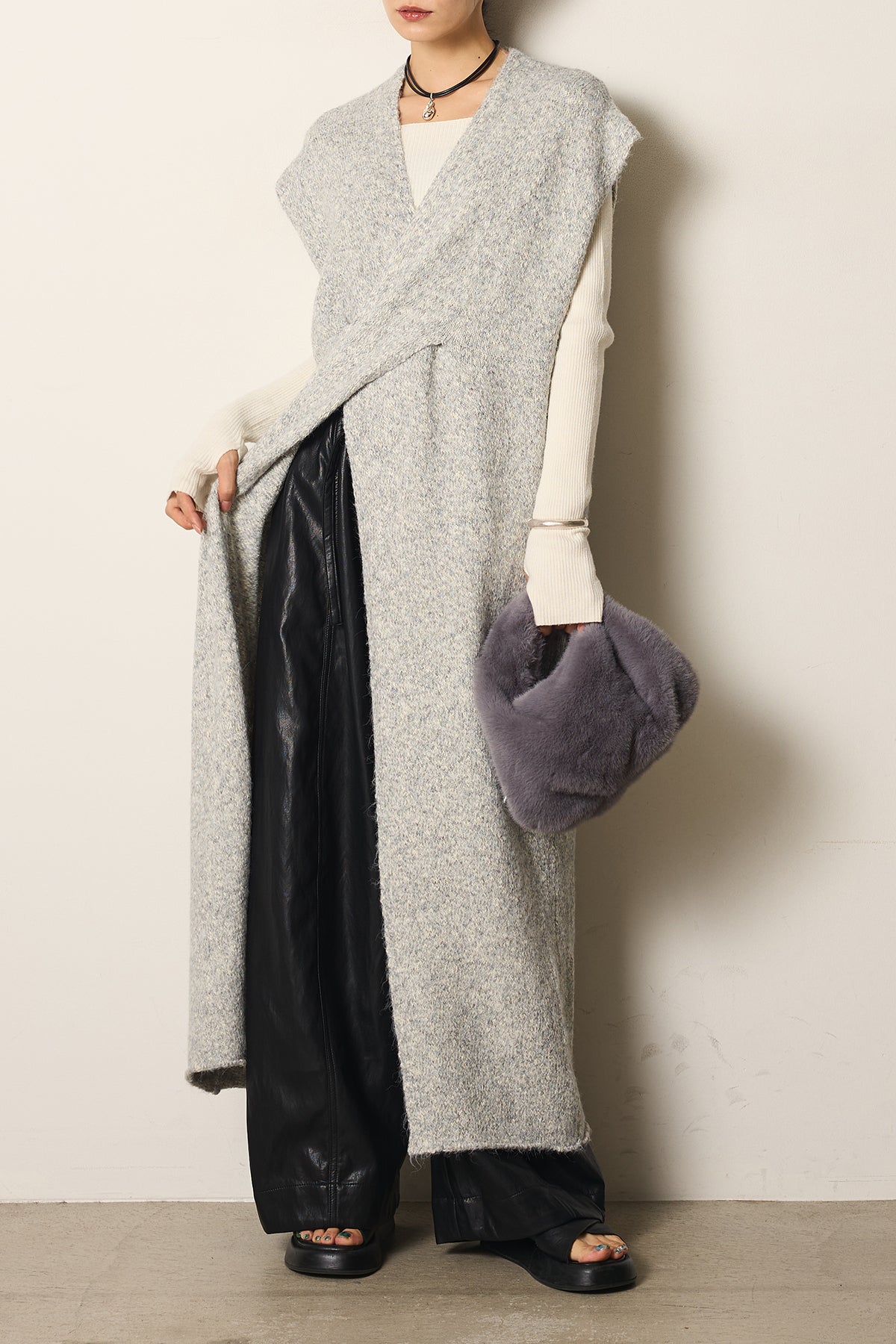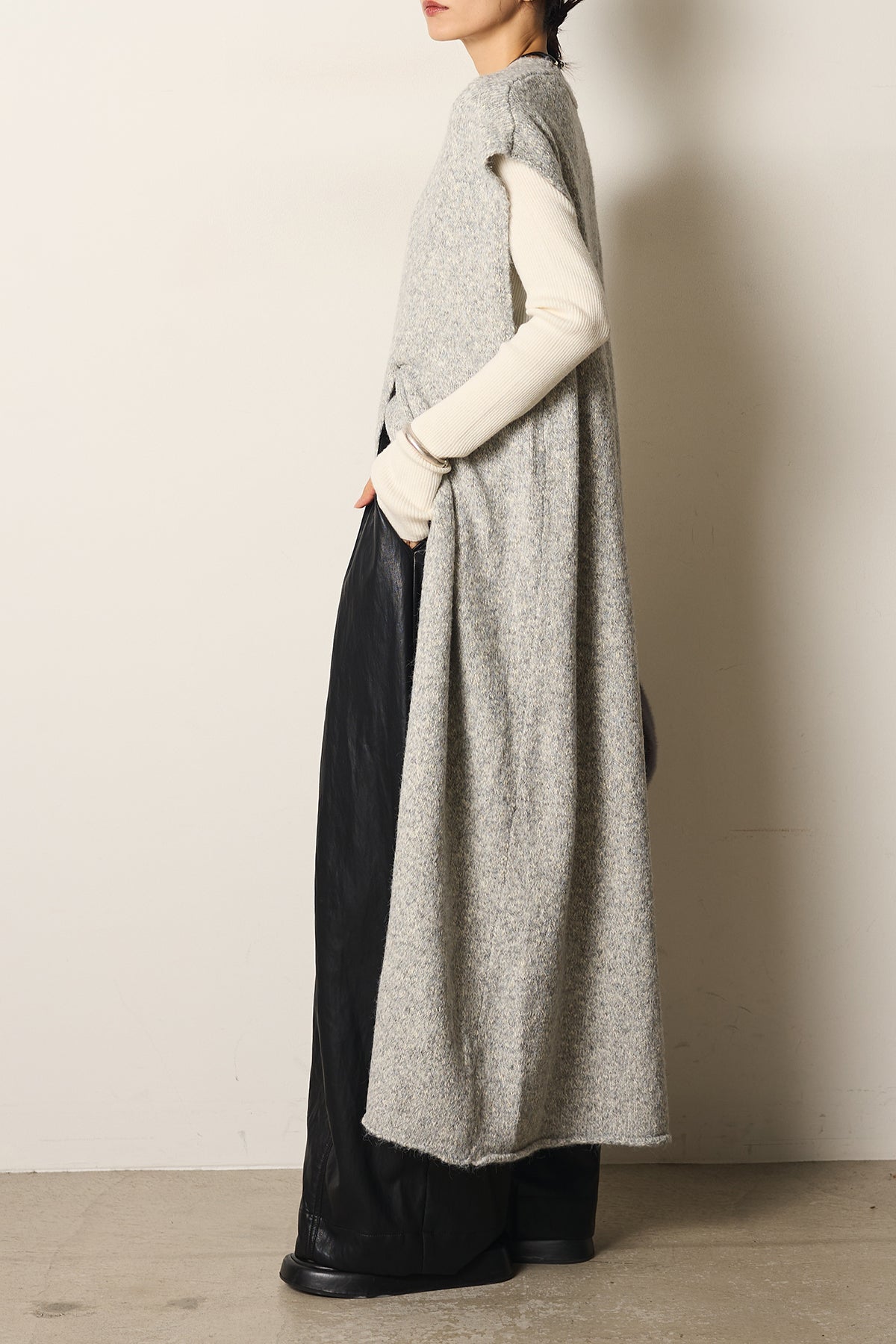 立体感のあるミックス糸で仕上げたニットワンピース。フロントのクロスデザインがシンプルな中にアクセントを添え、モードな雰囲気を漂わせます。ゆったりとしたシルエットでリラックス感がありながらも、レイヤード次第で表情を変えられる万能な一枚です。