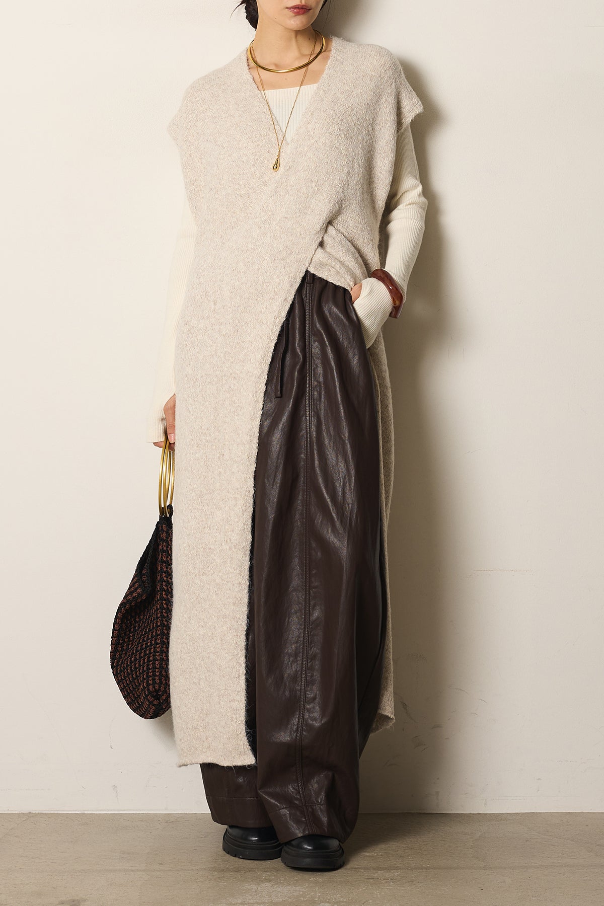 艶感のあるフェイクレザーで仕上げたカーブワイドパンツ。ゆとりのあるシルエットに丸みを持たせたデザインが、モードな雰囲気を漂わせます。ウエストはゴム仕様でリラックスした穿き心地ながら、コーディネートに取り入れるだけで存在感のあるスタイルが完成する一本です。