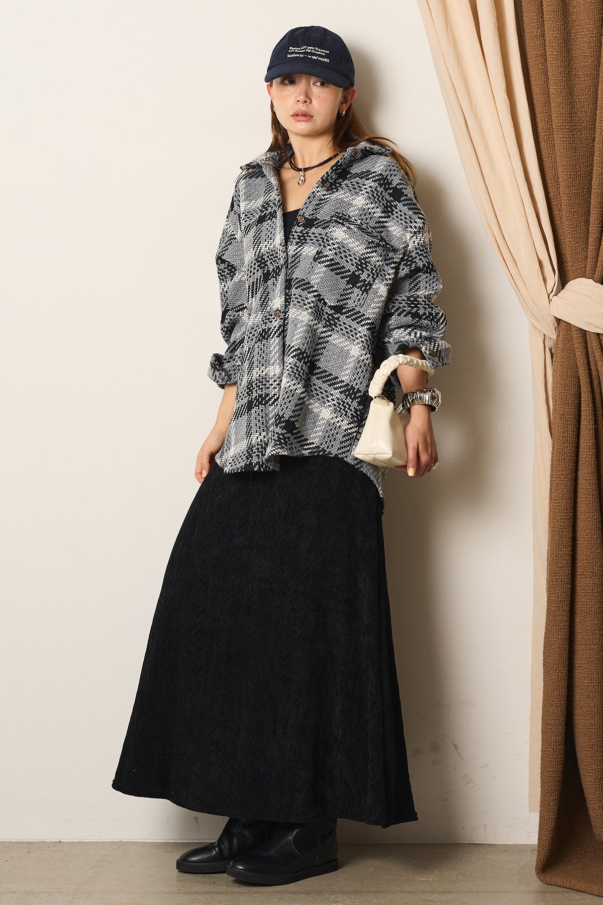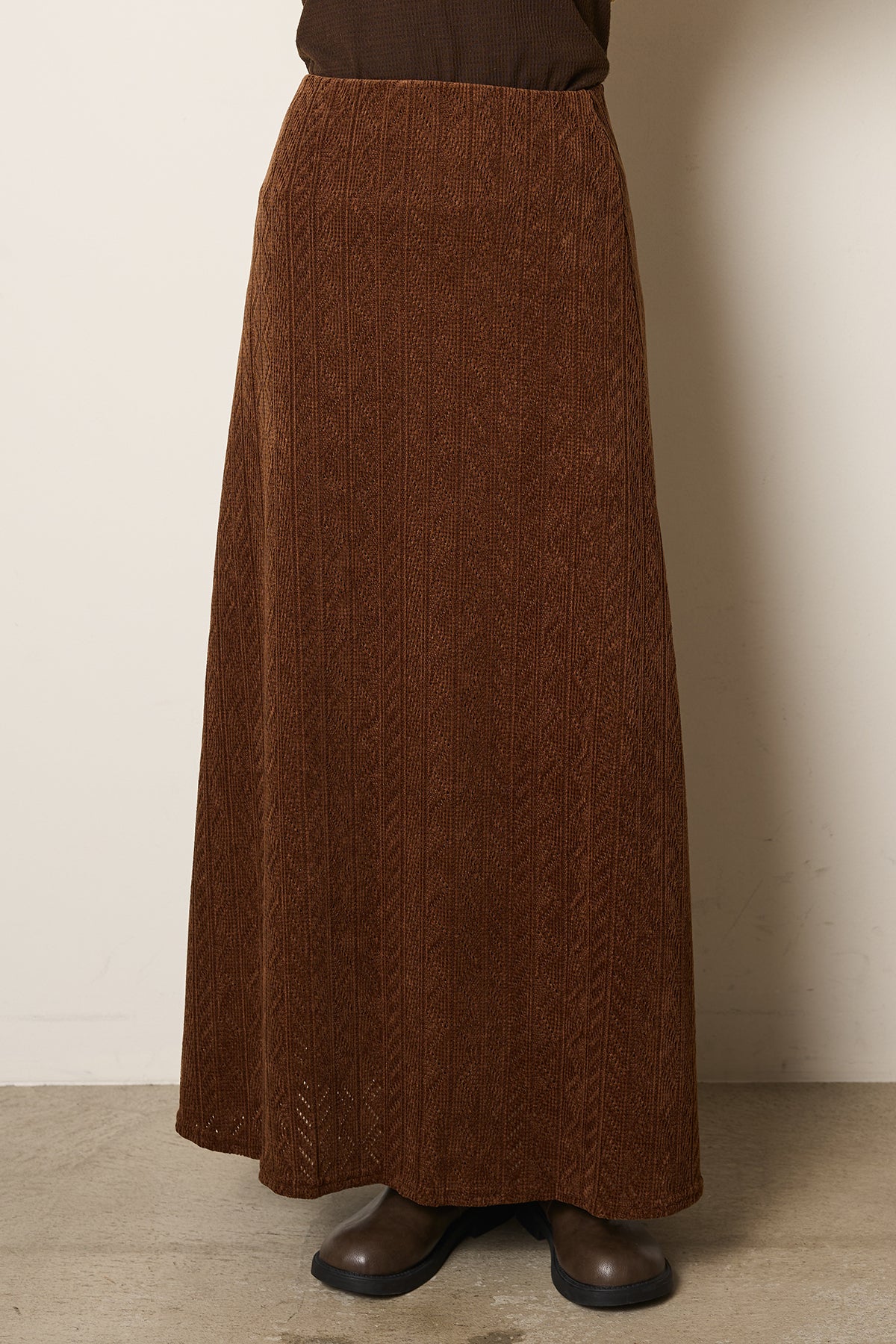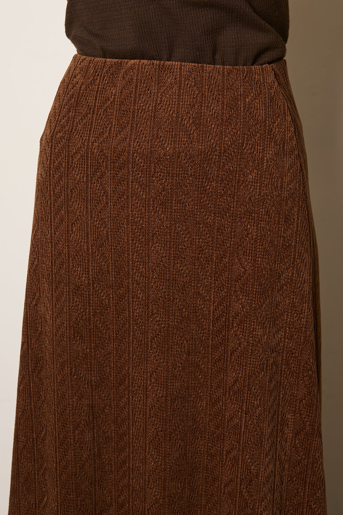 立体感のあるライン柄が浮かぶベロアスカート。光沢を帯びた生地が上品さを引き立て、動くたびに美しい表情を見せます。すっきりとしたシルエットで着こなしやすく、ニットやブラウスと合わせて秋冬のスタイリングに活躍する一枚です。