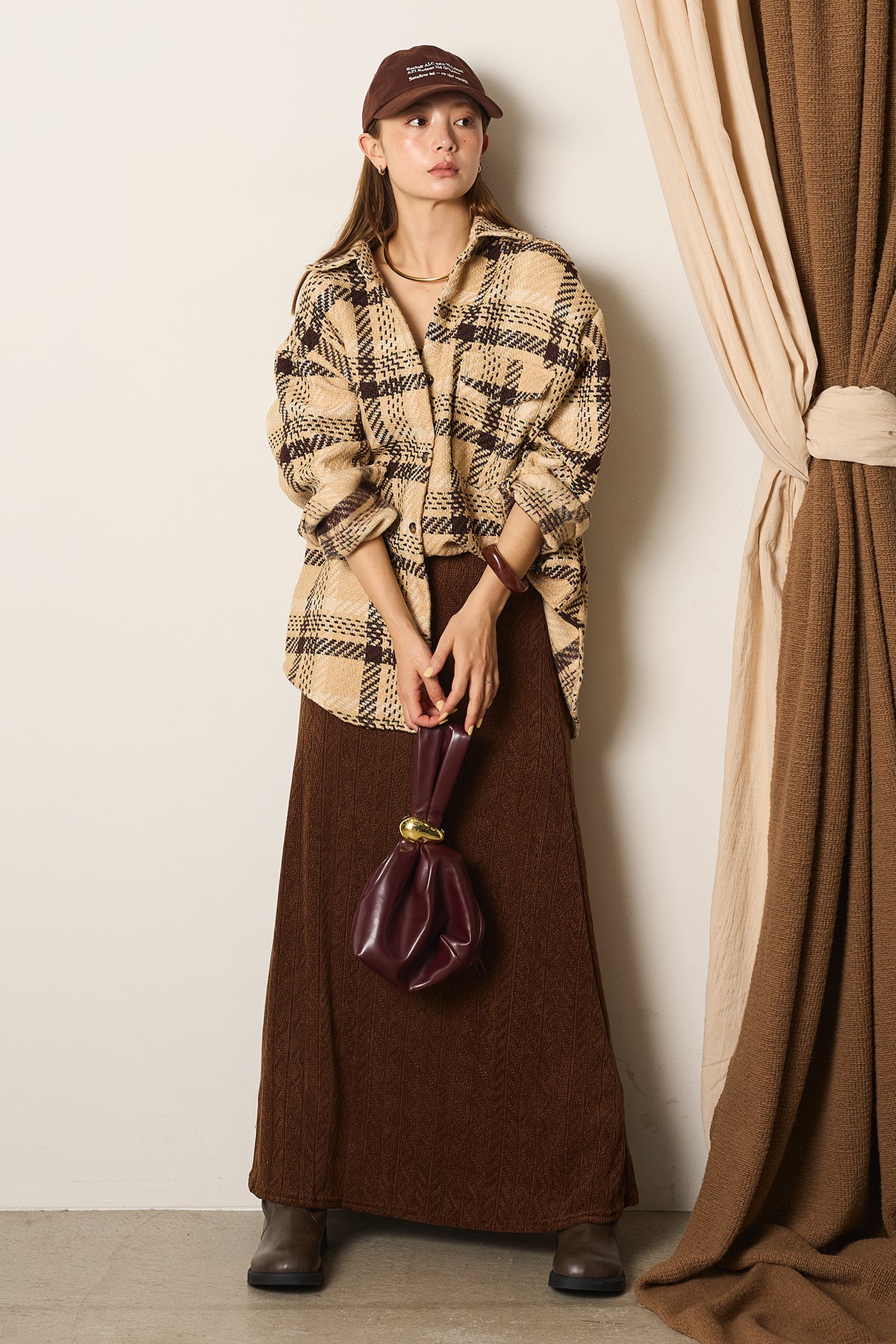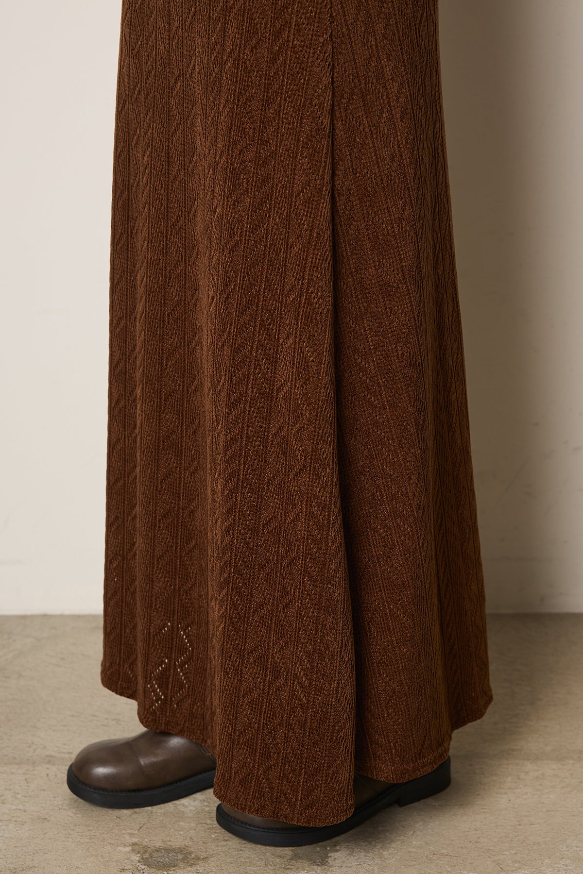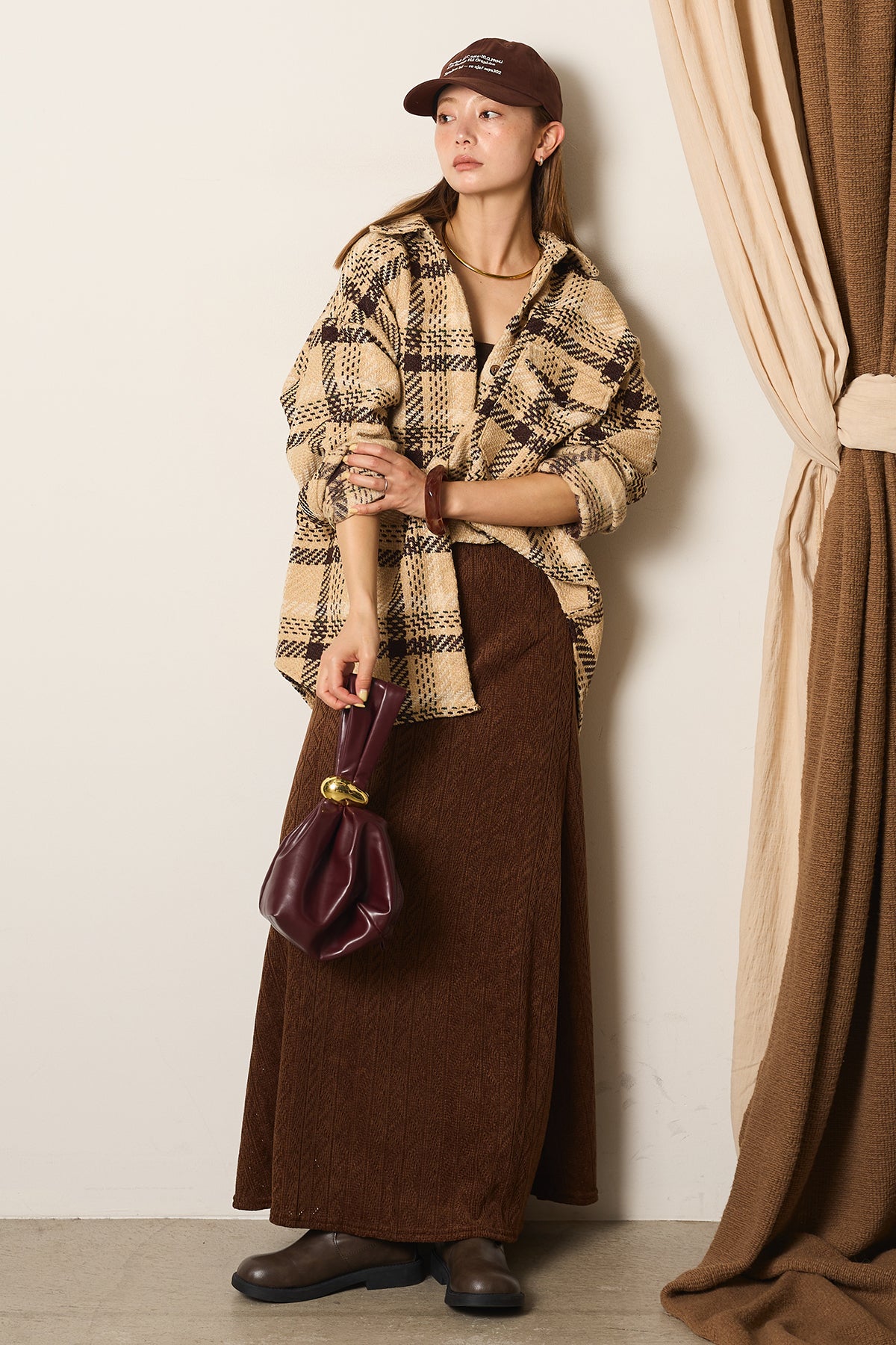 立体感のあるライン柄が浮かぶベロアスカート。光沢を帯びた生地が上品さを引き立て、動くたびに美しい表情を見せます。すっきりとしたシルエットで着こなしやすく、ニットやブラウスと合わせて秋冬のスタイリングに活躍する一枚です。