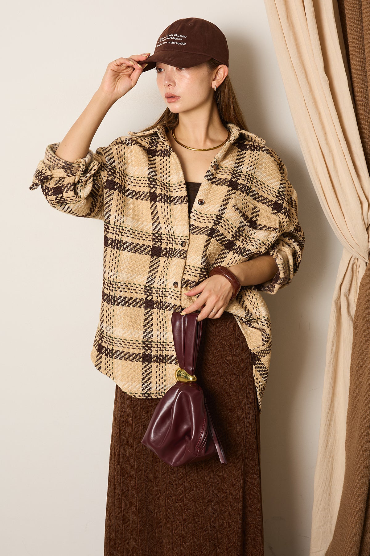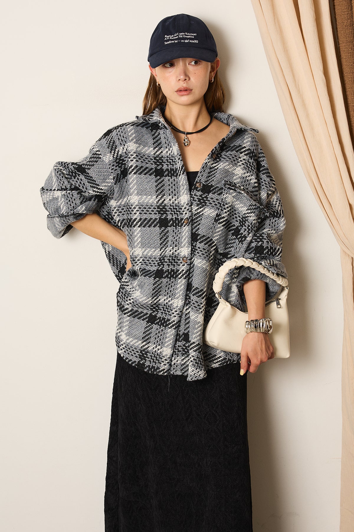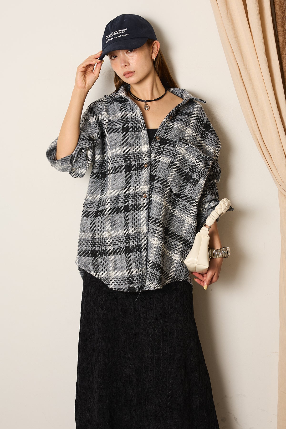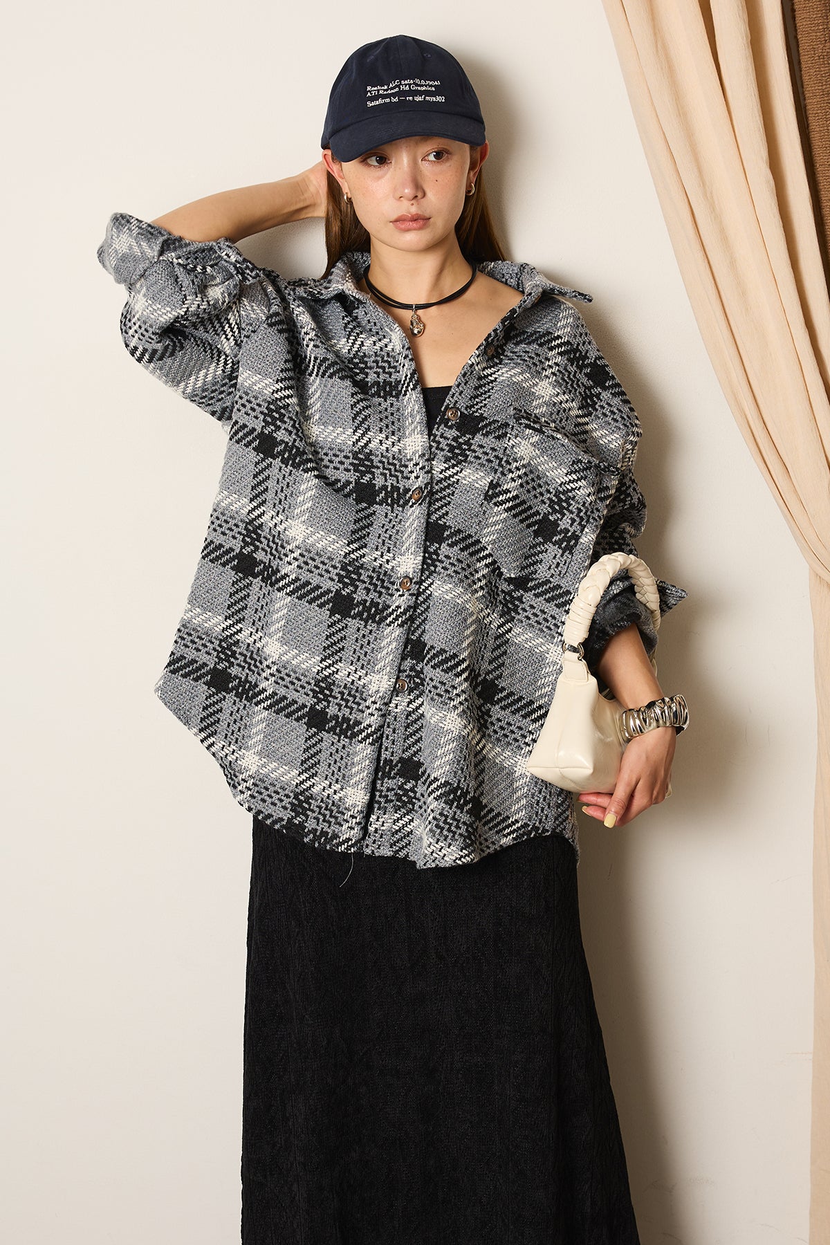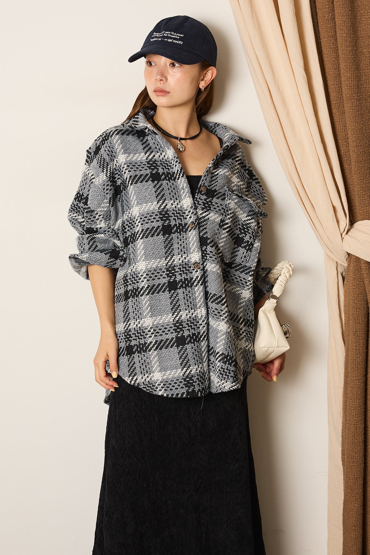 存在感のあるチェック柄が目を引くツイードジャケット。起毛感のある柔らかな風合いで、シーズンらしい温もりをプラスします。ゆとりのあるシルエットに大きめのポケットをあしらい、実用性とデザイン性を兼ね備えた一枚。羽織るだけでコーディネートが華やぐアイテムです。