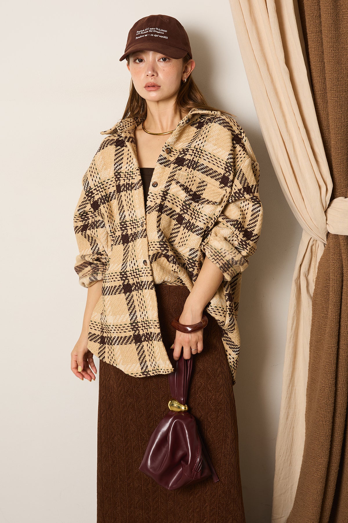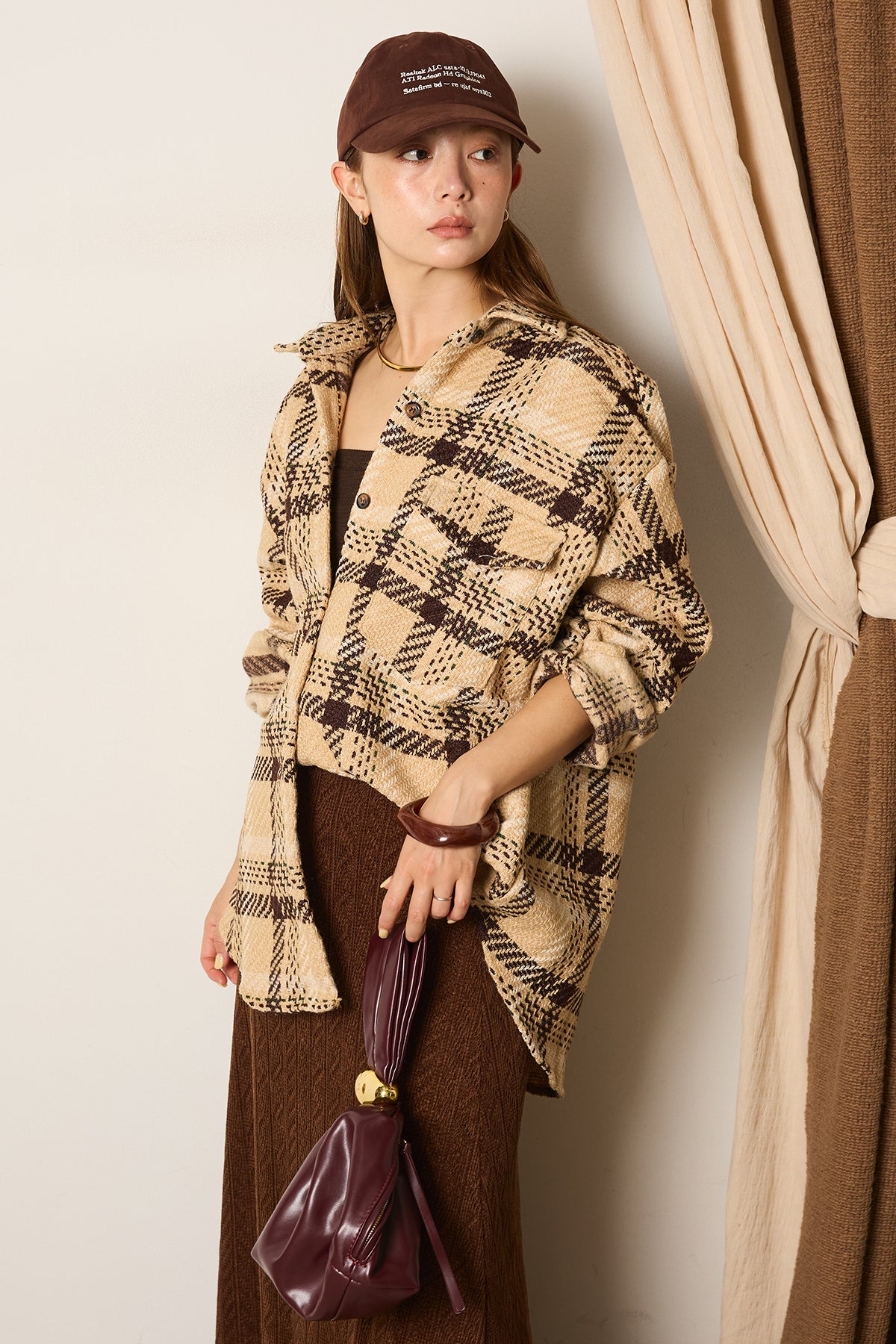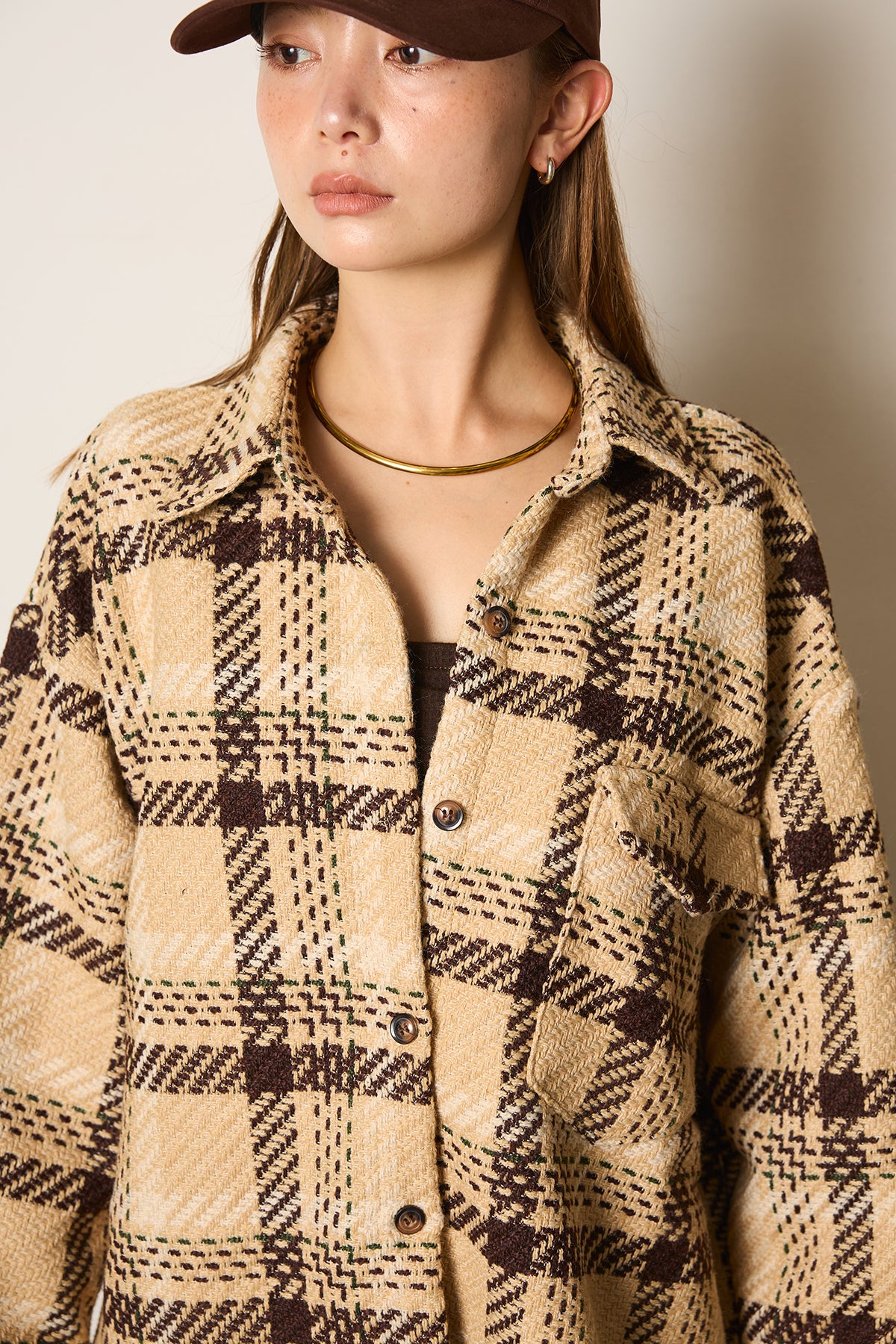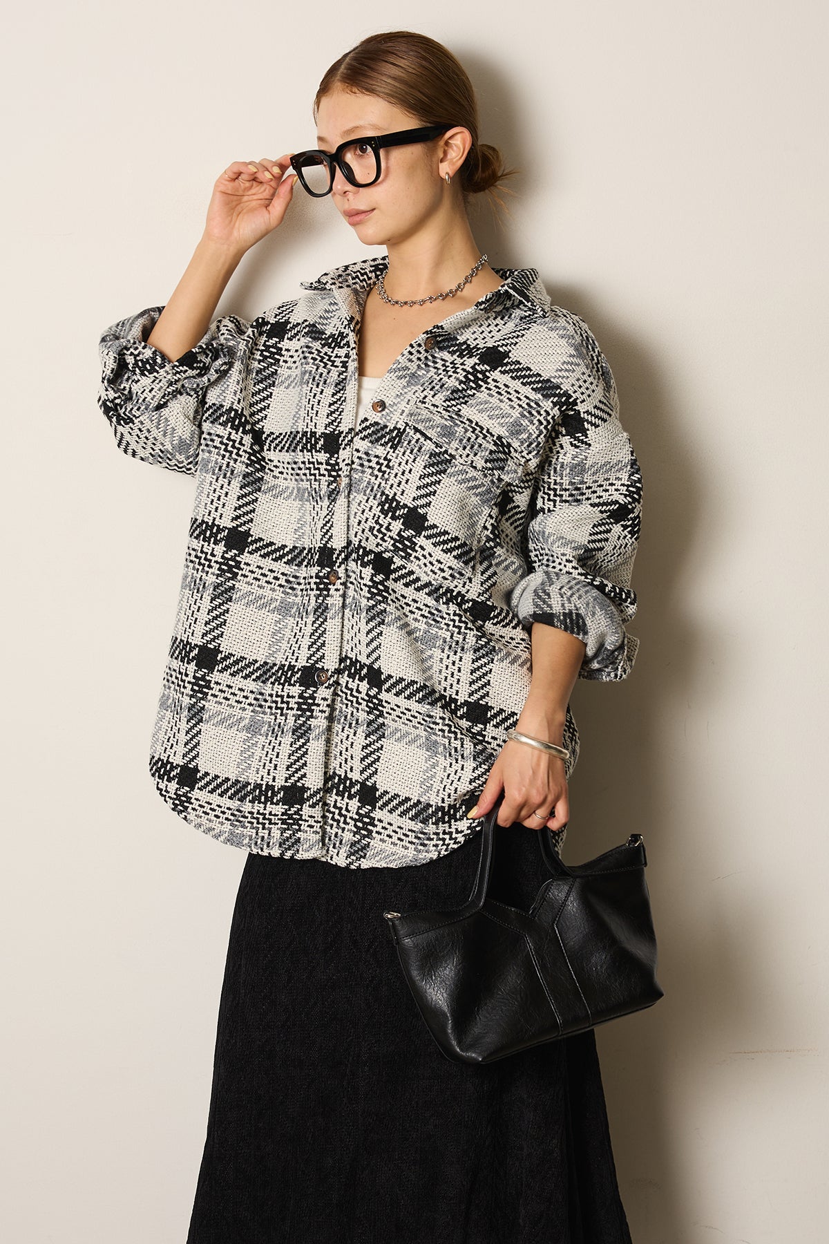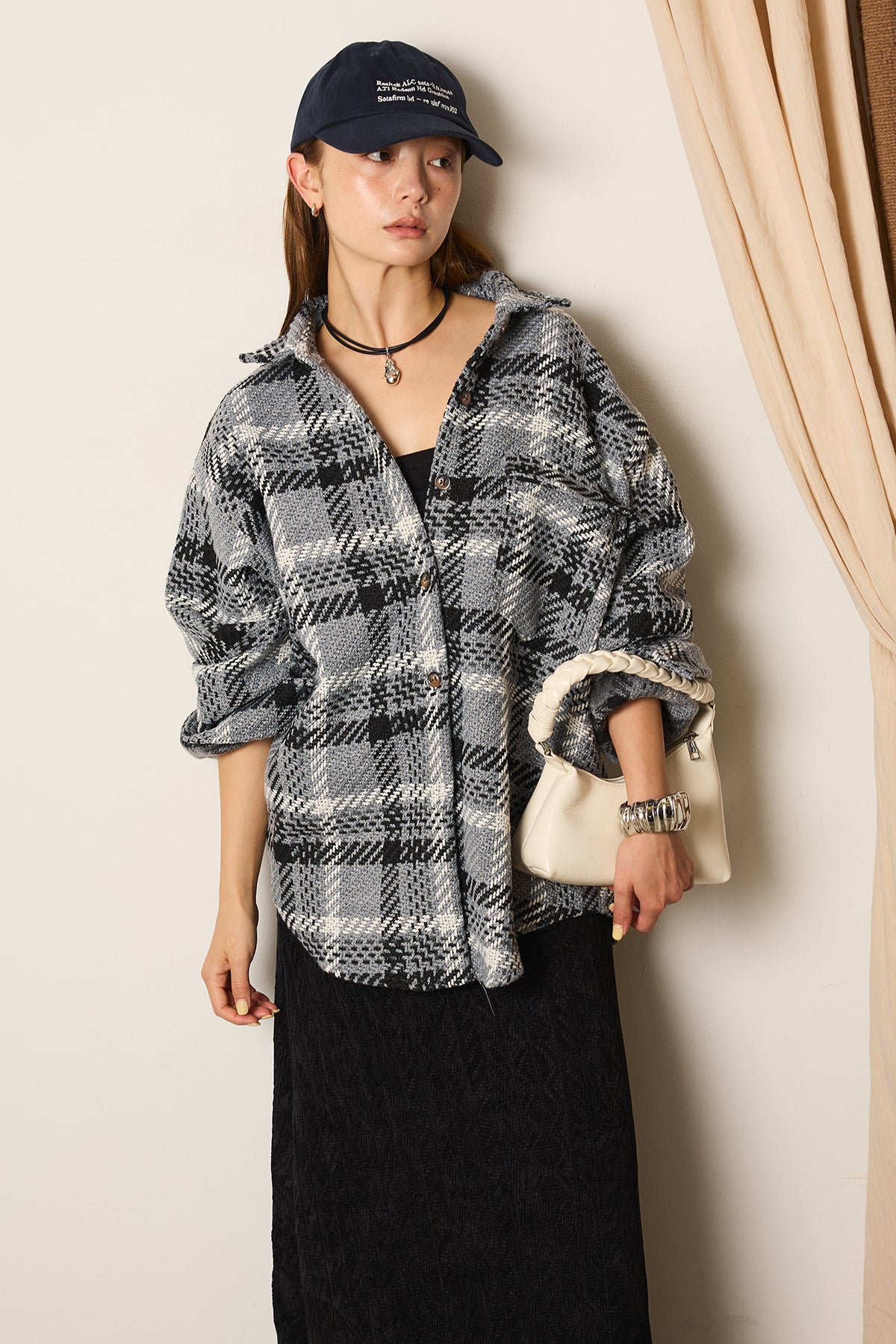 存在感のあるチェック柄が目を引くツイードジャケット。起毛感のある柔らかな風合いで、シーズンらしい温もりをプラスします。ゆとりのあるシルエットに大きめのポケットをあしらい、実用性とデザイン性を兼ね備えた一枚。羽織るだけでコーディネートが華やぐアイテムです。