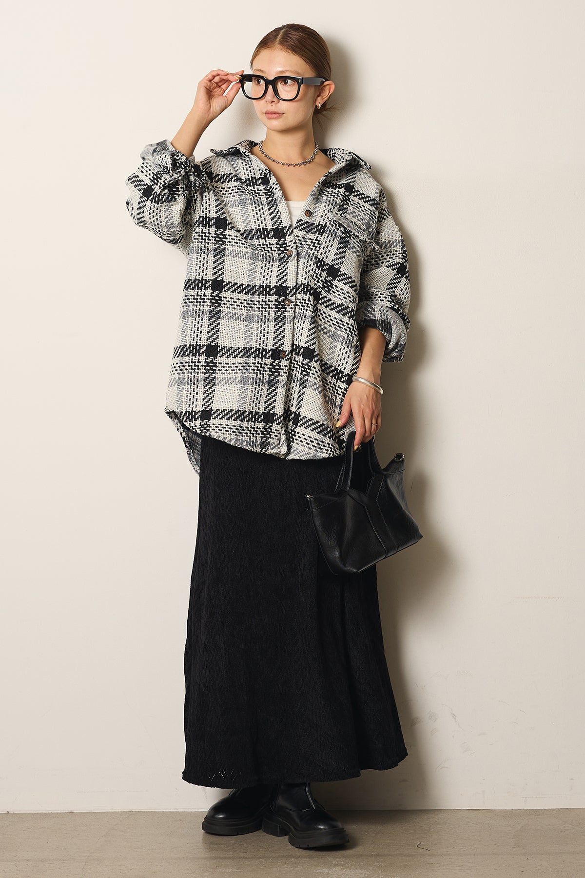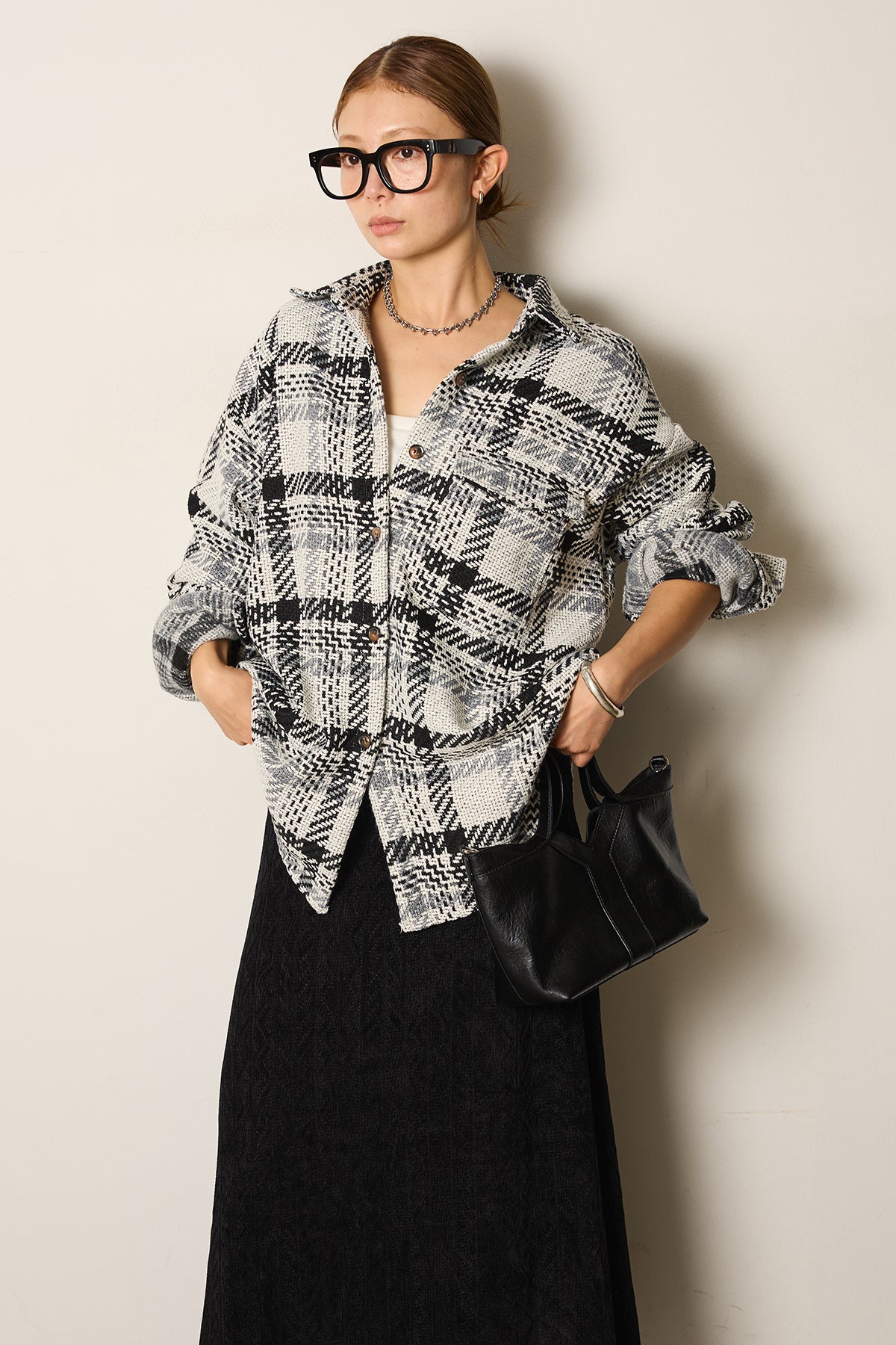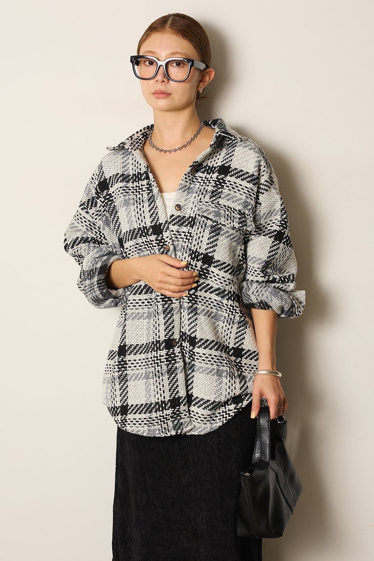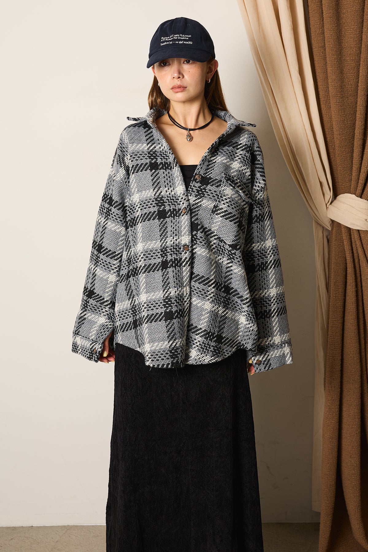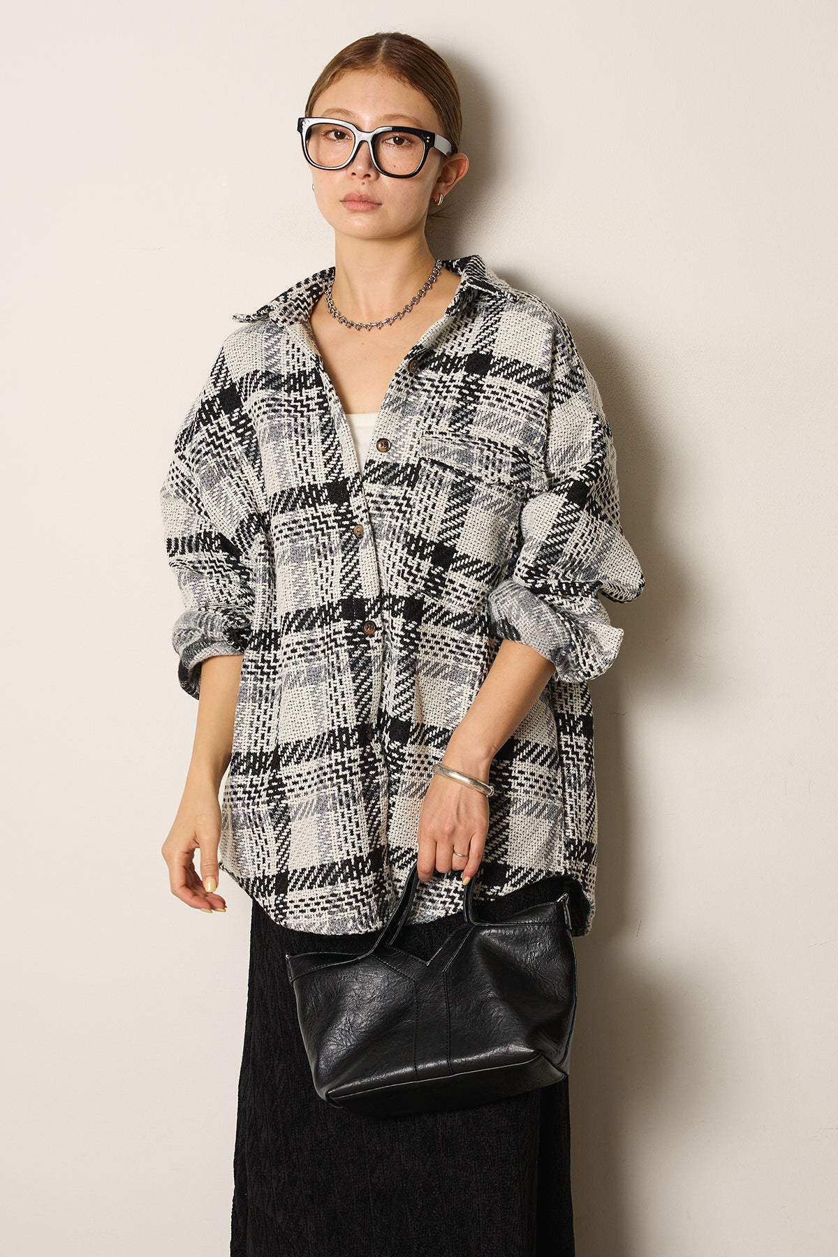 存在感のあるチェック柄が目を引くツイードジャケット。起毛感のある柔らかな風合いで、シーズンらしい温もりをプラスします。ゆとりのあるシルエットに大きめのポケットをあしらい、実用性とデザイン性を兼ね備えた一枚。羽織るだけでコーディネートが華やぐアイテムです。