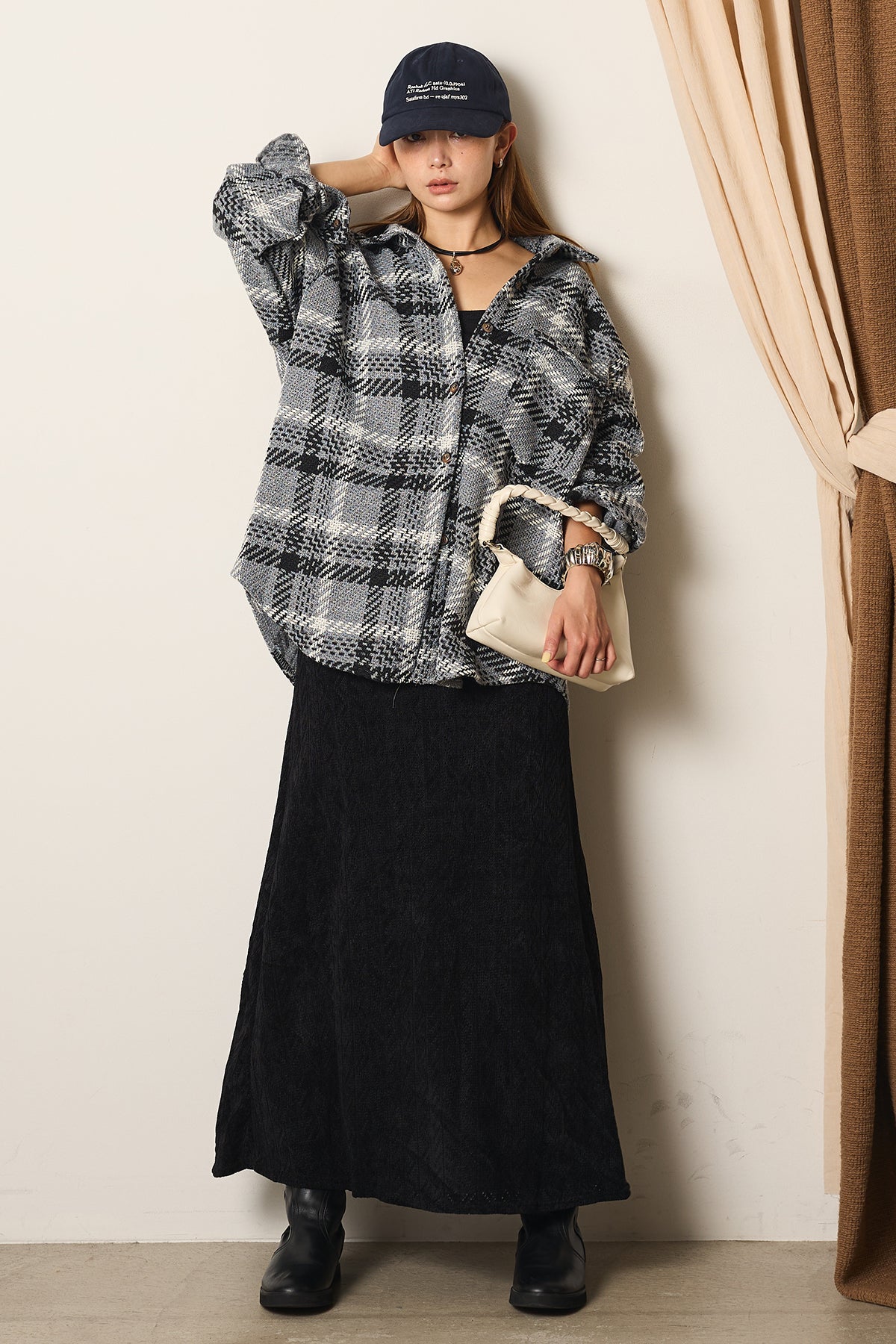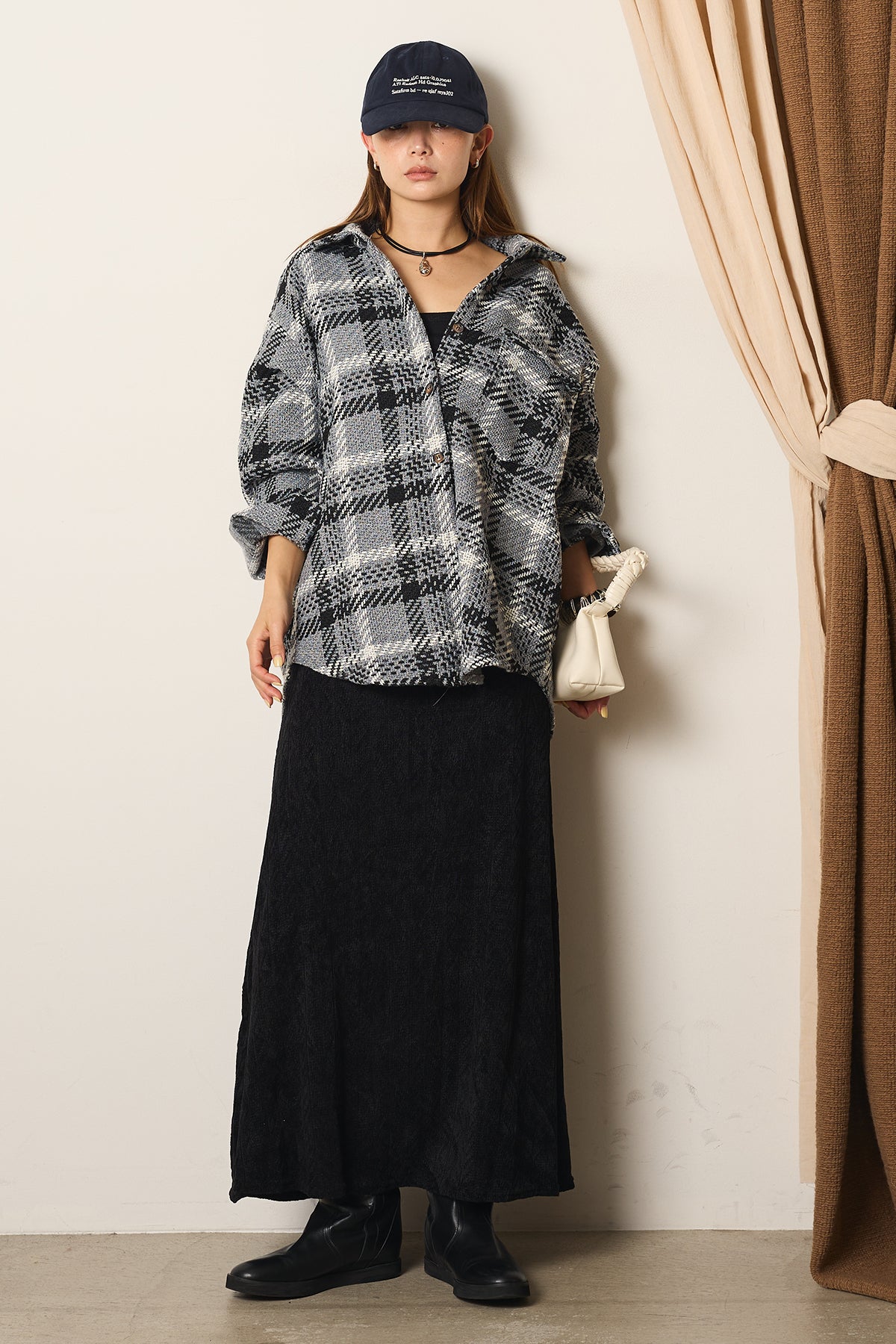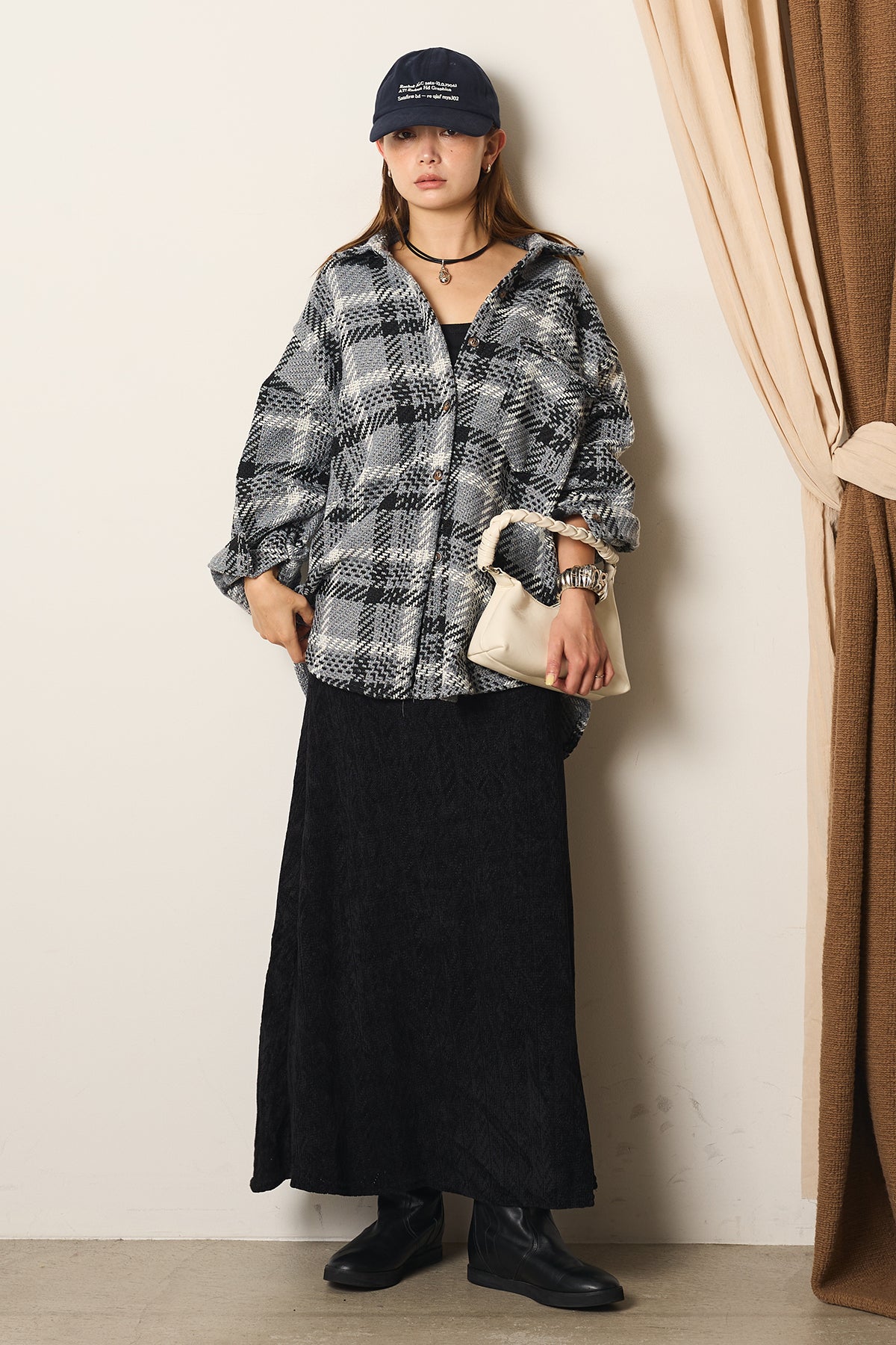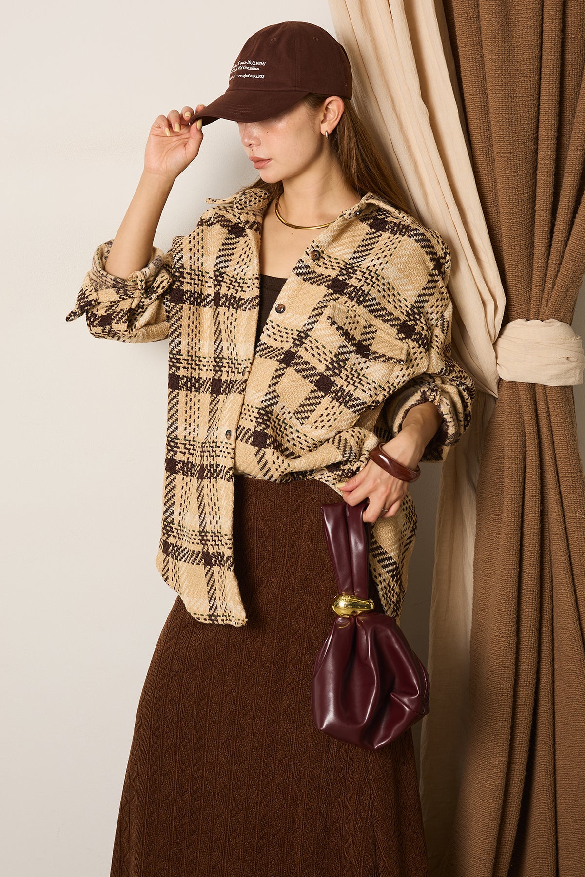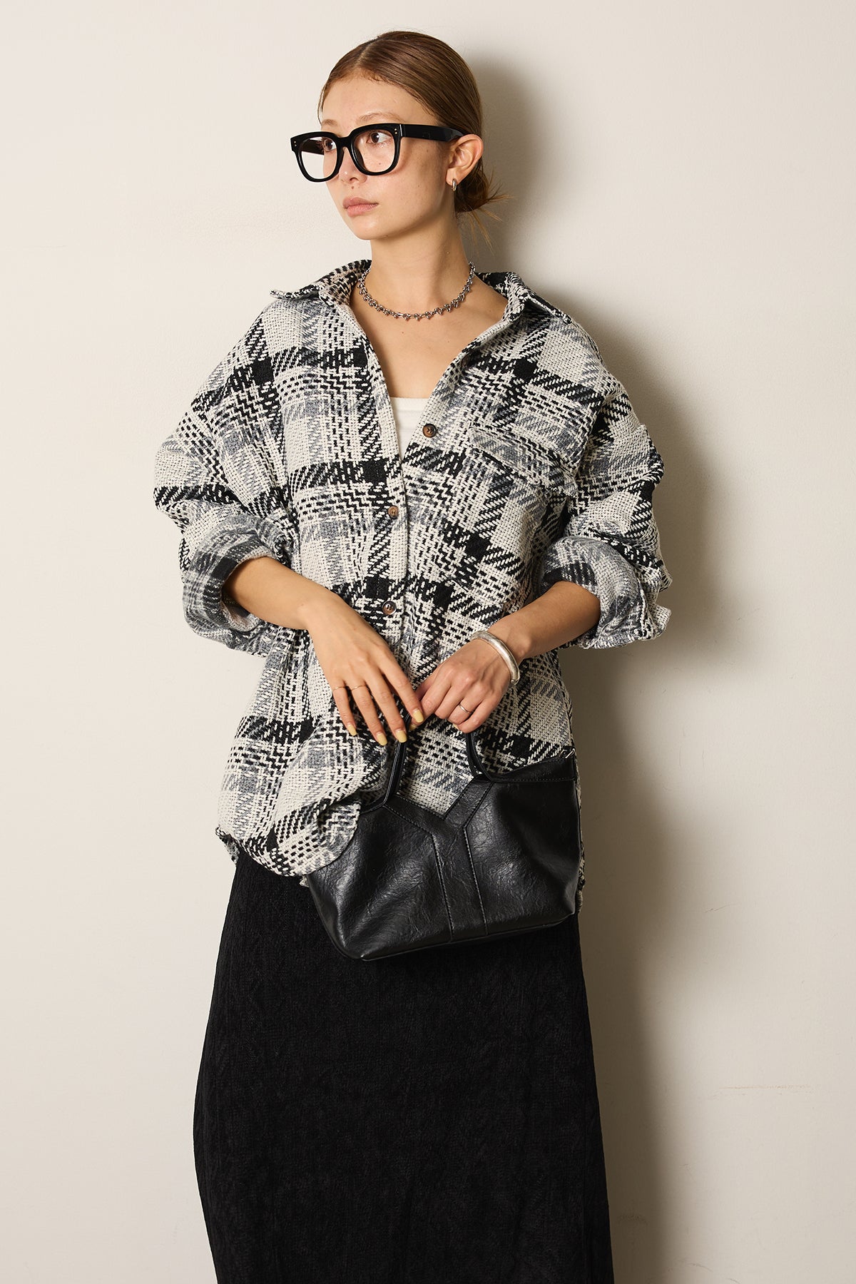 存在感のあるチェック柄が目を引くツイードジャケット。起毛感のある柔らかな風合いで、シーズンらしい温もりをプラスします。ゆとりのあるシルエットに大きめのポケットをあしらい、実用性とデザイン性を兼ね備えた一枚。羽織るだけでコーディネートが華やぐアイテムです。
