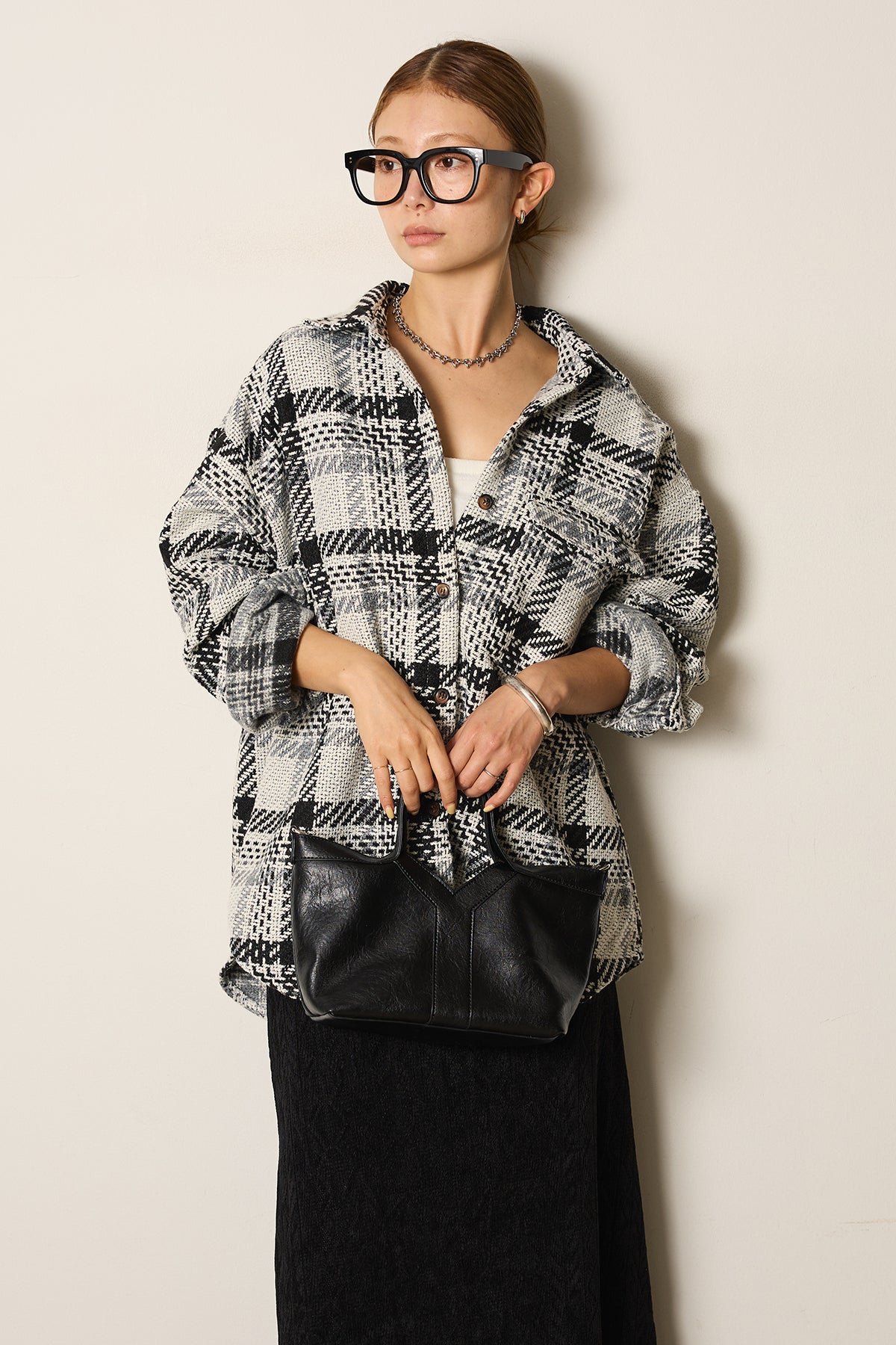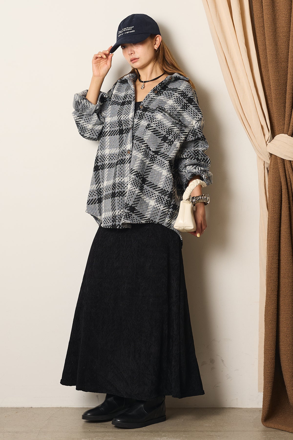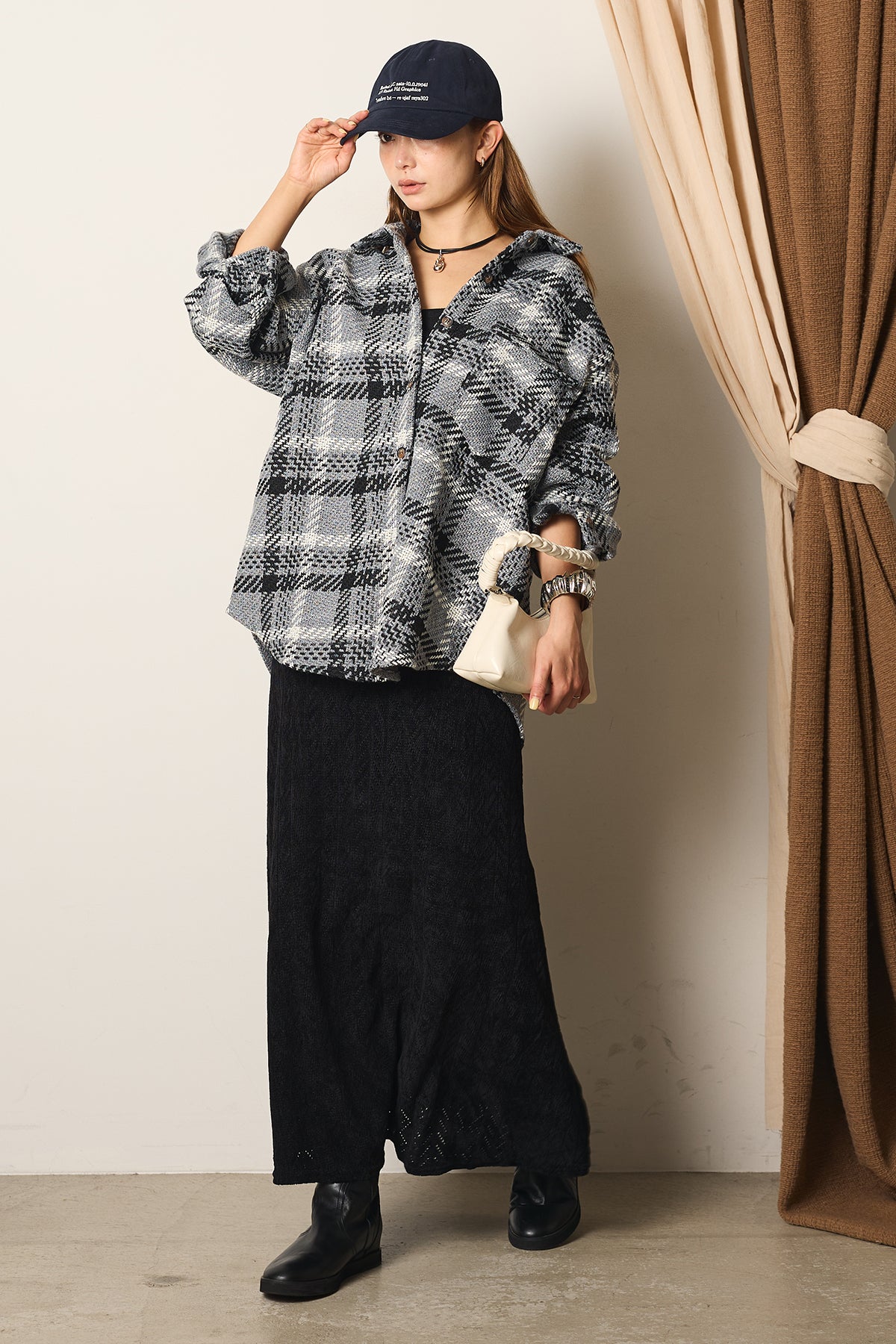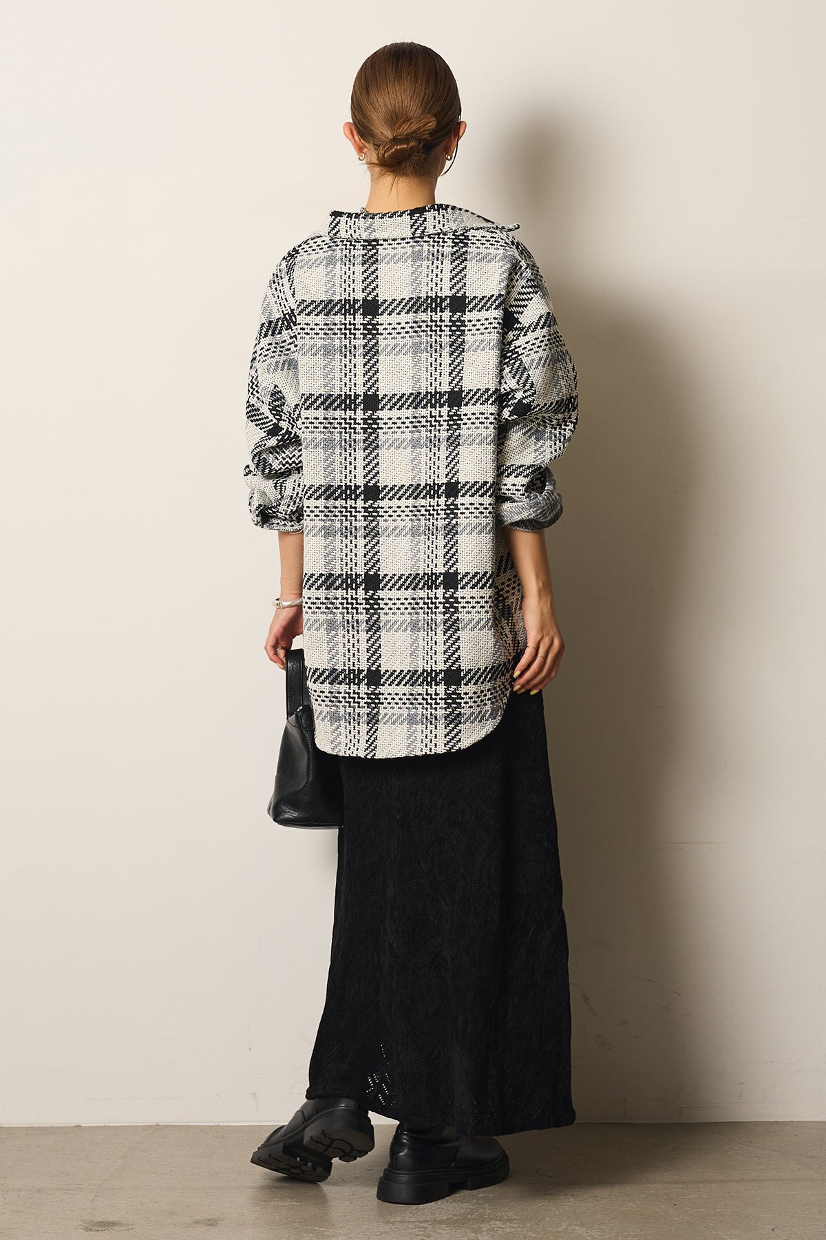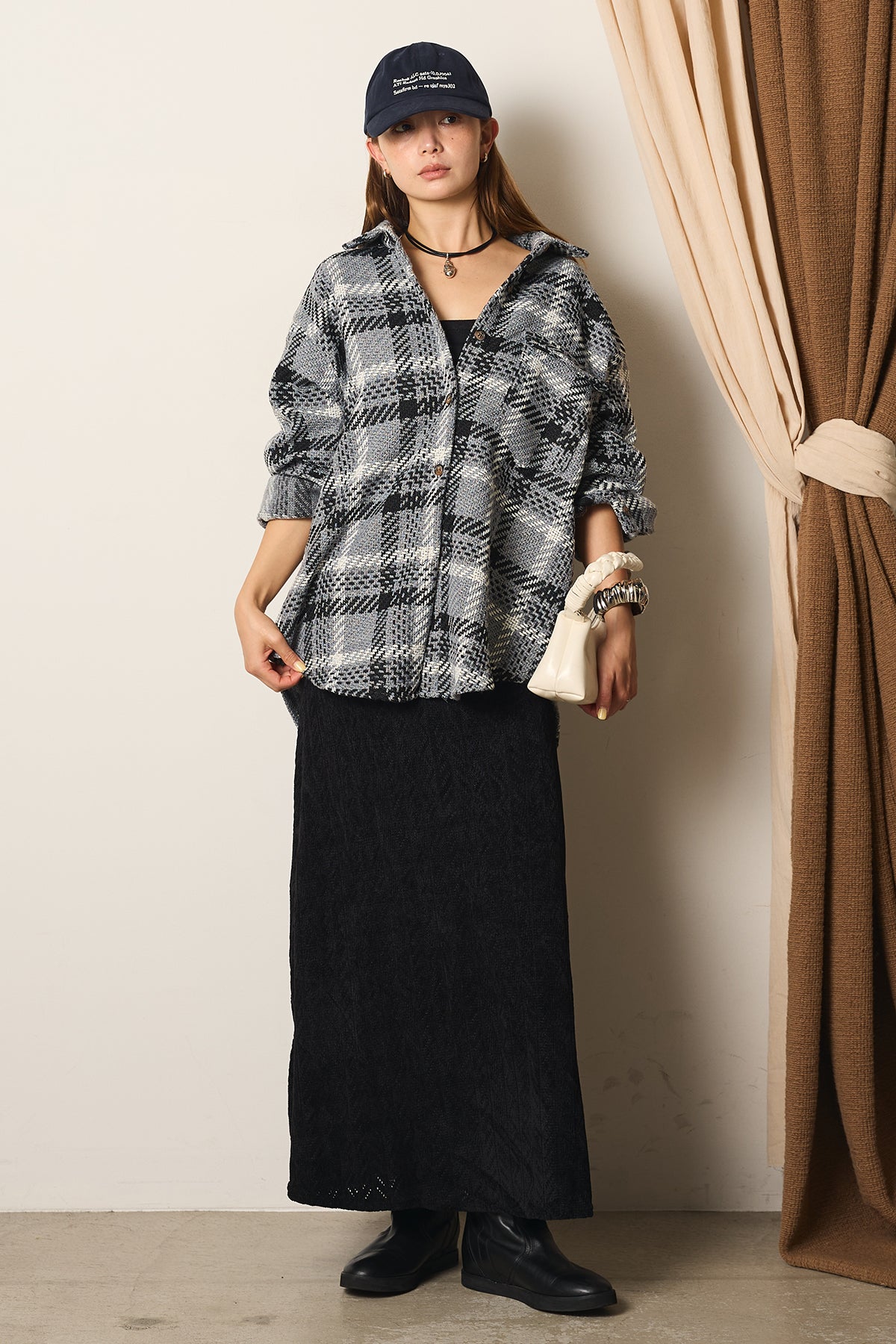 存在感のあるチェック柄が目を引くツイードジャケット。起毛感のある柔らかな風合いで、シーズンらしい温もりをプラスします。ゆとりのあるシルエットに大きめのポケットをあしらい、実用性とデザイン性を兼ね備えた一枚。羽織るだけでコーディネートが華やぐアイテムです。